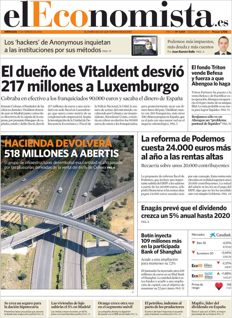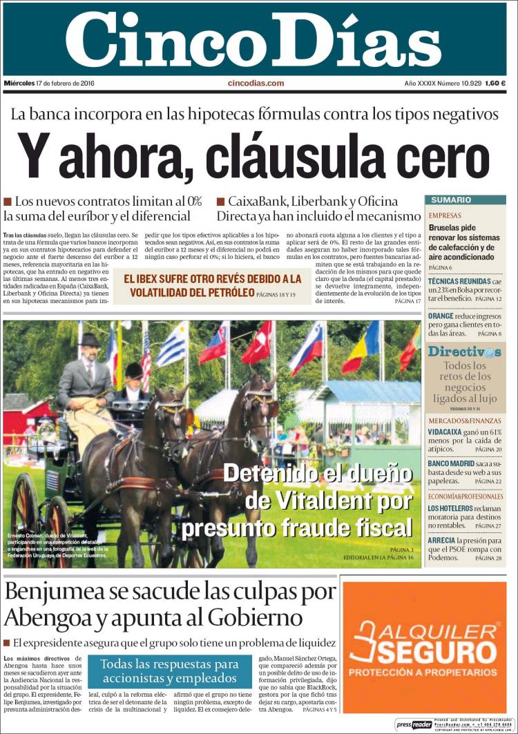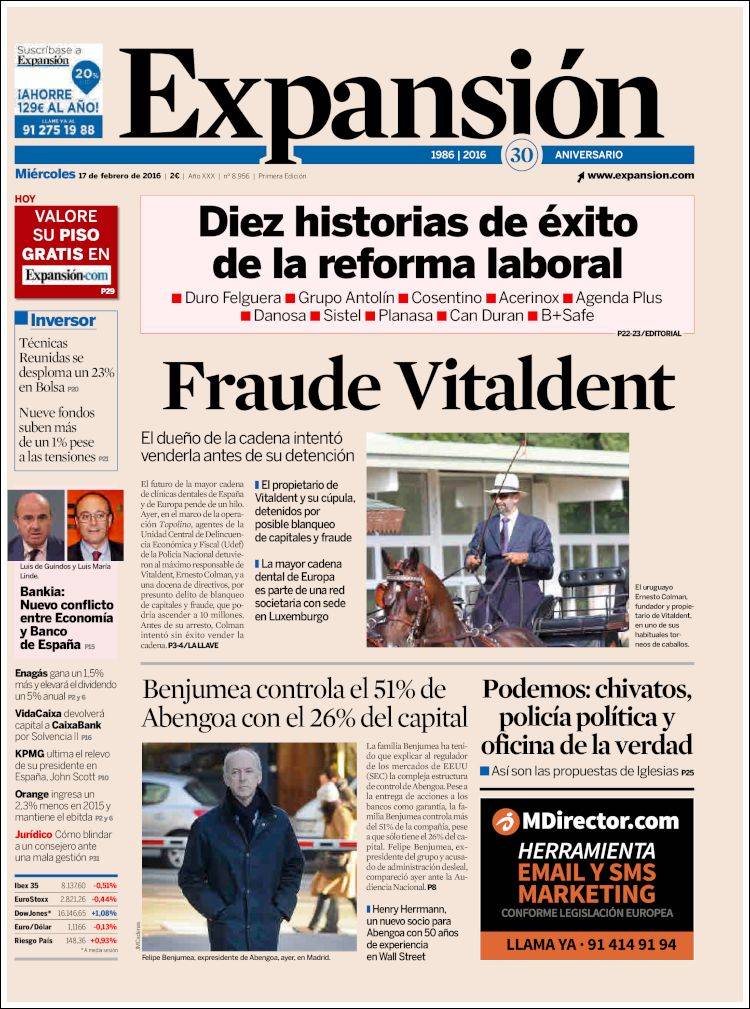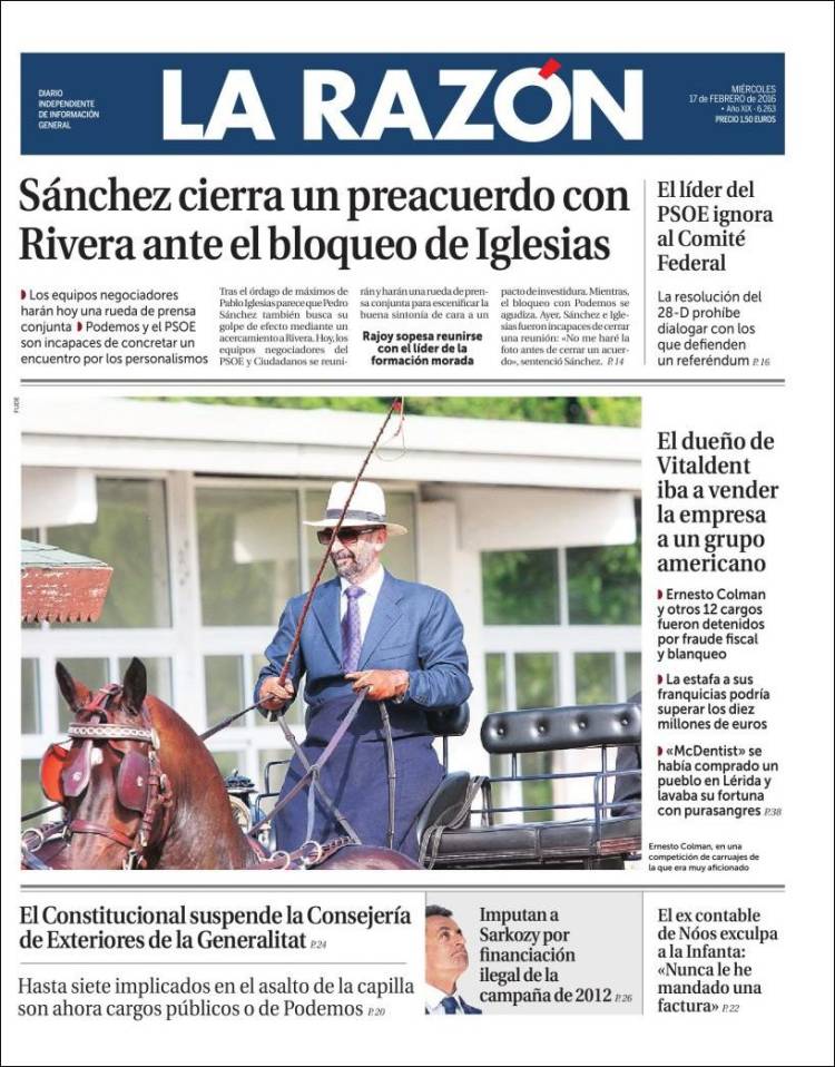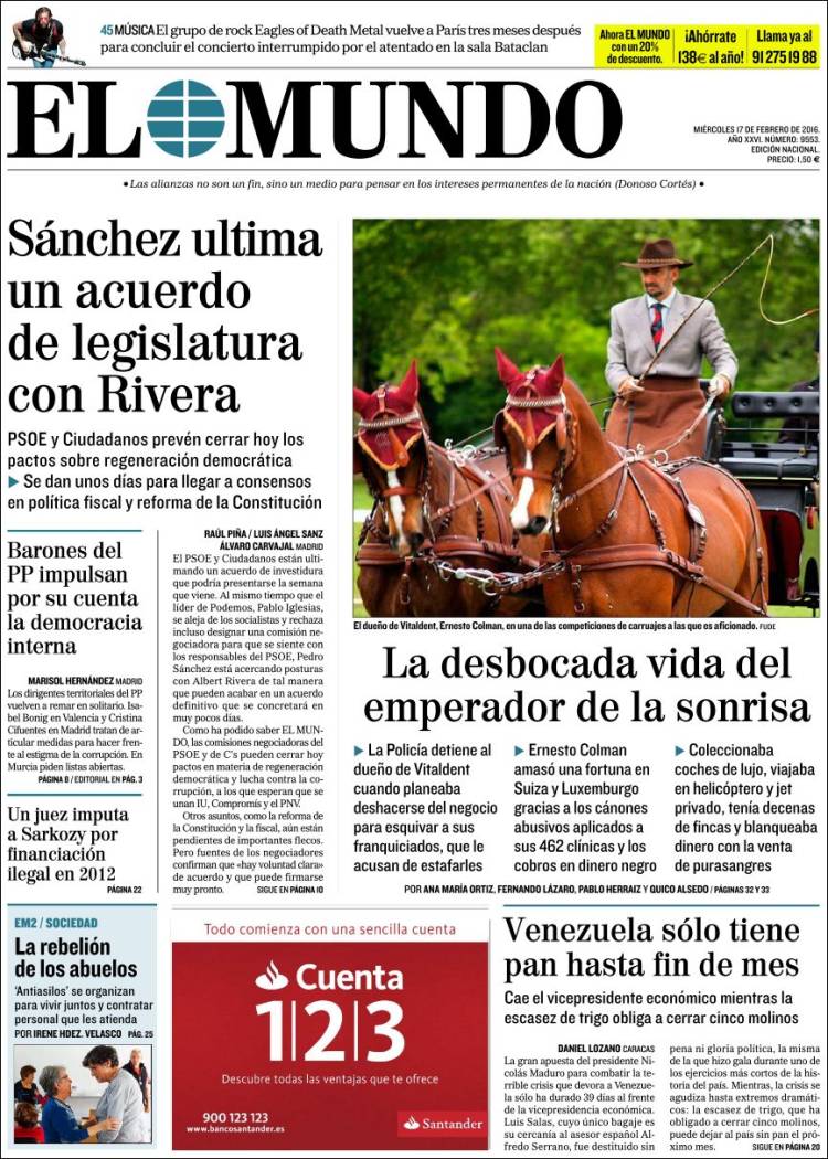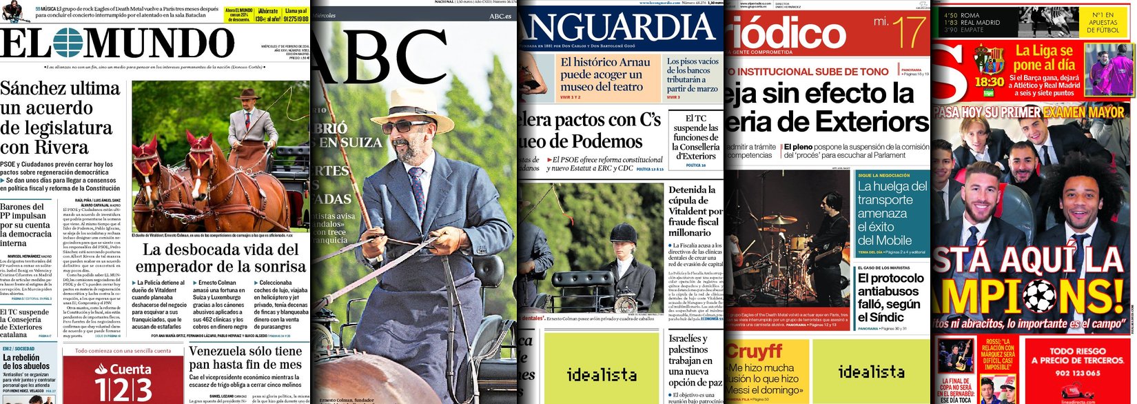 Portadas de los diarios El Mundo, El País, ABC, La Razón, La Vanguardia, El Periódico, Cinco Días, El Economista, Expansión, Marca, As, Mundo Deportivo y Sport.