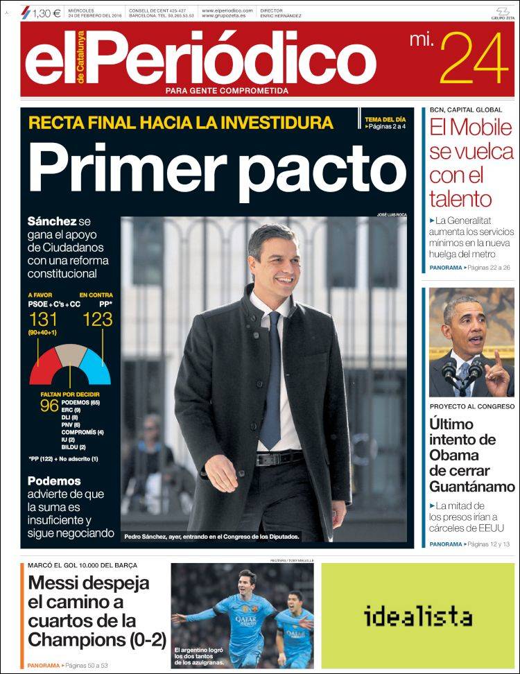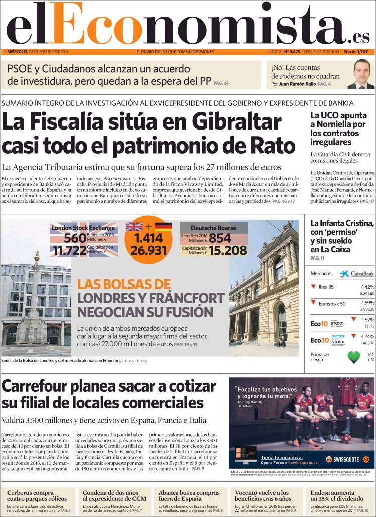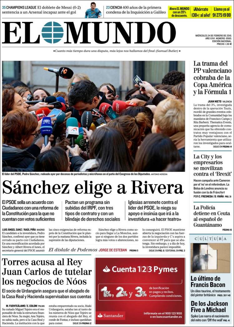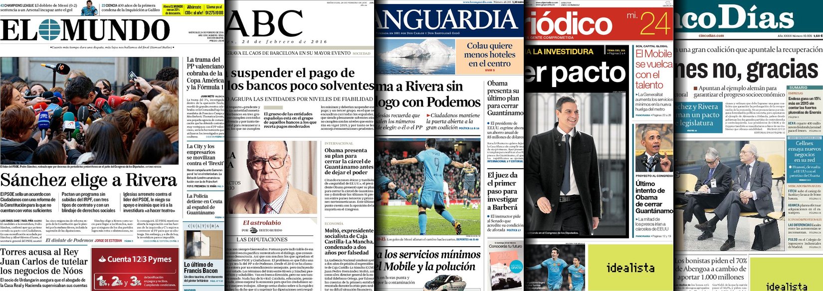 Portadas de los diarios El Mundo, El País, ABC, La Razón, La Vanguardia, El Periódico, Cinco Días, El Economista, Expansión, Marca, As, Mundo Deportivo y Sport.