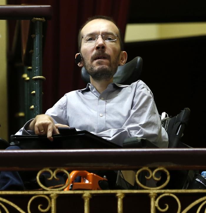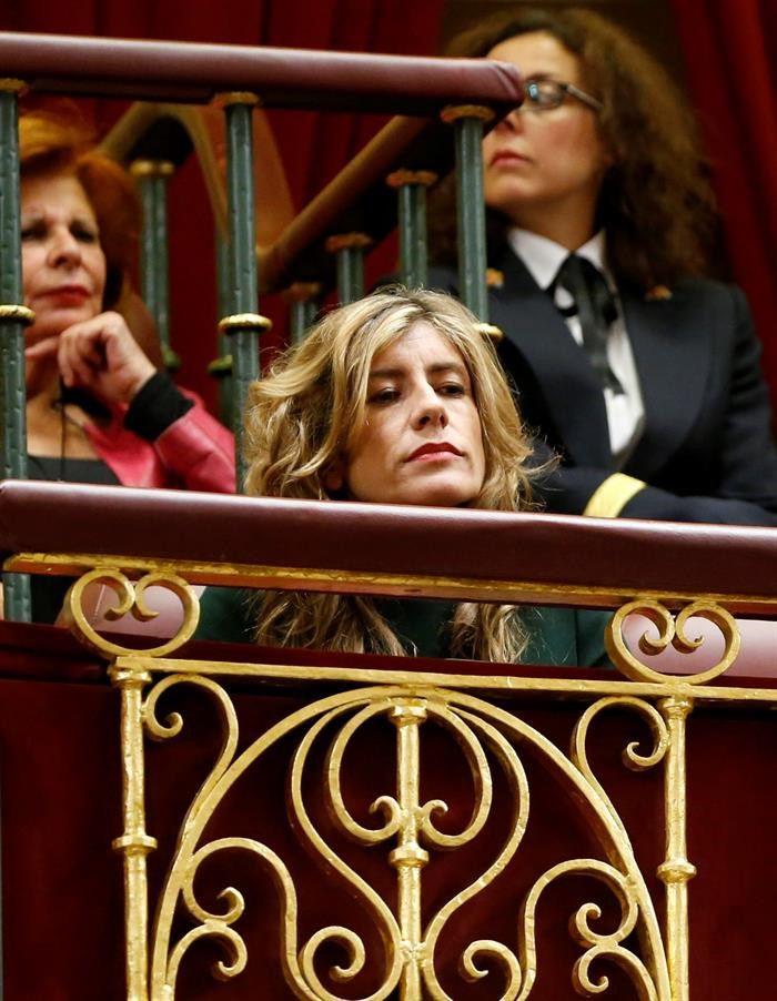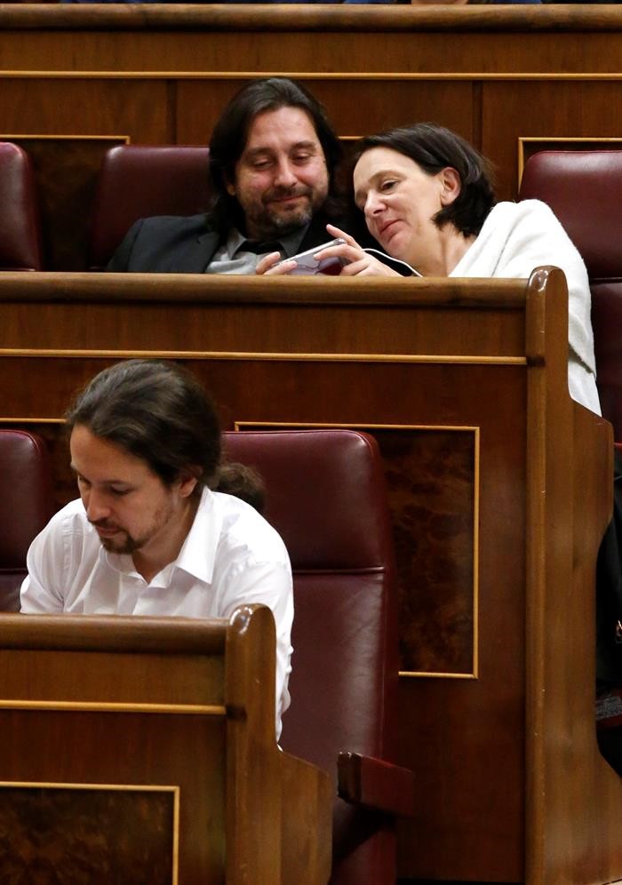 Esta vez, Carolina Bescansa acudió a la sesión parlamentaria sin su hijo. Seguramente en la imagen le estaba enseñando alguna foto a su compañero de escaño.