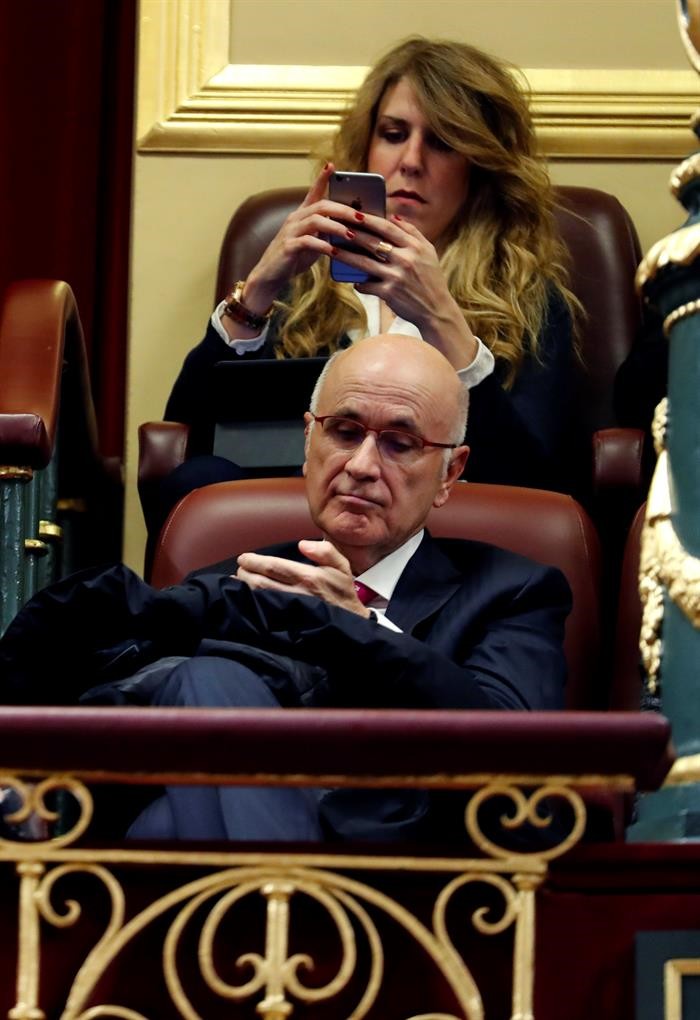 La socialista Amparo Rubiales se mira atentamente la mano izquierda mientras Toxo y Méndez no pierden de vista... el móvil. La imagen fue captada por las cámaras de RTVE y rápidamente empezó a circular por las bancadas del Congreso y las redes sociales.