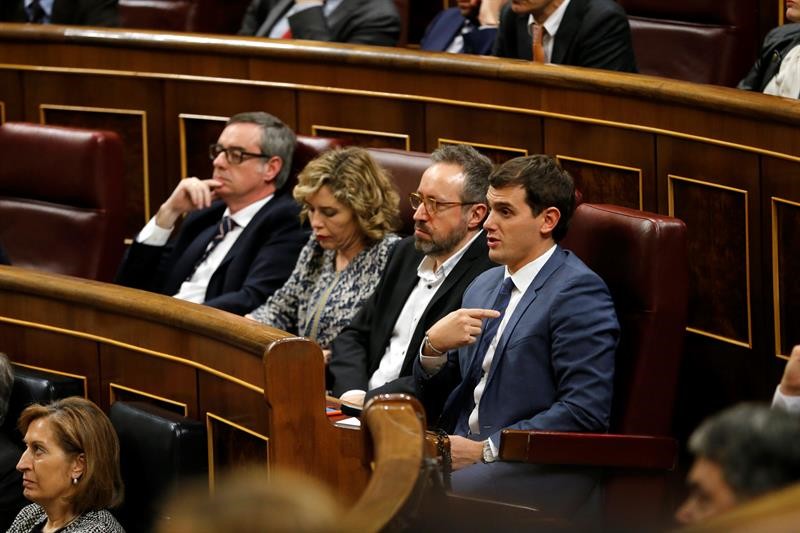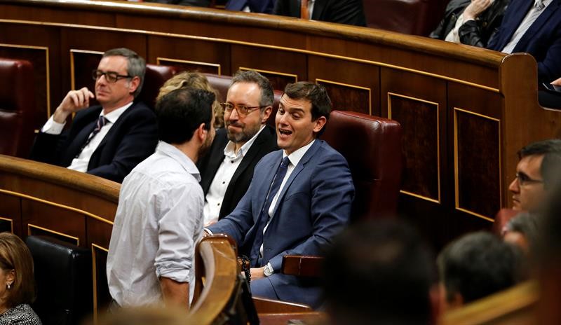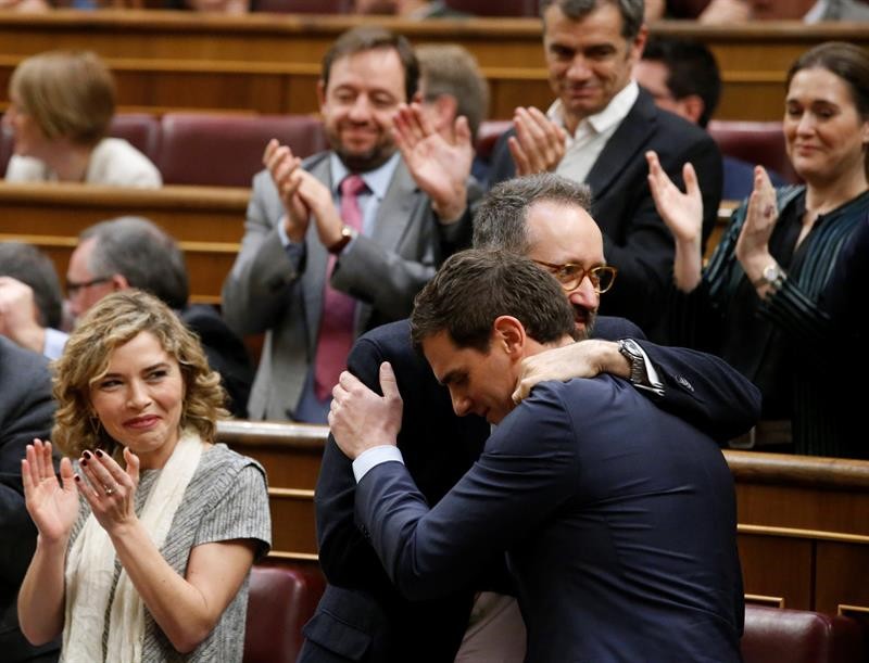 El presidente de Ciudadanos, Albert Rivera, es felicitado por el diputado de su formación Juan Carlos Girauta, tras su discurso, en presencia de la diputada de Ciudadanos Marta Mretín