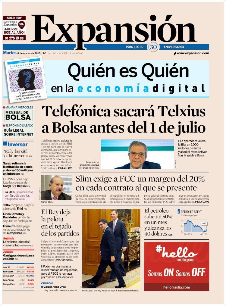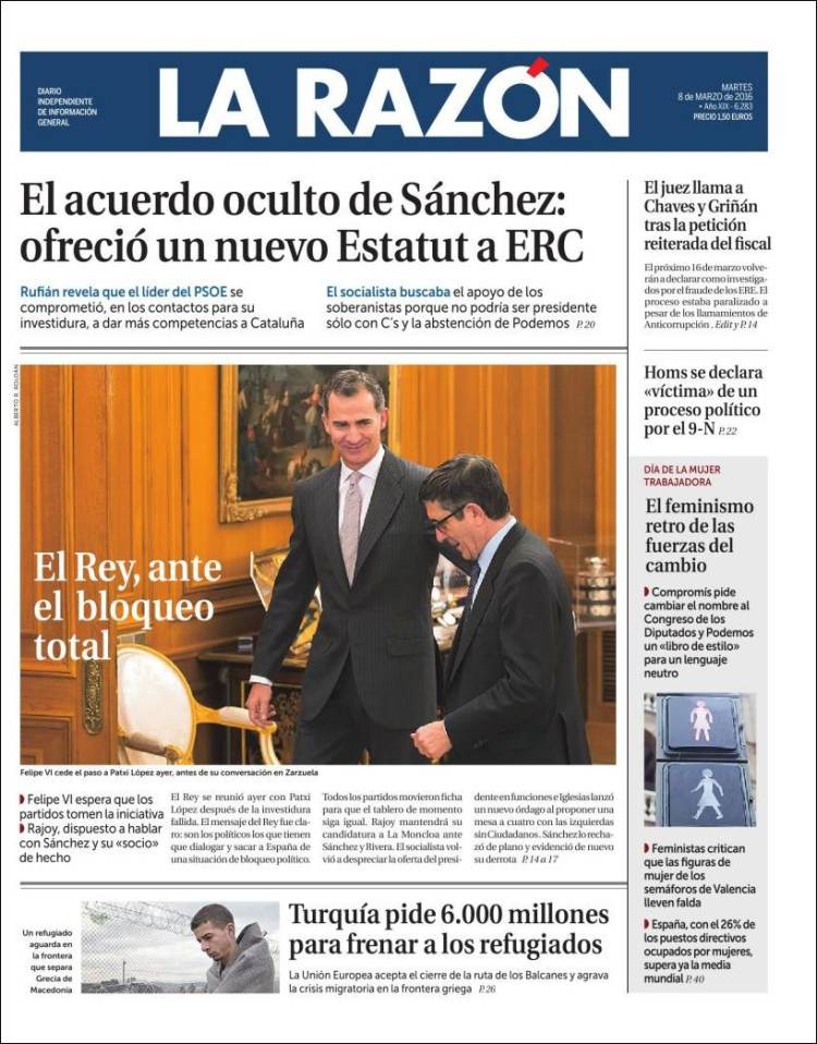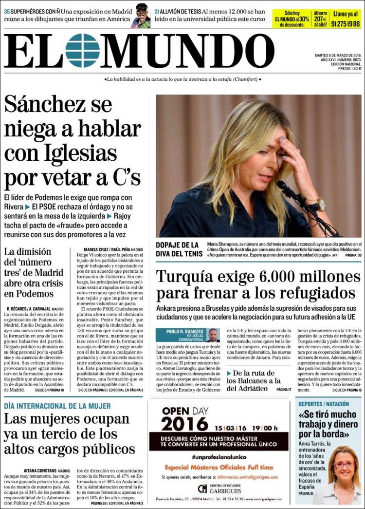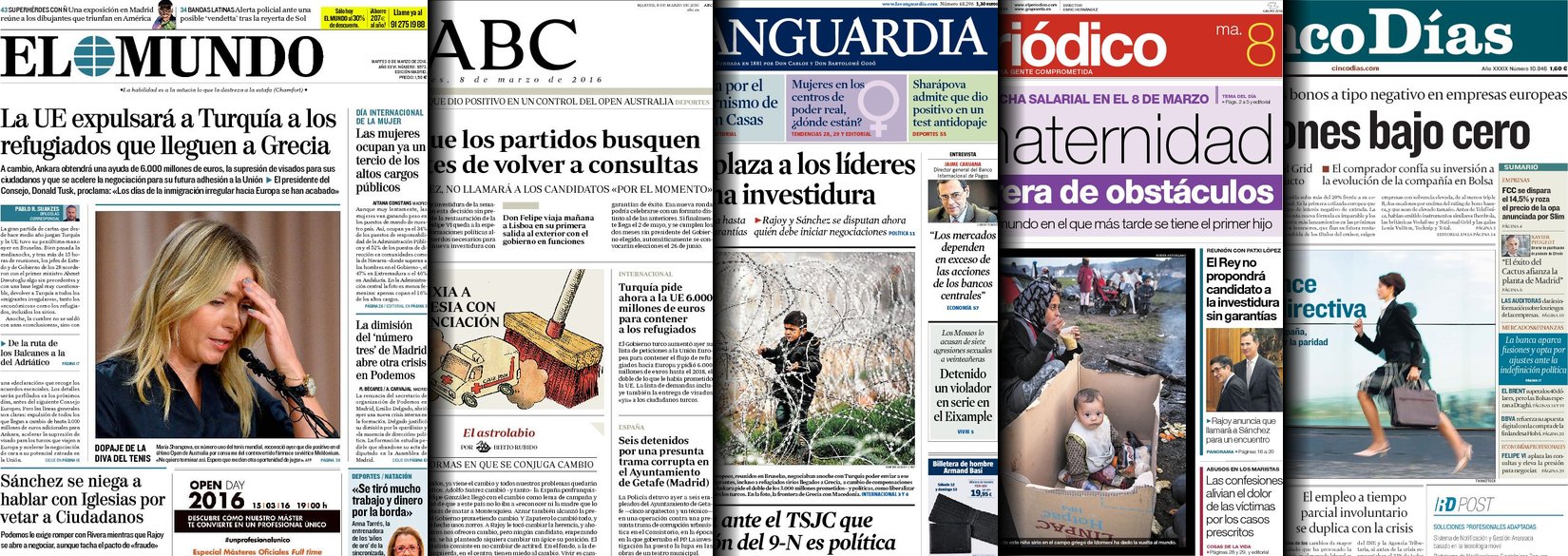 Portadas de los diarios El Mundo, El País, ABC, La Razón, La Vanguardia, El Periódico, Cinco Días, El Economista, Expansión, Marca, As, Mundo Deportivo y Sport.