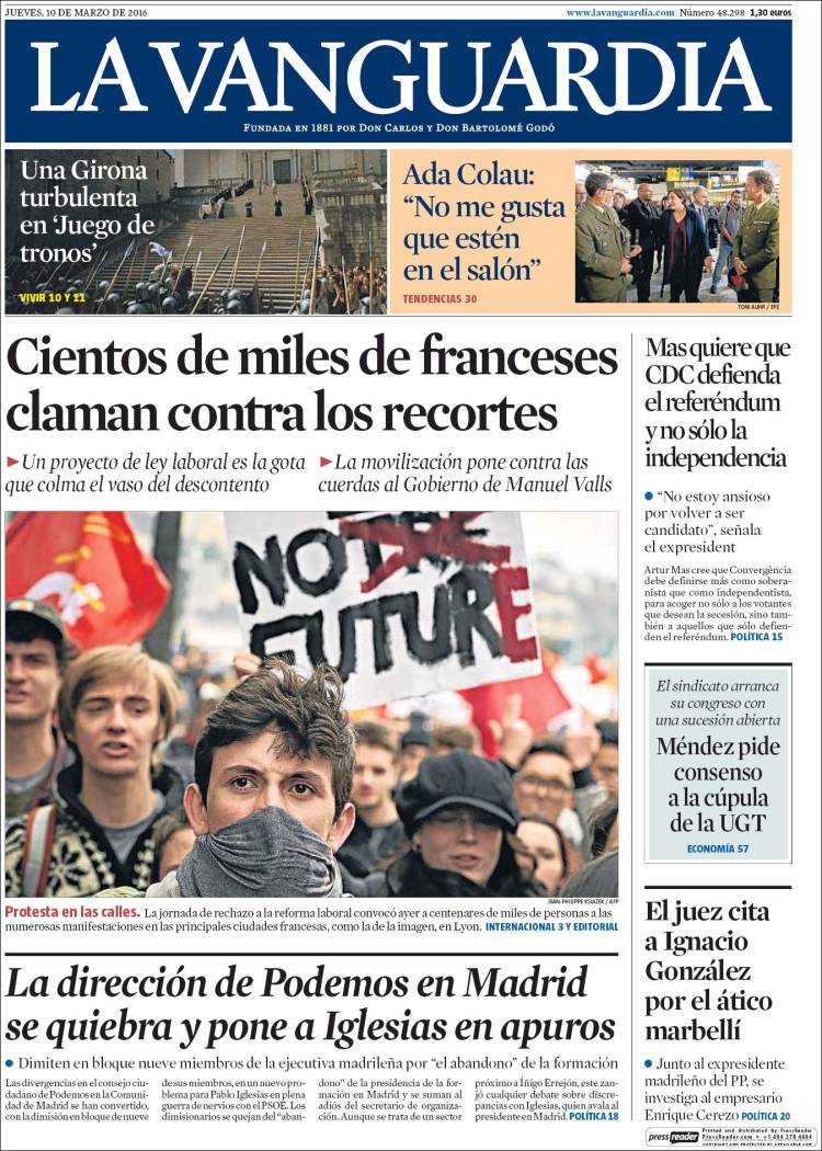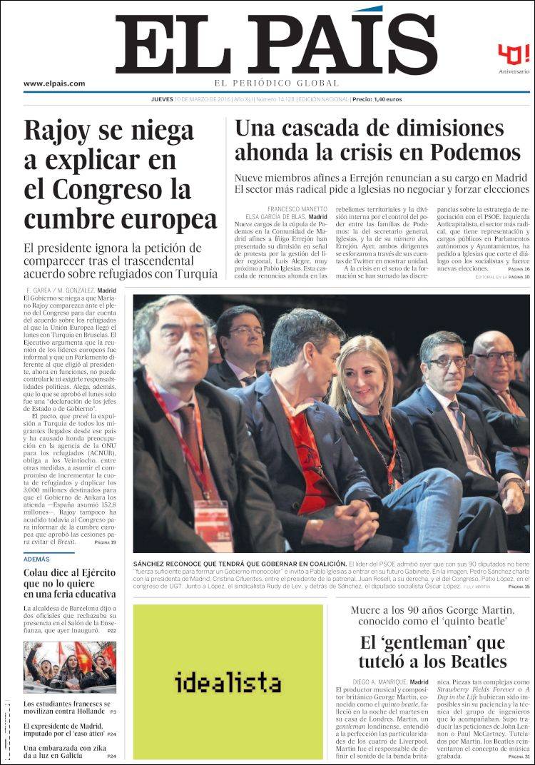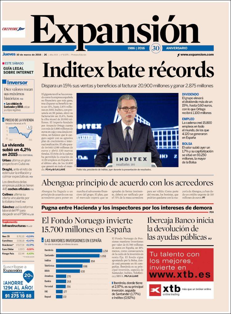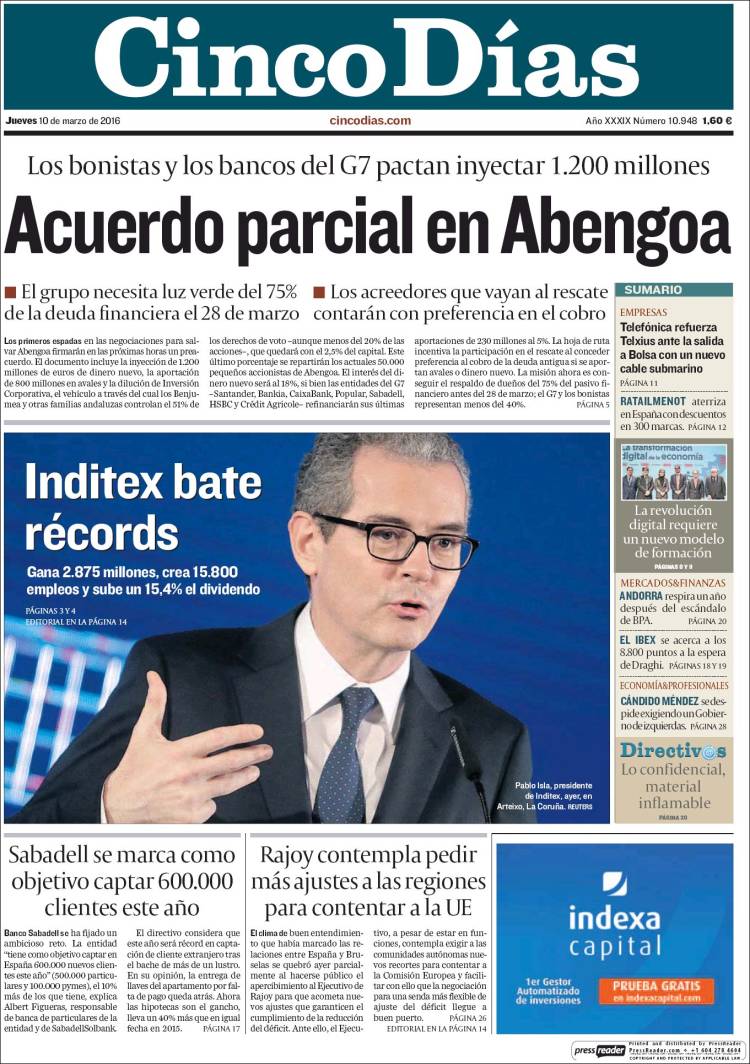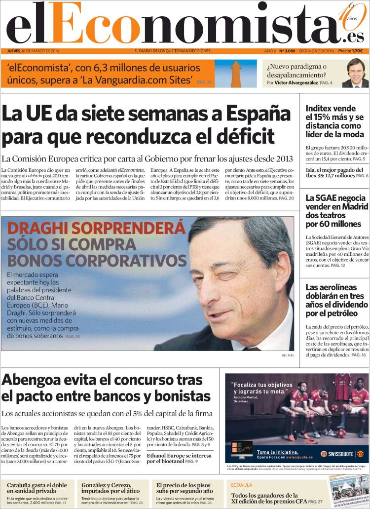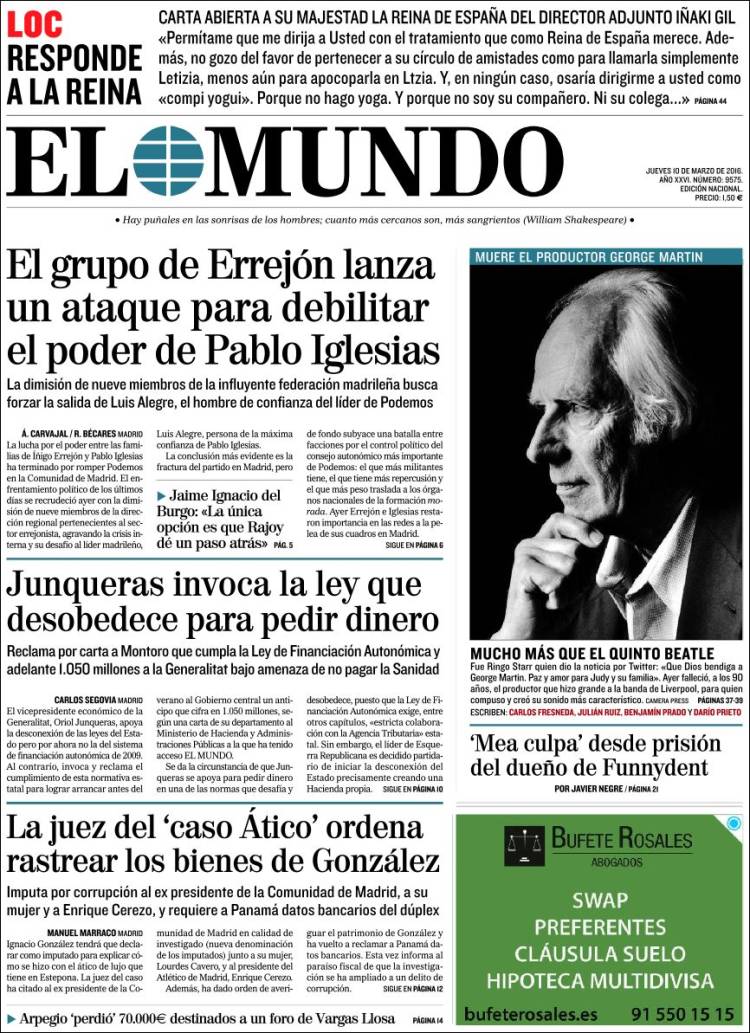 Portadas de los diarios El Mundo, El País, ABC, La Razón, La Vanguardia, El Periódico, Cinco Días, El Economista, Expansión, Marca, As, Mundo Deportivo y Sport.