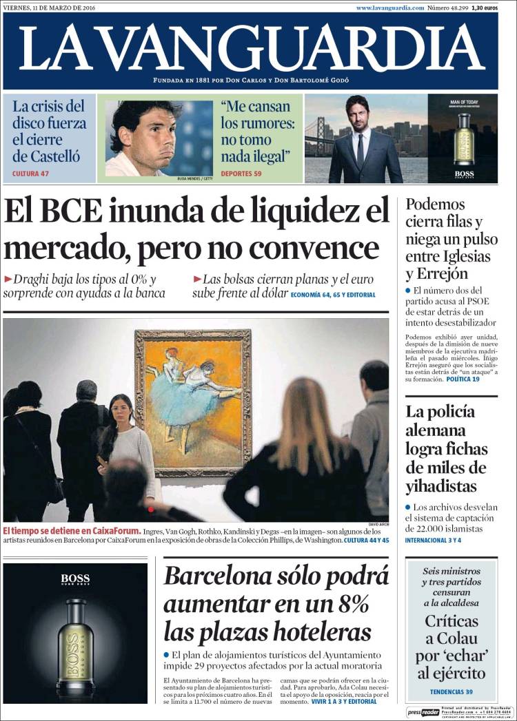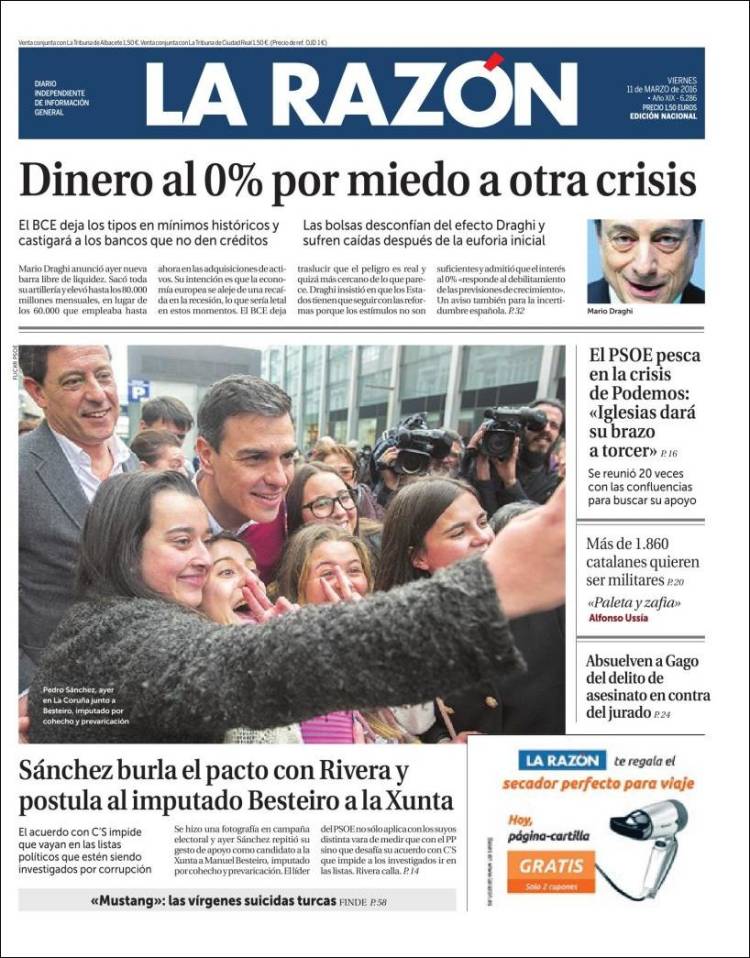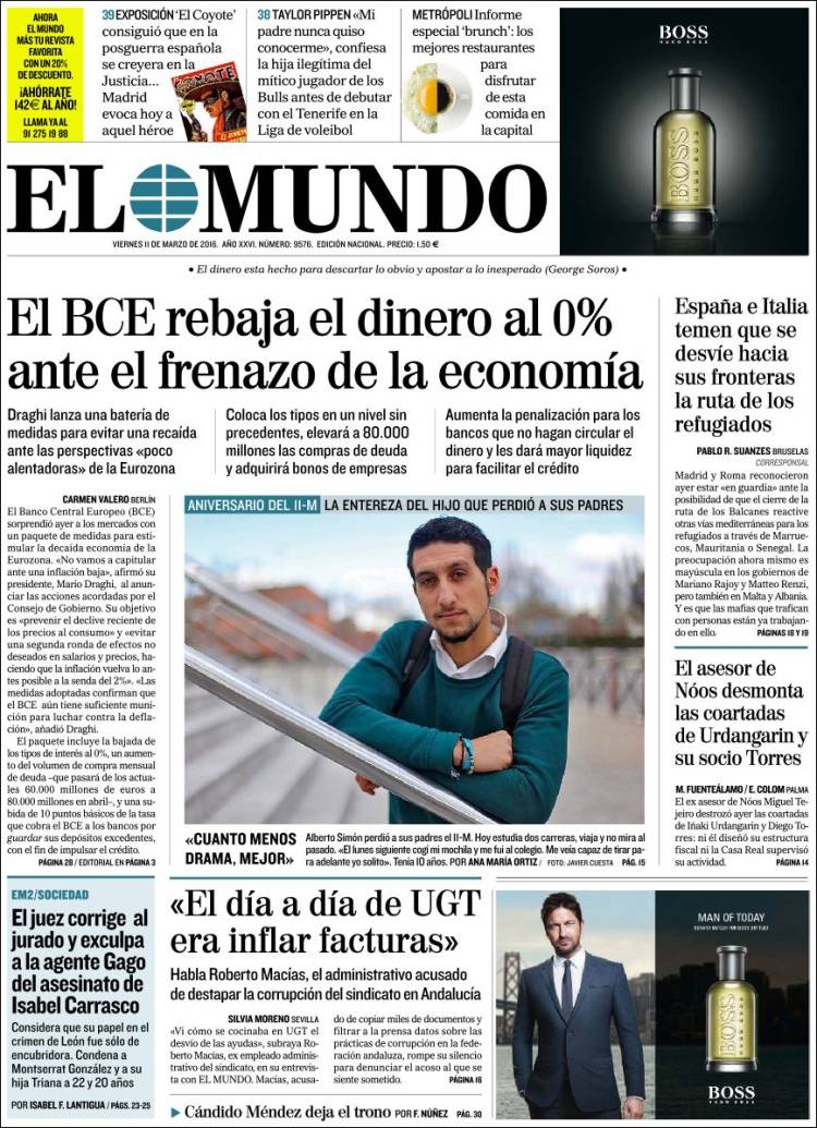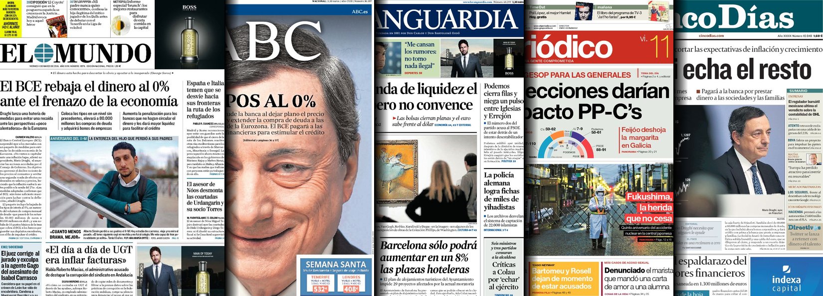 Portadas de los diarios El Mundo, El País, ABC, La Razón, La Vanguardia, El Periódico, Cinco Días, El Economista, Expansión, Marca, As, Mundo Deportivo y Sport.