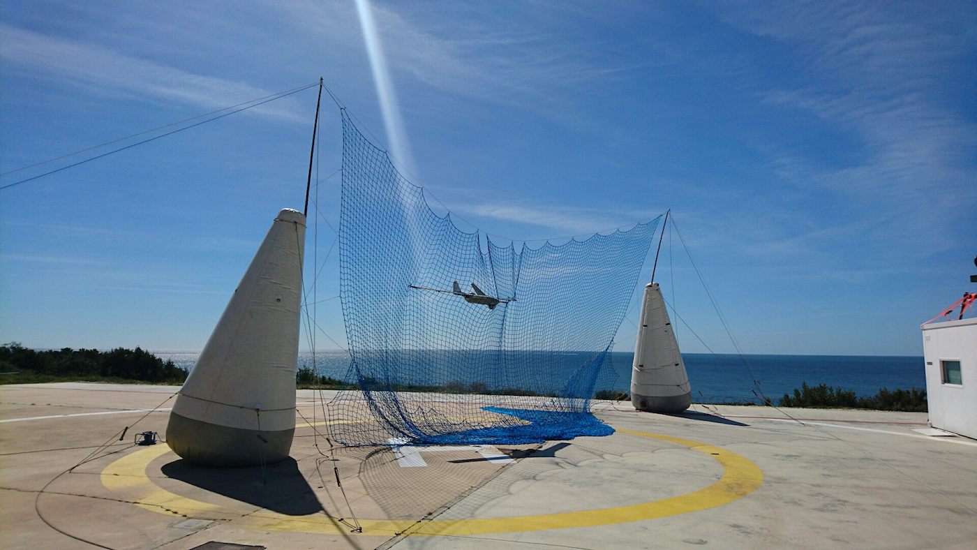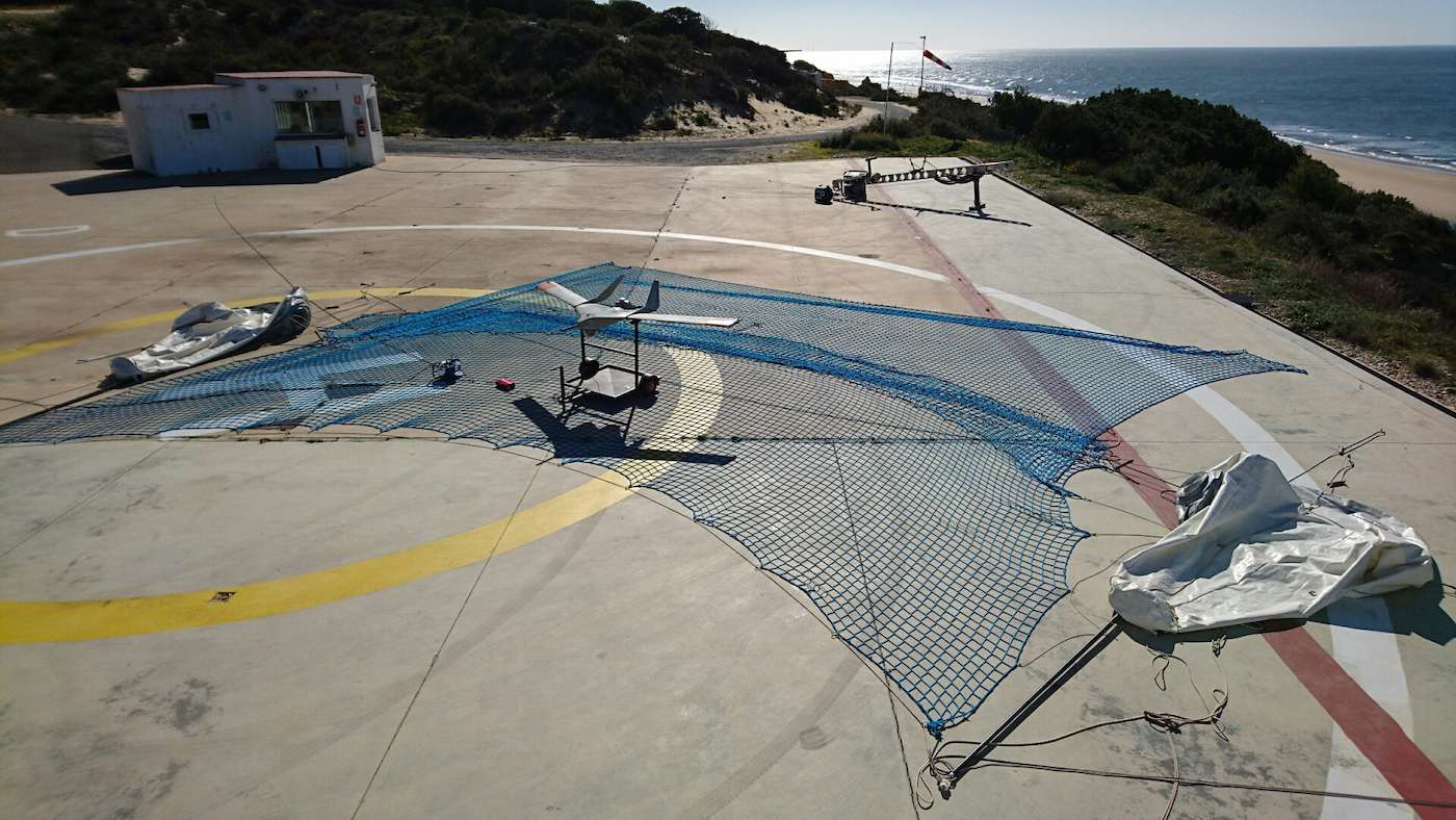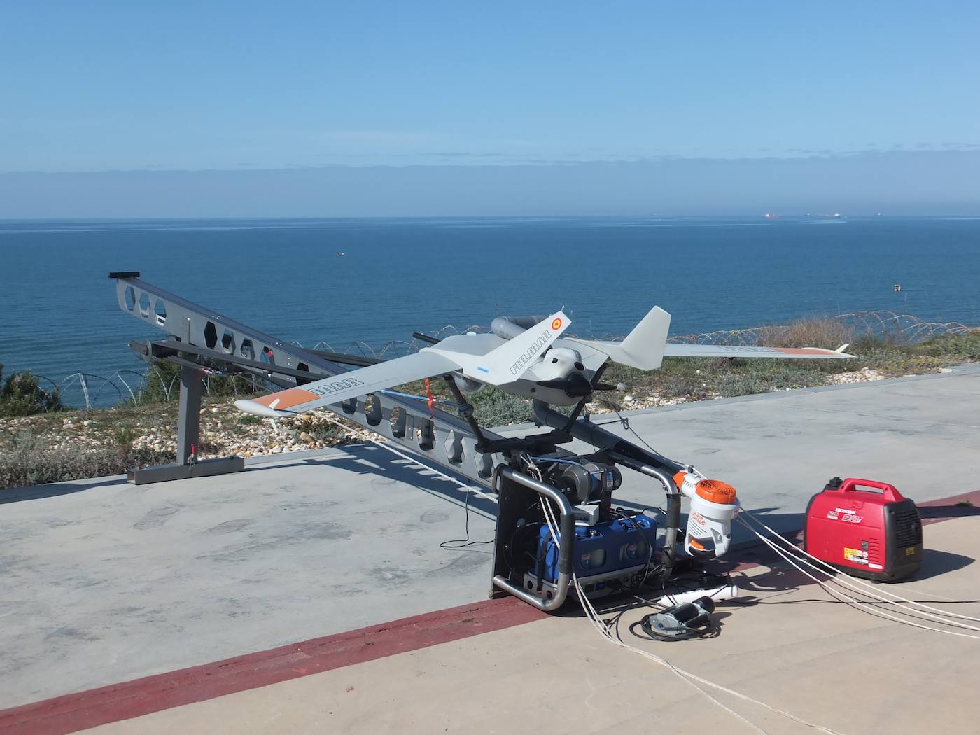 Sistema UAV Fulmar, compuesto por una catapulta lanzadora, un UAV Fulmar y una red receptora.