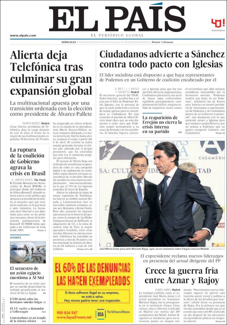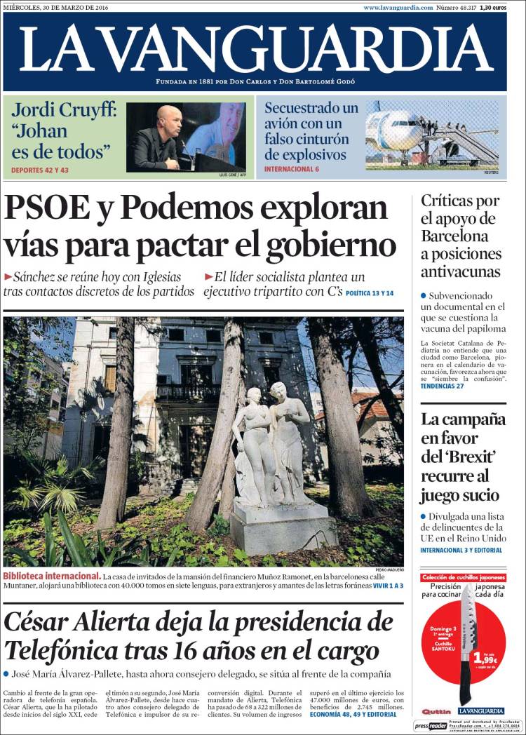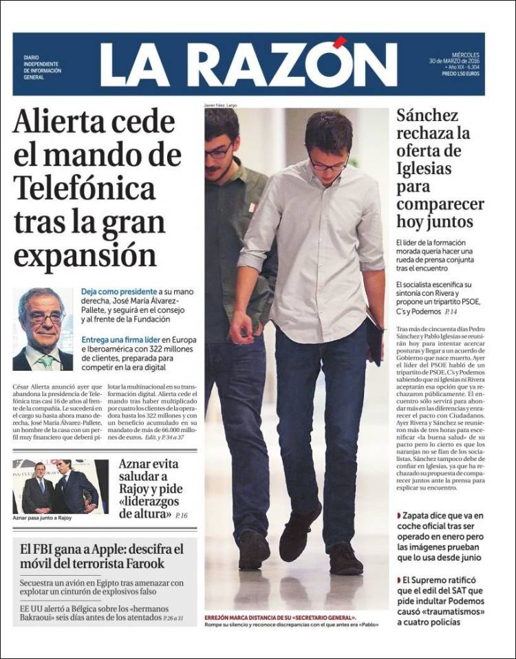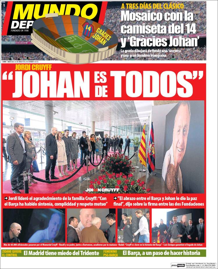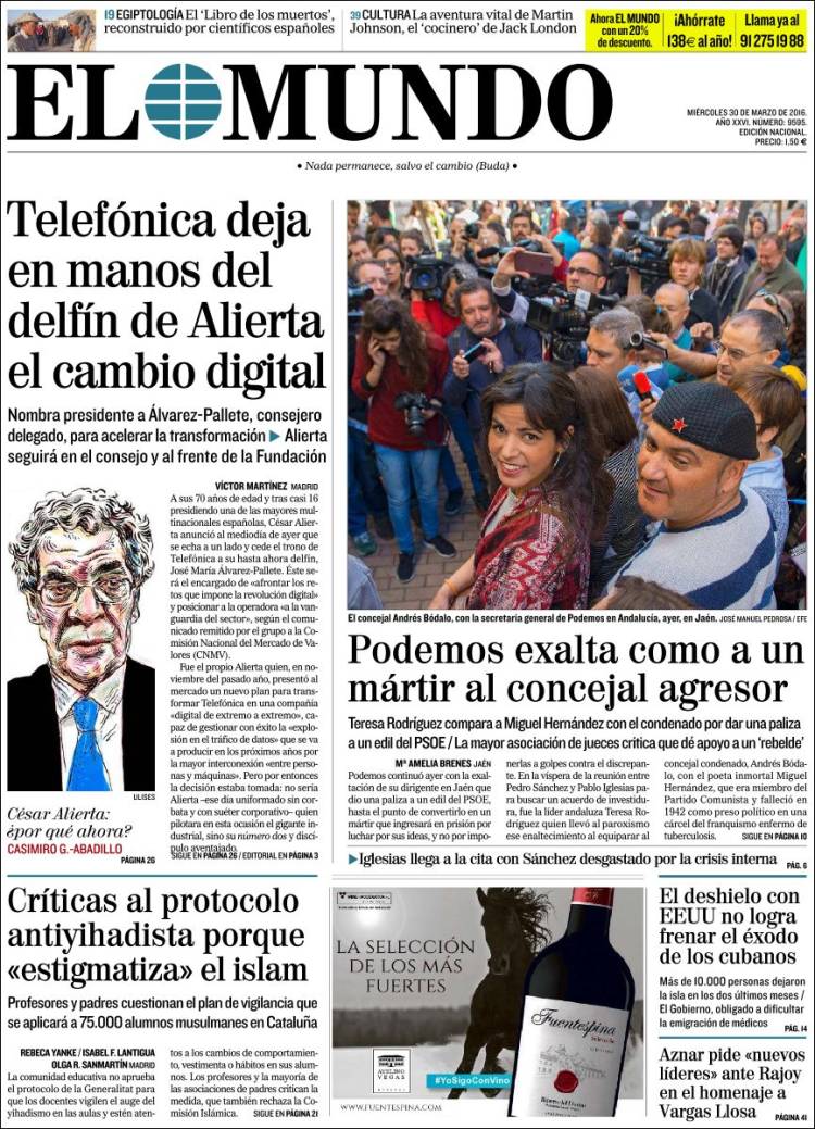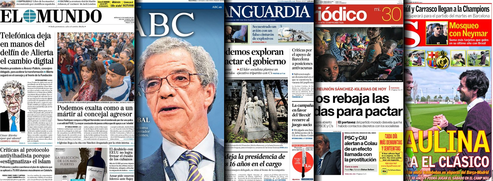 Portadas de los diarios El Mundo, El País, ABC, La Razón, La Vanguardia, El Periódico, Cinco Días, El Economista, Expansión, Marca, As, Mundo Deportivo y Sport.