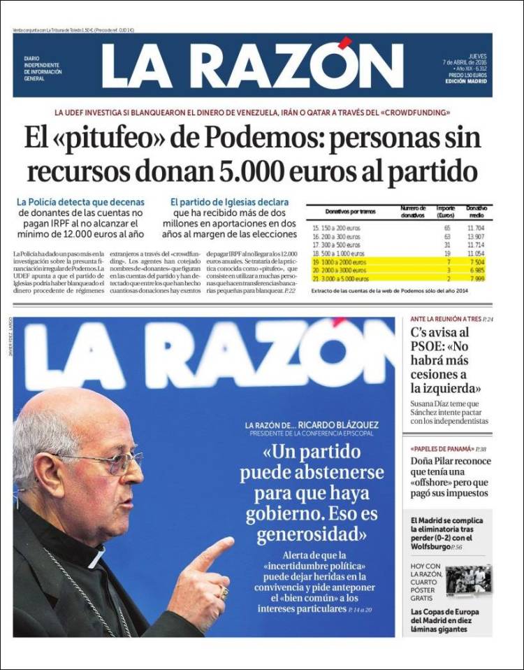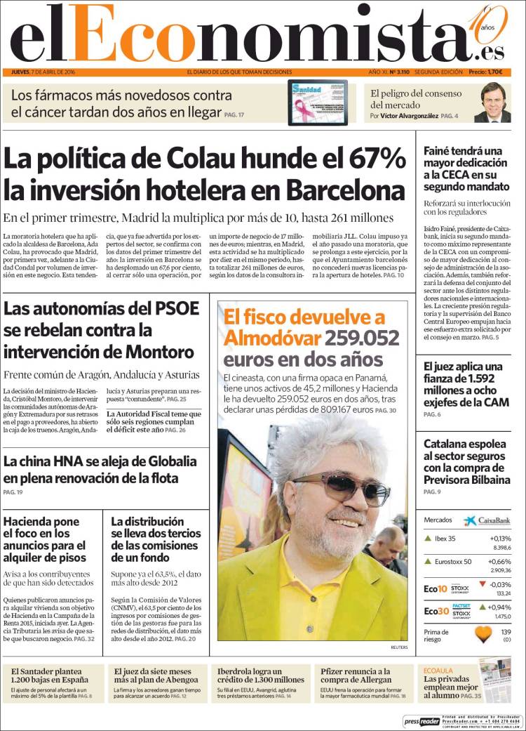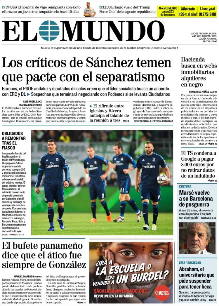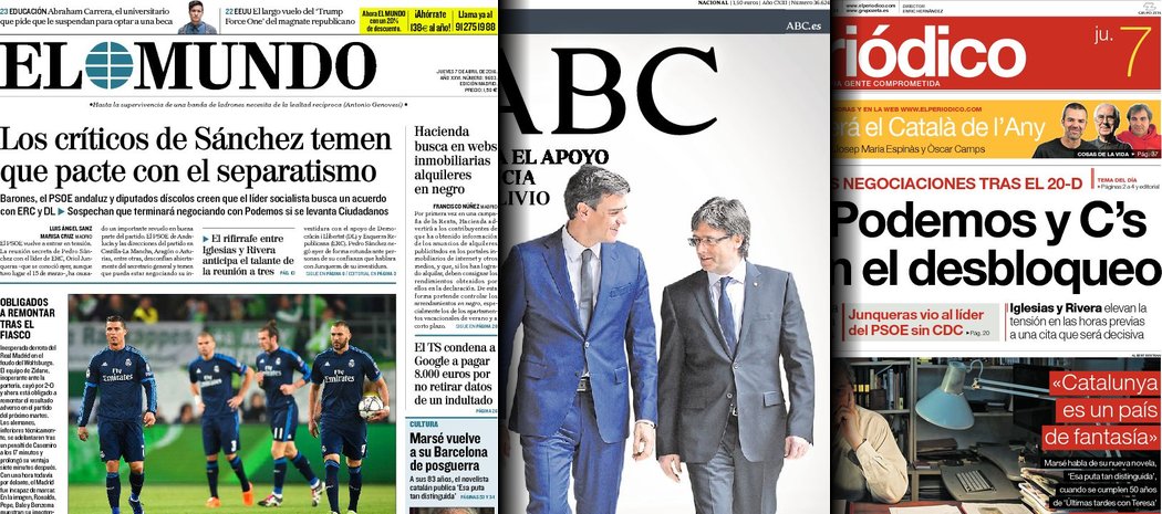 Portadas de los diarios El Mundo, El País, ABC, La Razón, La Vanguardia, El Periódico, Cinco Días, El Economista, Expansión, Marca, As, Mundo Deportivo y Sport.