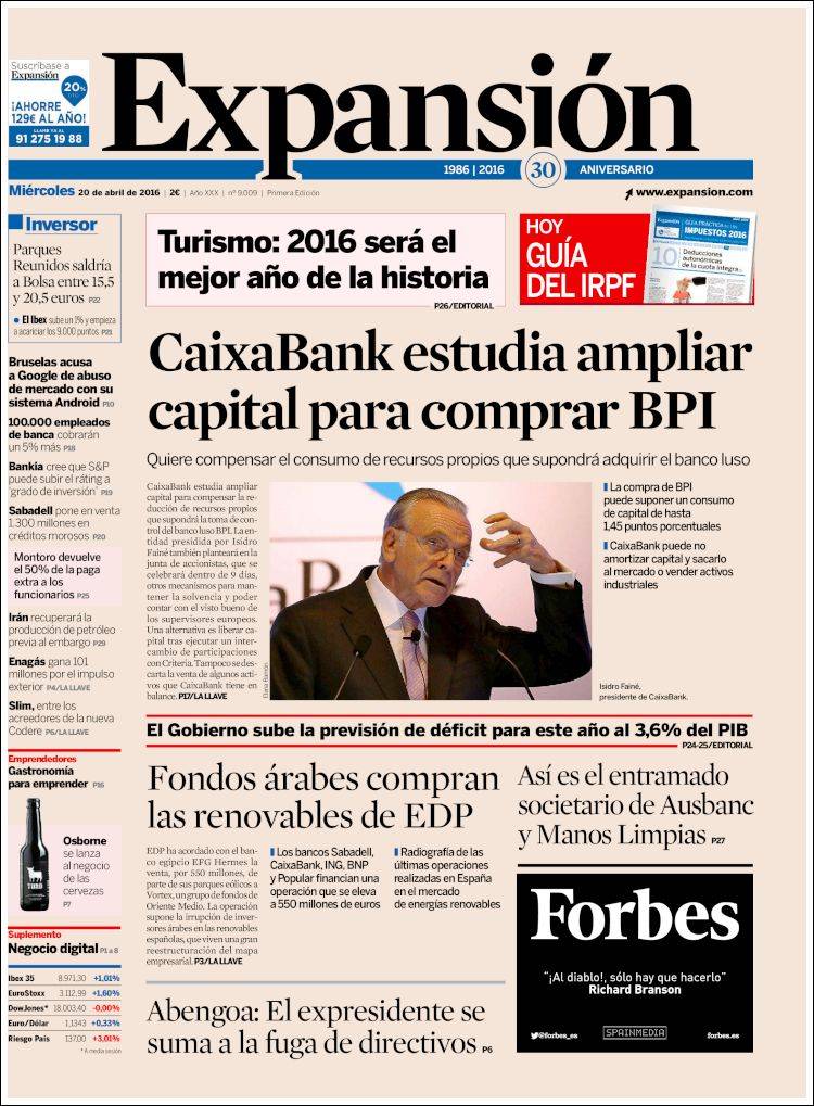Portadas de los diarios El Mundo, El País, ABC, La Razón, La Vanguardia, El Periódico, Cinco Días, El Economista, Expansión, Marca, As, Mundo Deportivo y Sport.