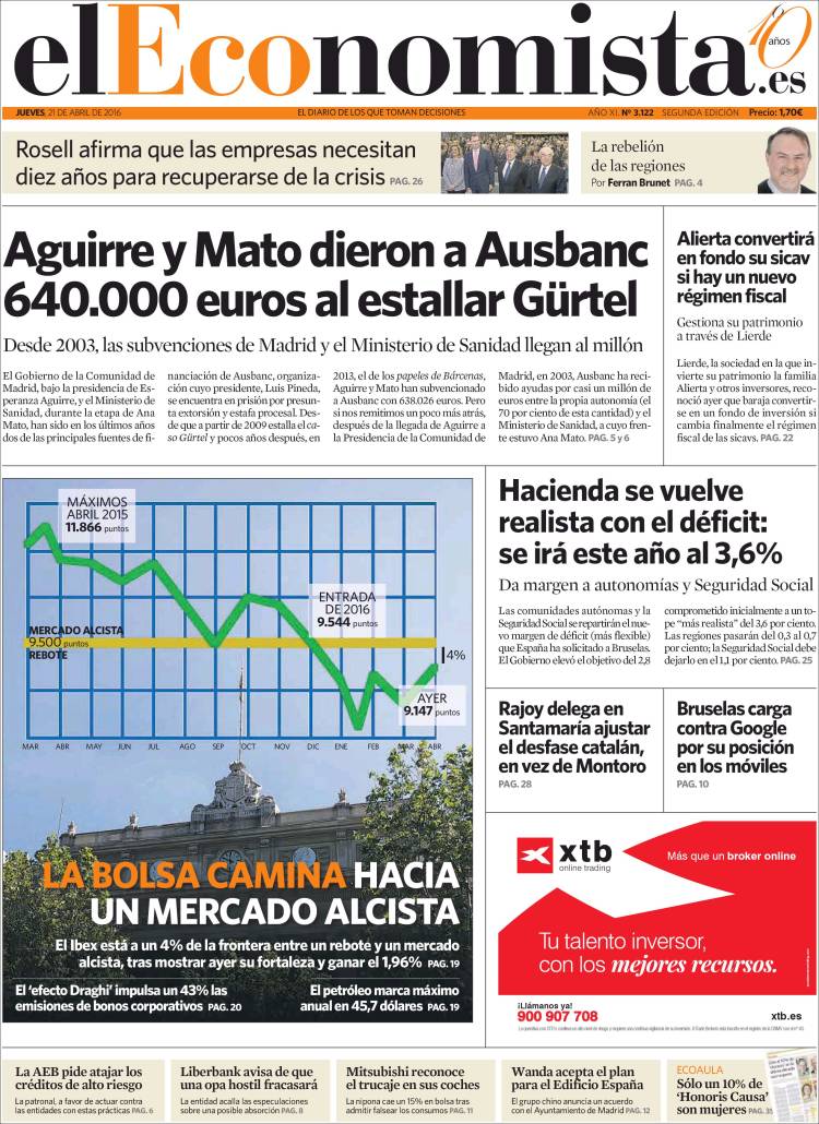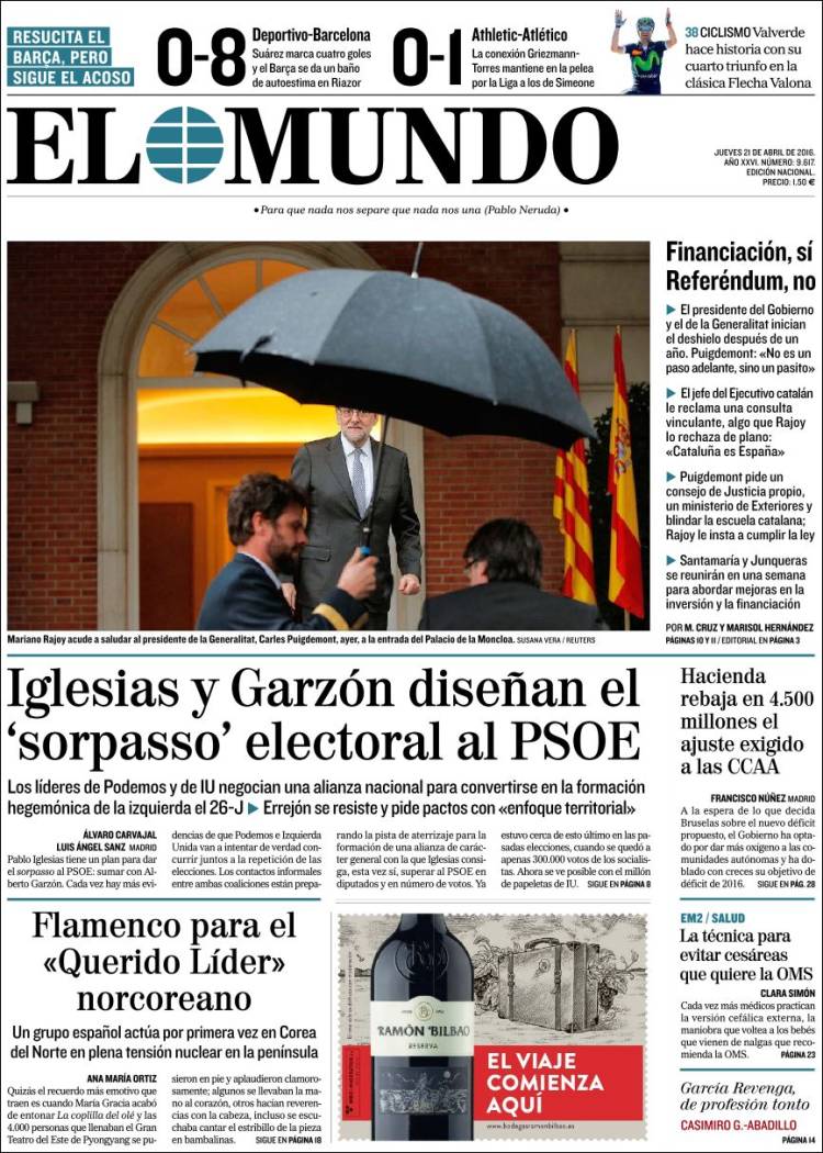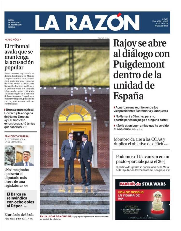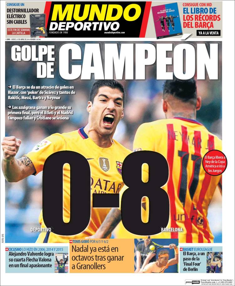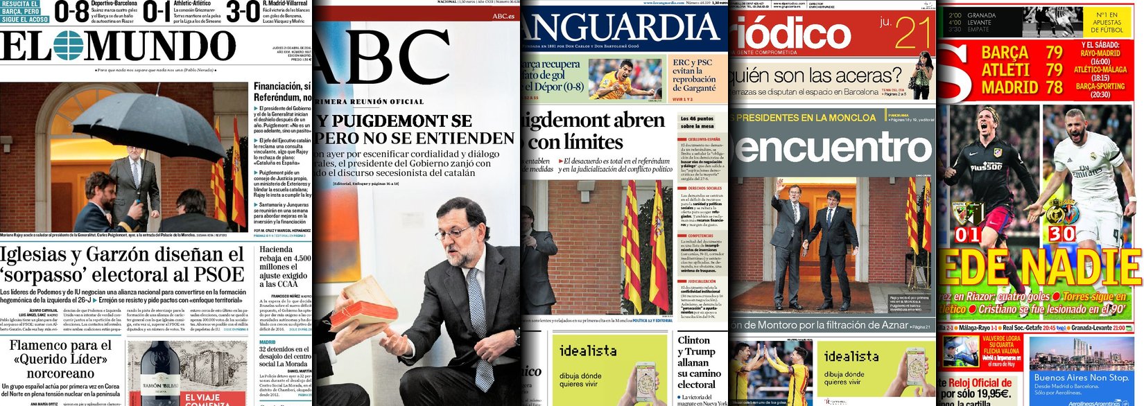 Portadas de los diarios El Mundo, El País, ABC, La Razón, La Vanguardia, El Periódico, Cinco Días, El Economista, Expansión, Marca, As, Mundo Deportivo y Sport.
