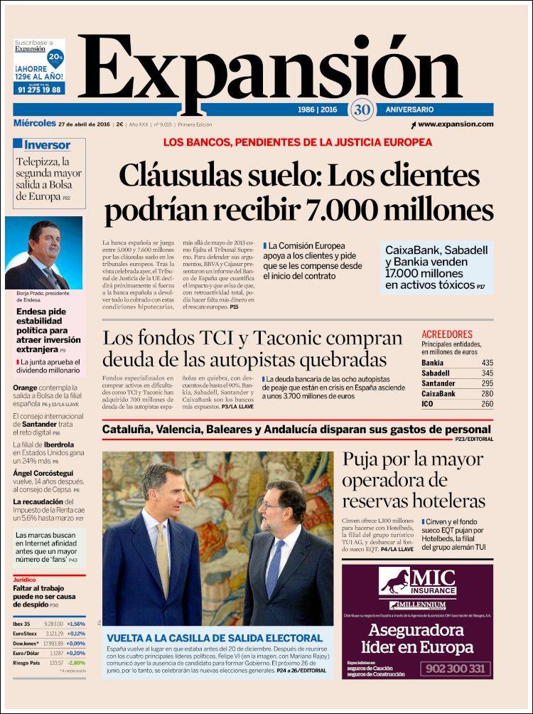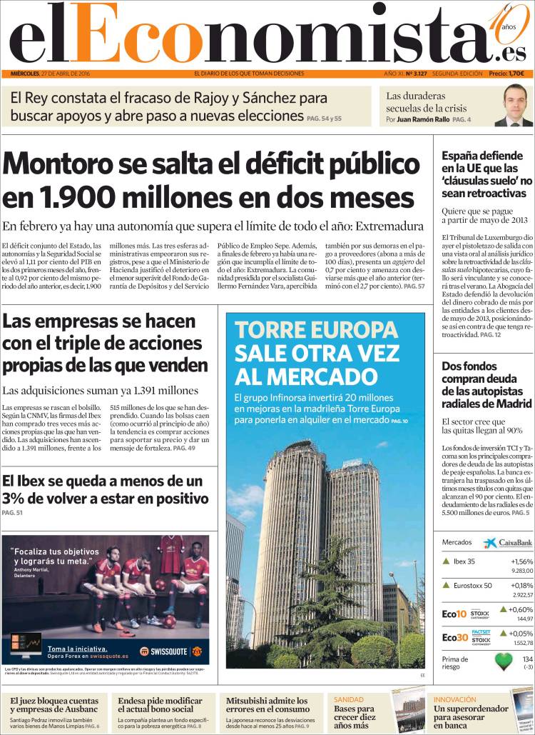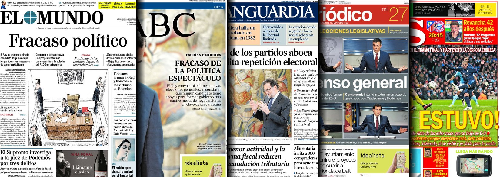 Portadas de los diarios El Mundo, El País, ABC, La Razón, La Vanguardia, El Periódico, Cinco Días, El Economista, Expansión, Marca, As, Mundo Deportivo y Sport.
