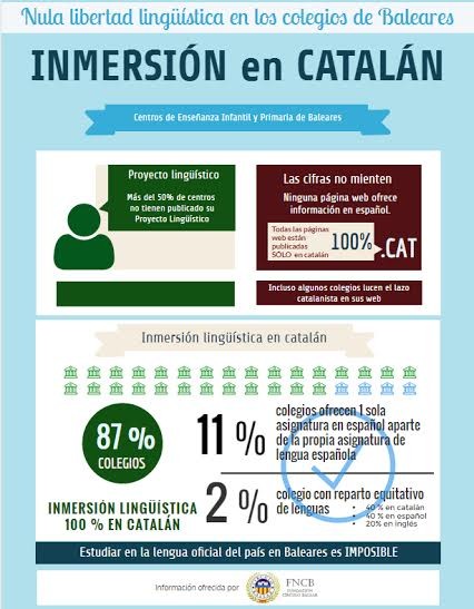 La fundación denuncia, además, que la información en las webs escolares está publicada en catalán, que sus proyectos educativos también aparecen en este idioma y que buena parte de ellos están adscritos a la campaña Enllaçats pel català favorable a la inmersión en los llamados "países catalanes". Por otra parte, más del 50% de los colegios no tiene publicado su proyecto lingüístico. La situación no es mucho mejor en la enseñanza secundaria: de los 51 Institutos de Enseñanza Secundaria de la isla, la fundación denuncia que sólo un 15% ofrece asignaturas no lingüísticas en español.