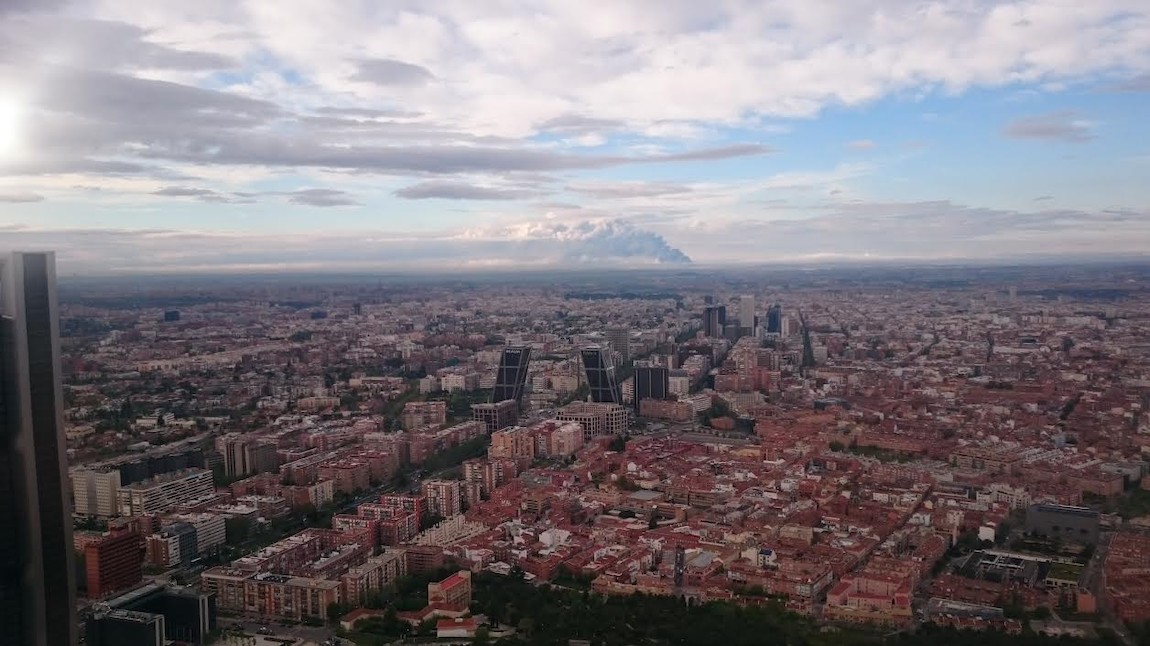 En poco tiempo, el incendio creció en magnitud y una densa columna de humo negro se hizo visible en muchos kilómetros a la redonda. En la imagen, el fuego visto desde Madrid.