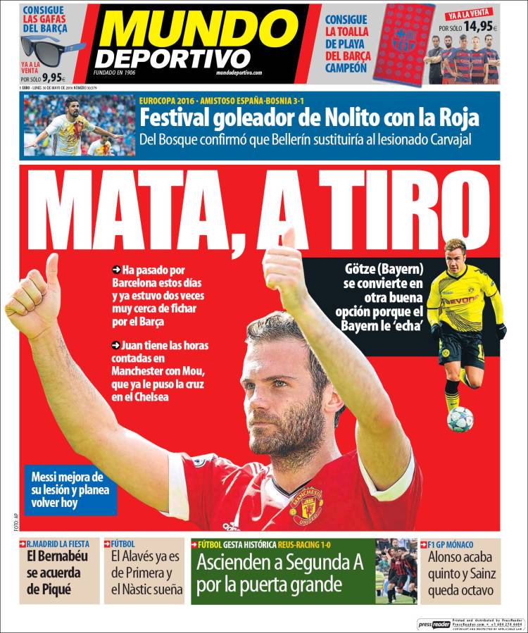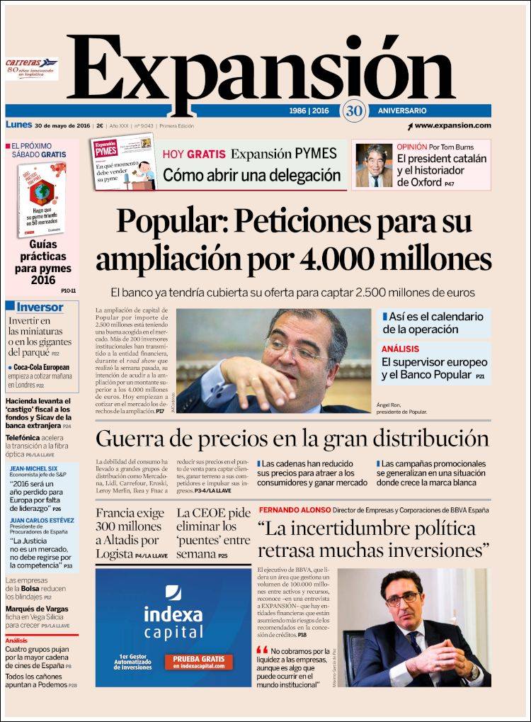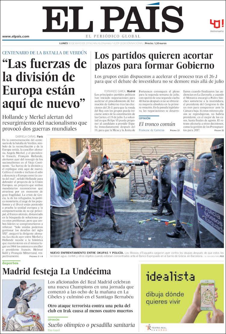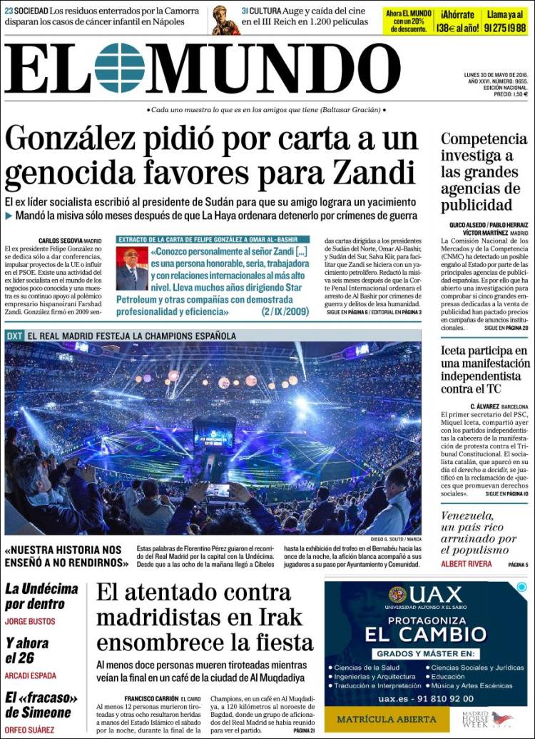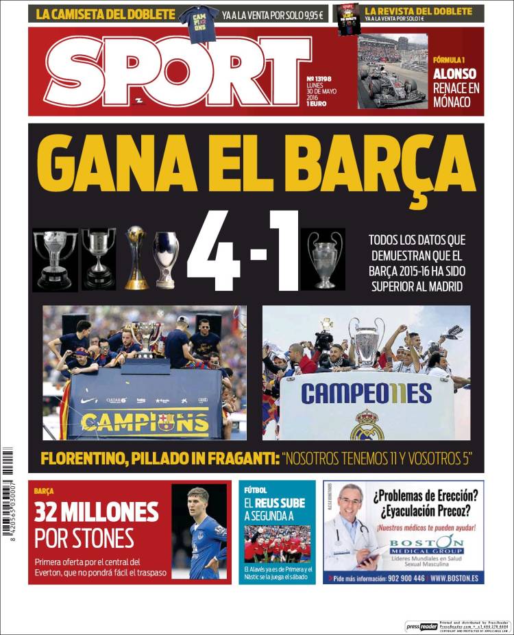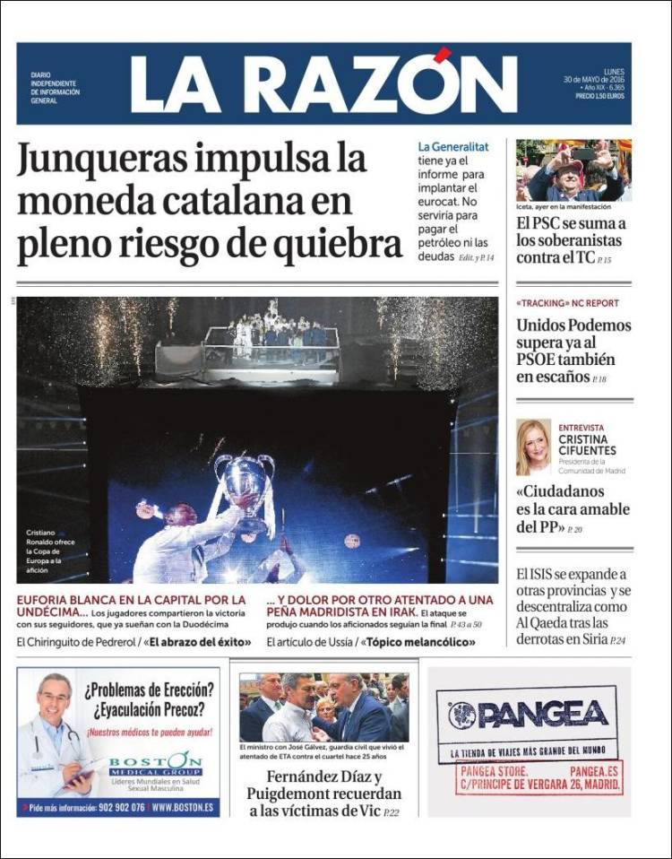 Portadas de los diarios El Mundo, El País, ABC, La Razón, La Vanguardia, El Periódico, Cinco Días, El Economista, Expansión, Marca, As, Mundo Deportivo y Sport.