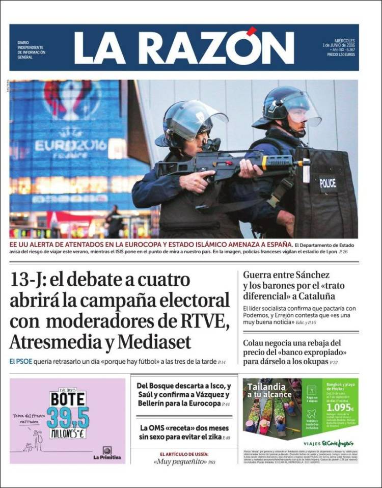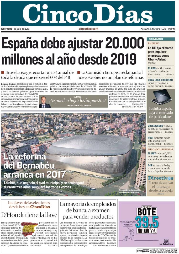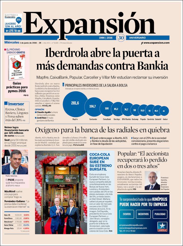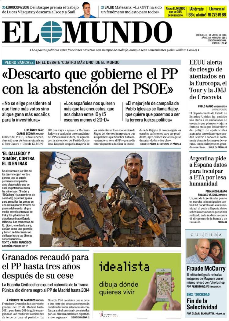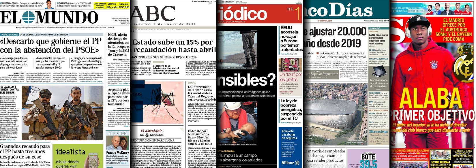 Portadas de los diarios El Mundo, El País, ABC, La Razón, La Vanguardia, El Periódico, Cinco Días, El Economista, Expansión, Marca, As, Mundo Deportivo y Sport.