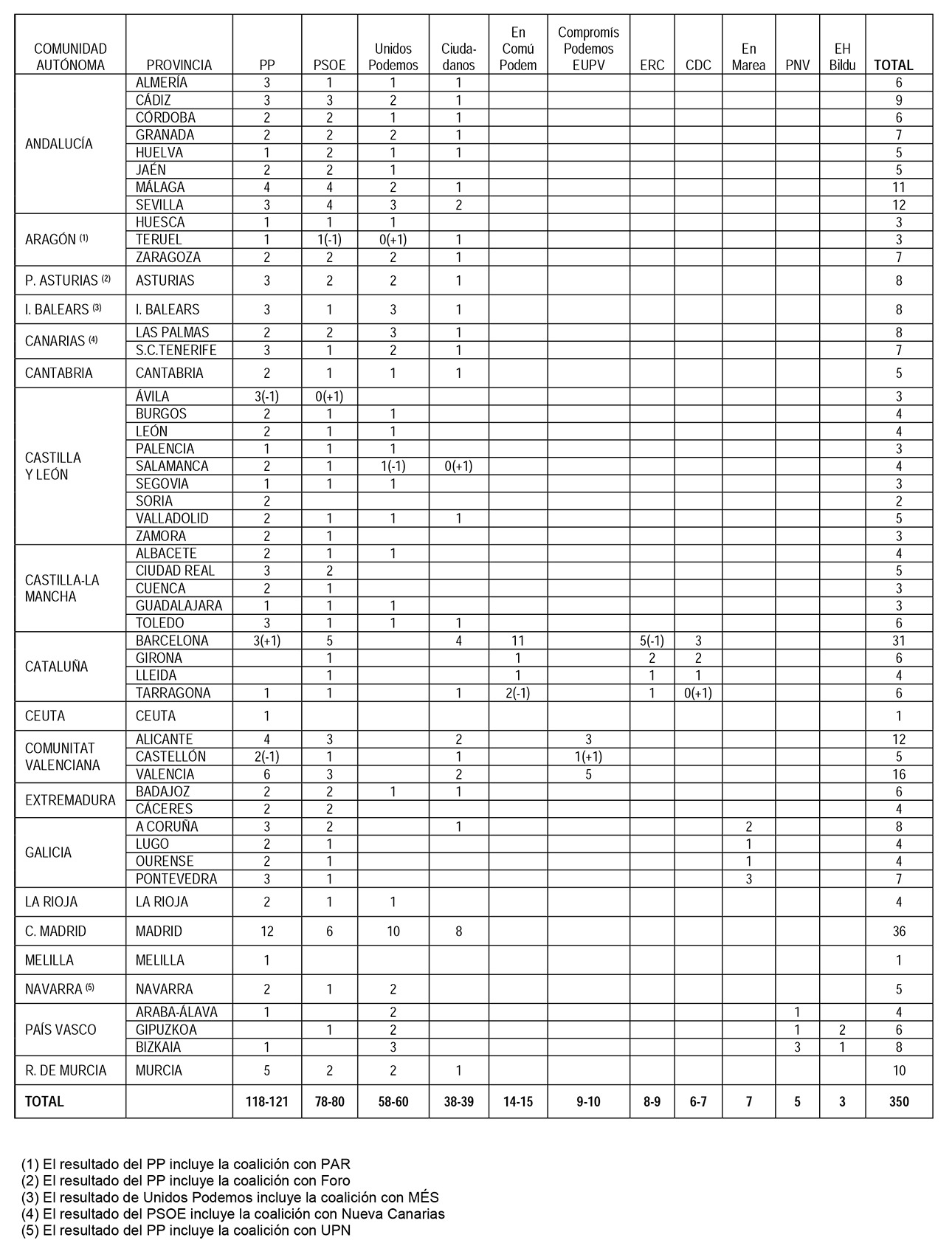 Cataluña y País Vasco se confirman como dos importantes feudos podemitas. Especialmente la primera, En Comun Podem consigue un extraordinario resultado con 16 escaños, 4 más que en diciembre, cuando ya fueron primera fuerza. Y en País Vasco se consolidan como la opción más votada, muy por delante del PNV, con siete escaños.