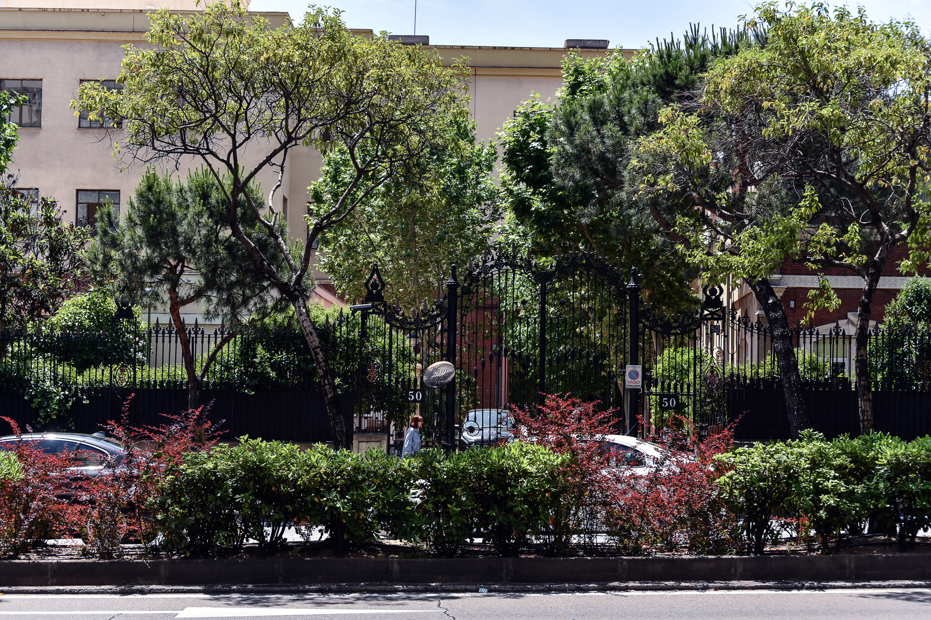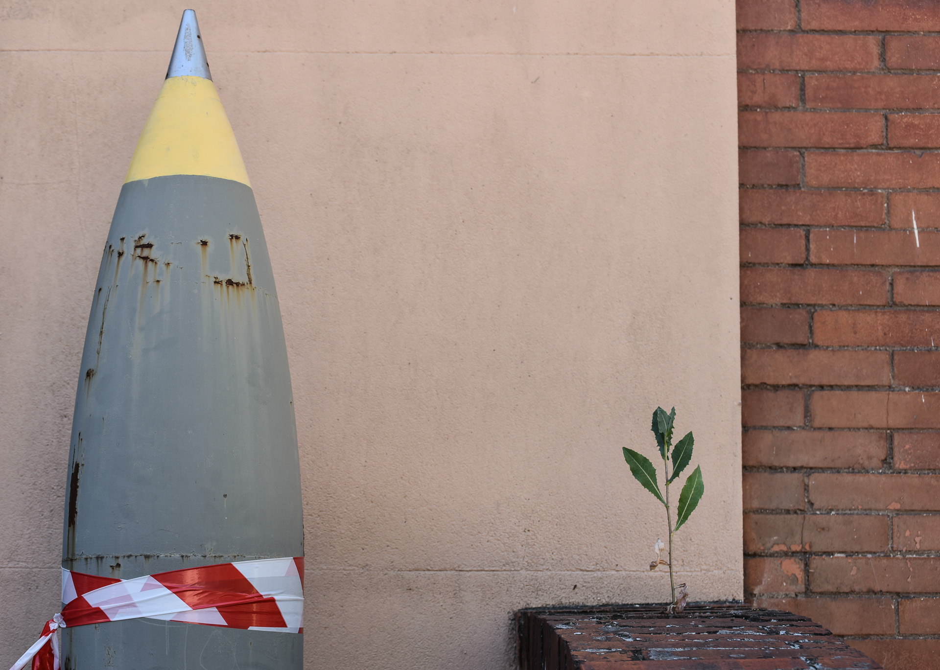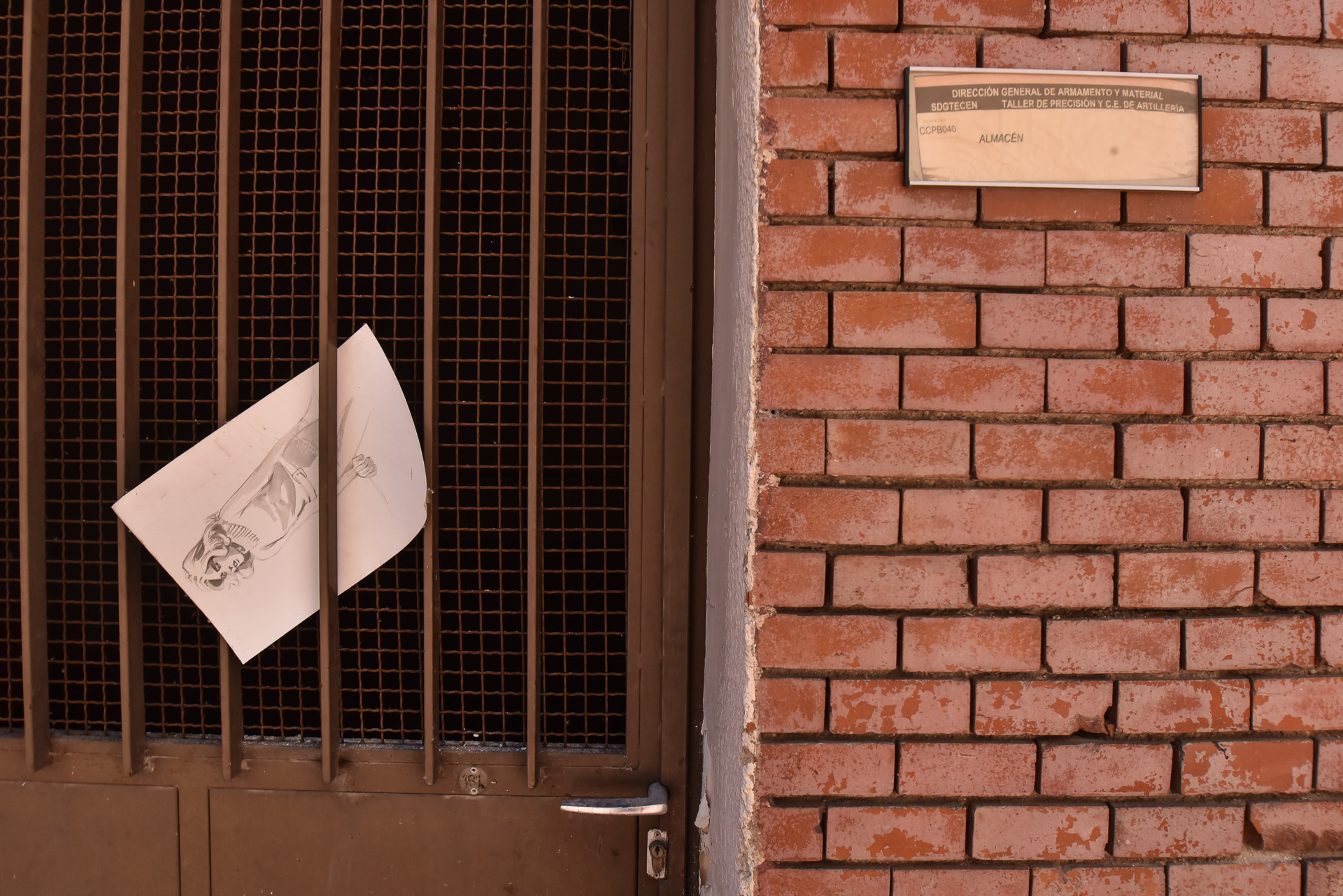Dos viejas cabezas de proyectil permanecen en la puerta de entrada de la Dirección General de armamento y material perteneciente al Ministerio de Defensa.