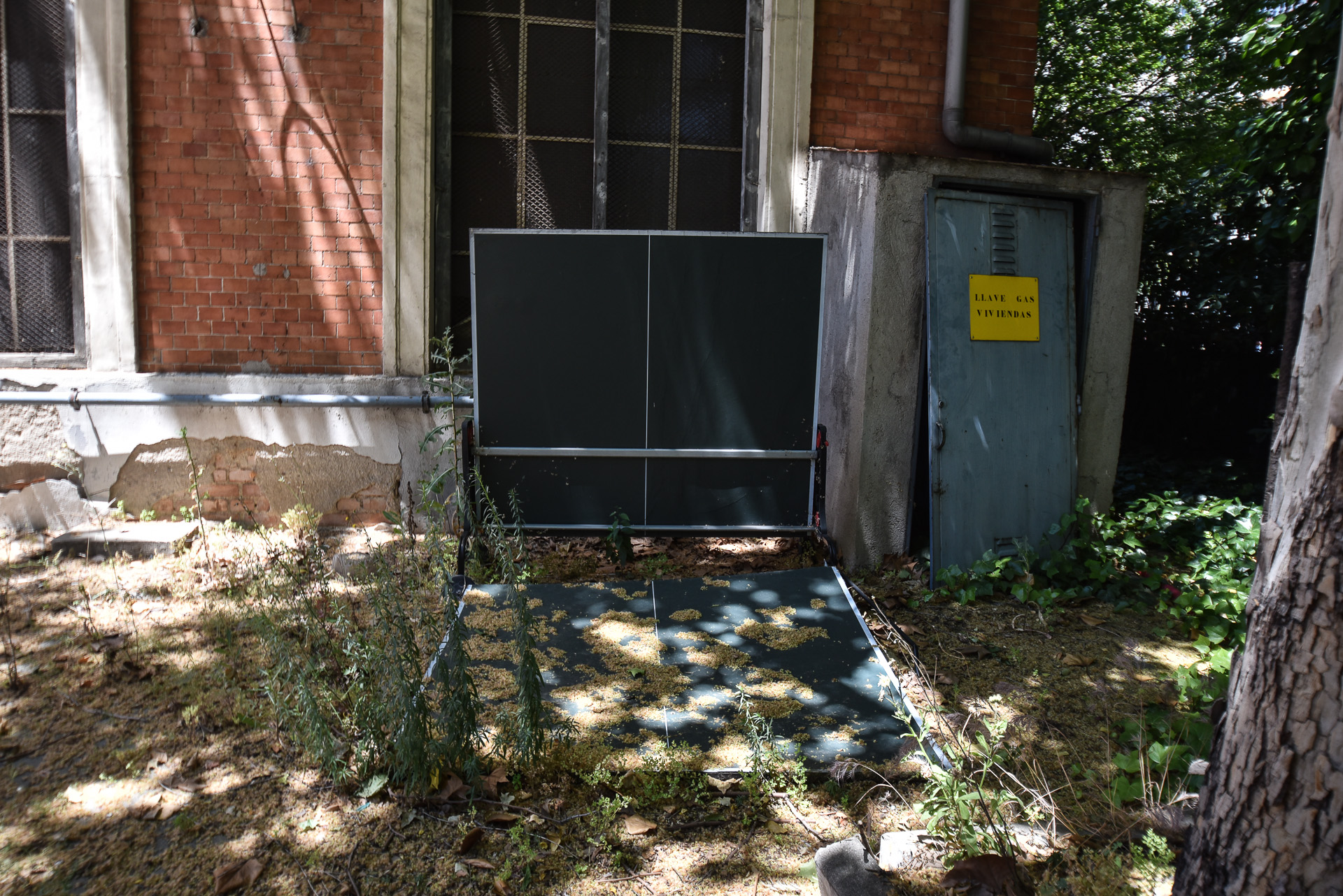 Una vieja y abandonada mesa de ping pong en la parte trasera de uno de los edificios.