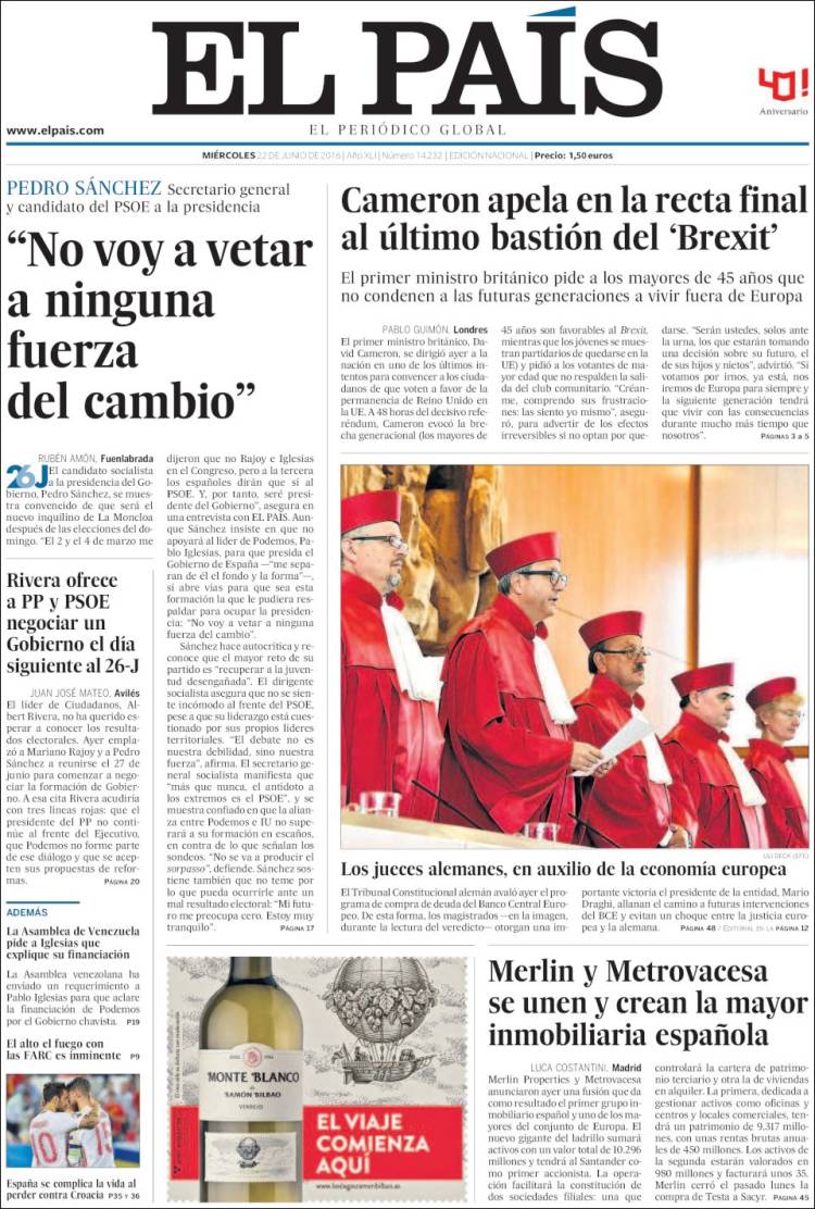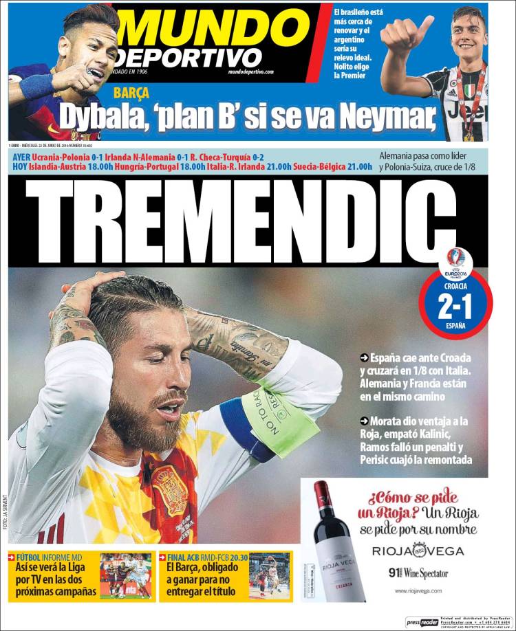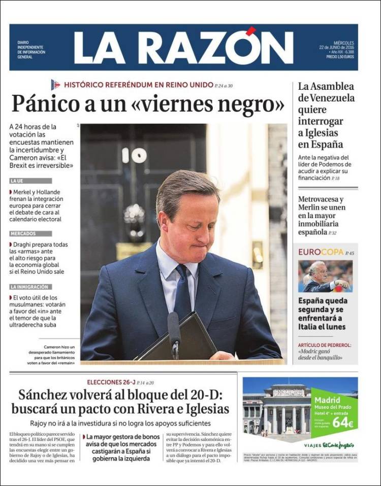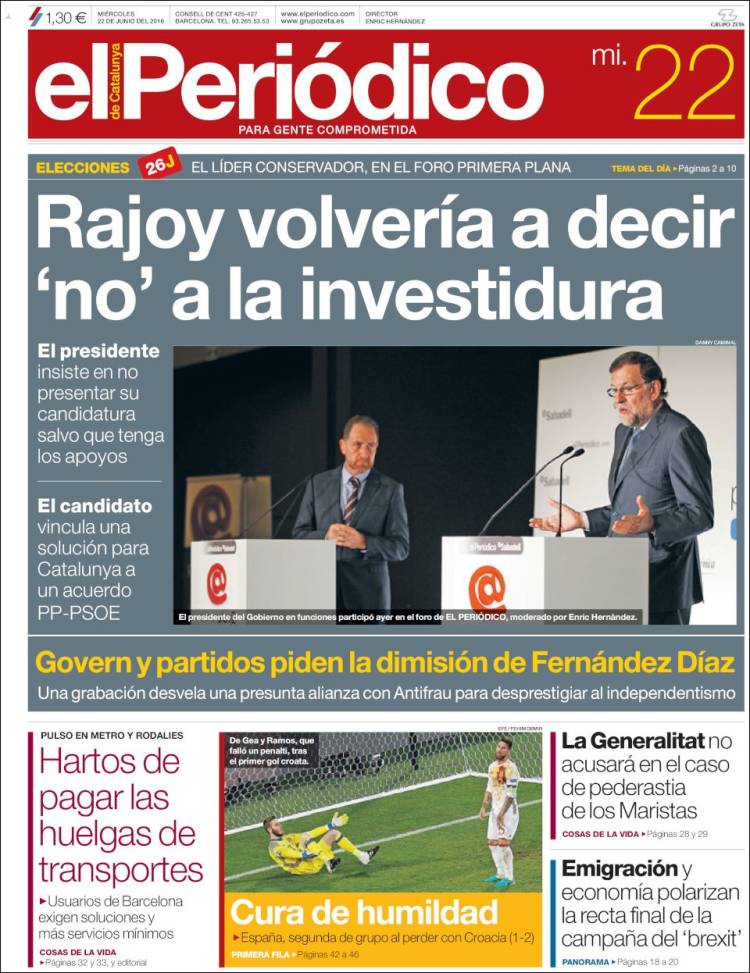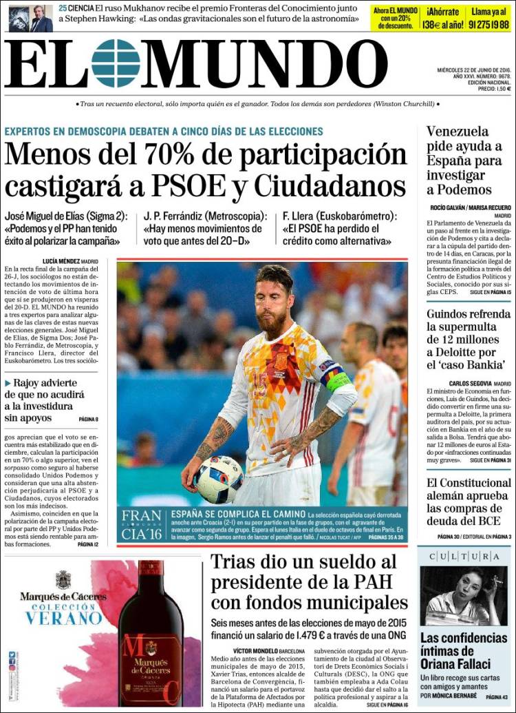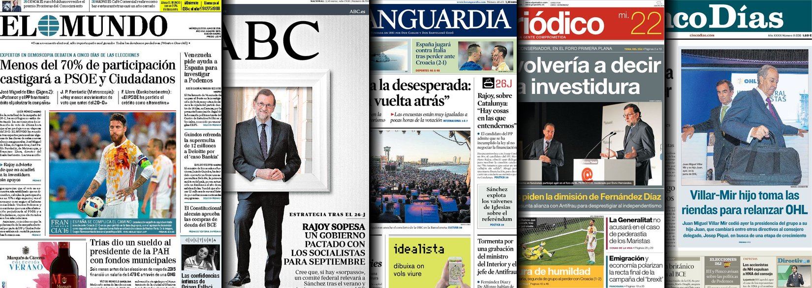 Portadas de los diarios El Mundo, El País, ABC, La Razón, La Vanguardia, El Periódico, Cinco Días, El Economista, Expansión, Marca, As, Mundo Deportivo y Sport.