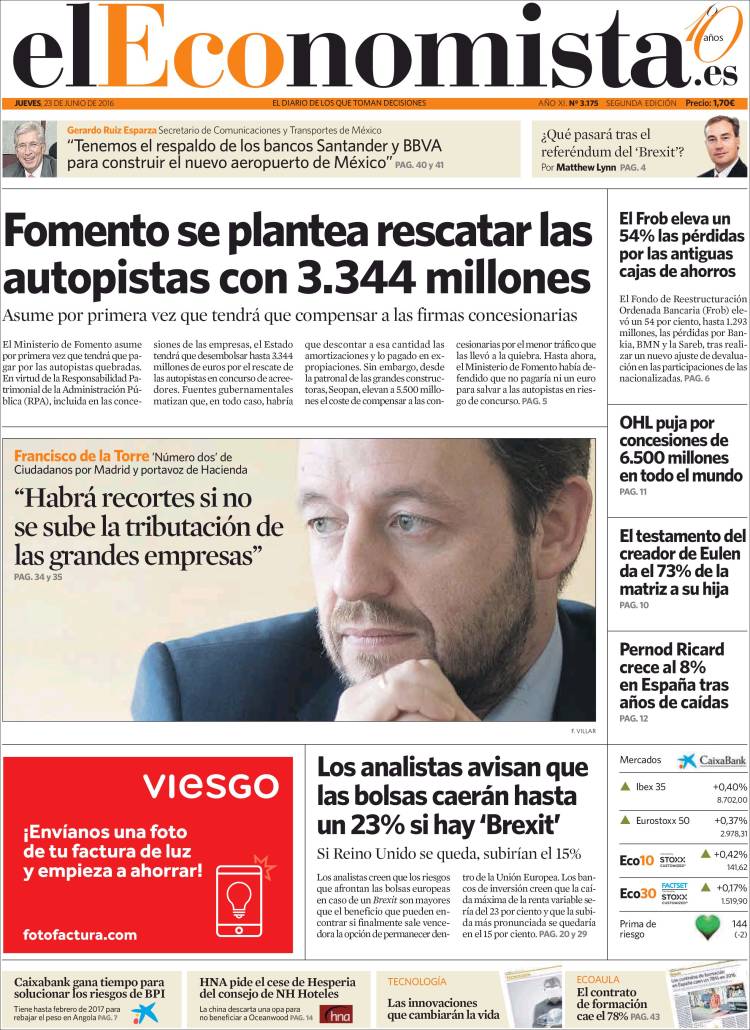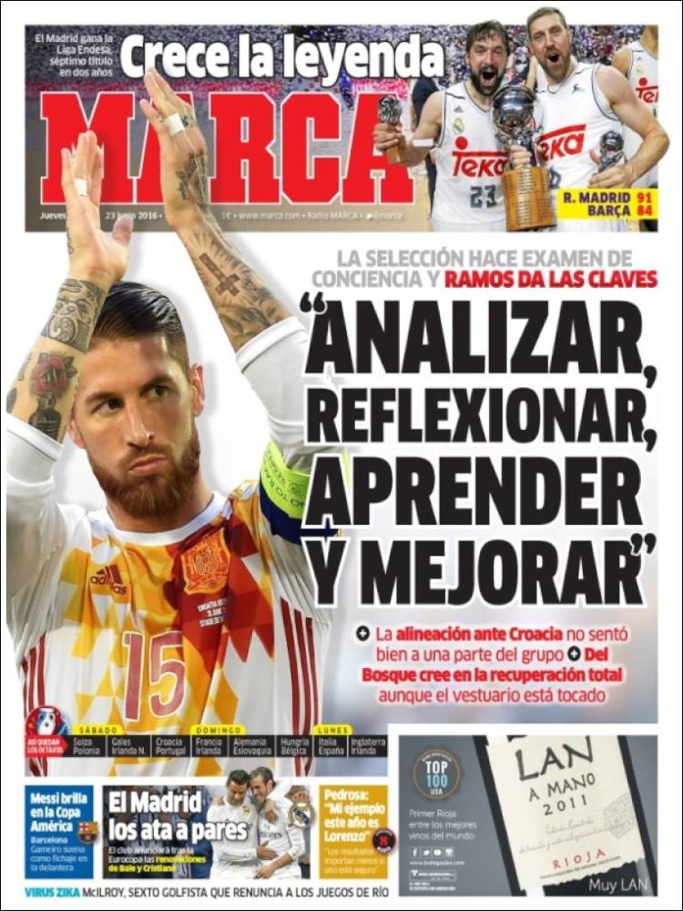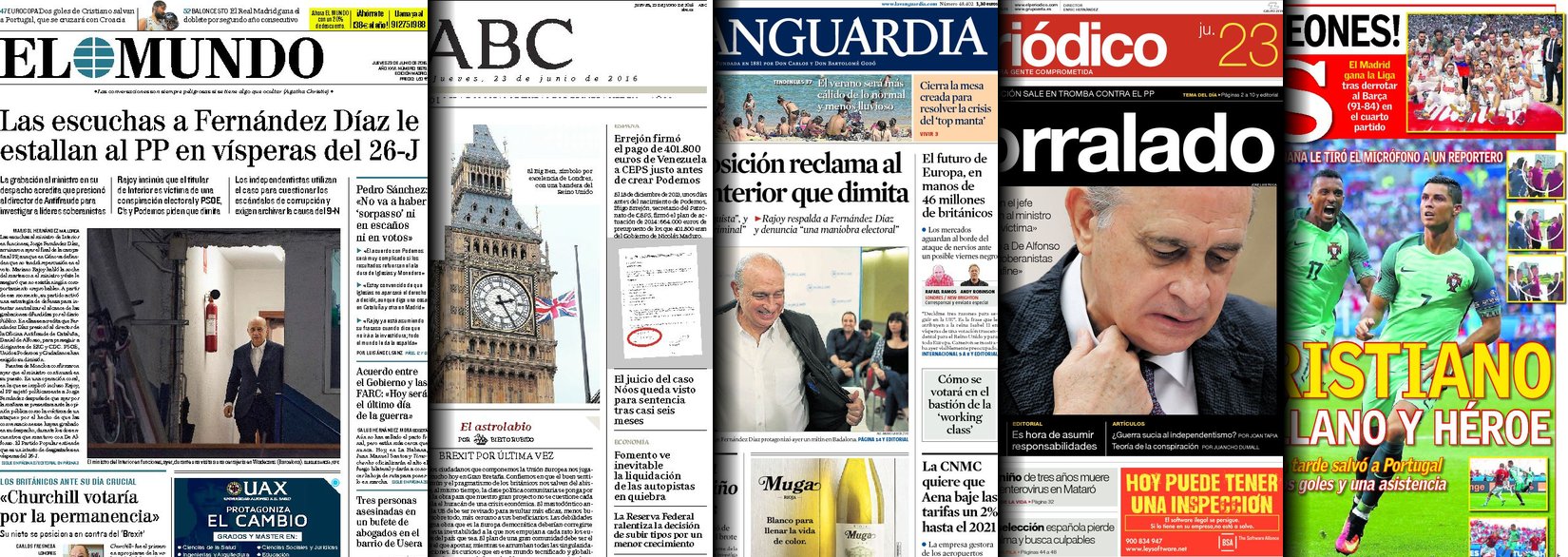 Portadas de los diarios El Mundo, El País, ABC, La Razón, La Vanguardia, El Periódico, Cinco Días, El Economista, Marca, As, Mundo Deportivo y Sport.