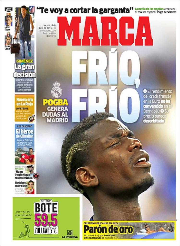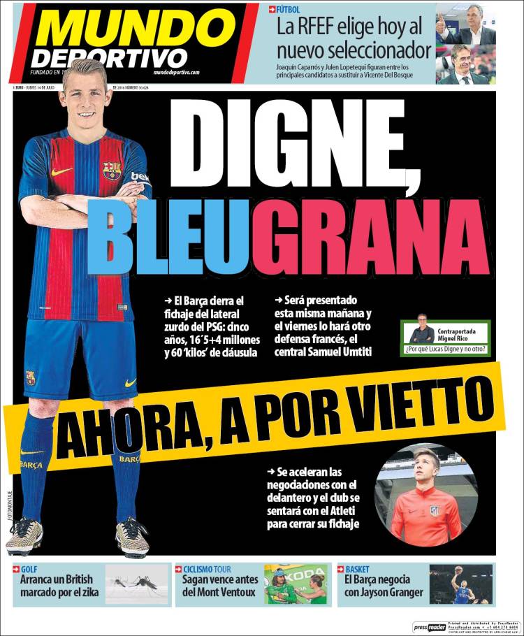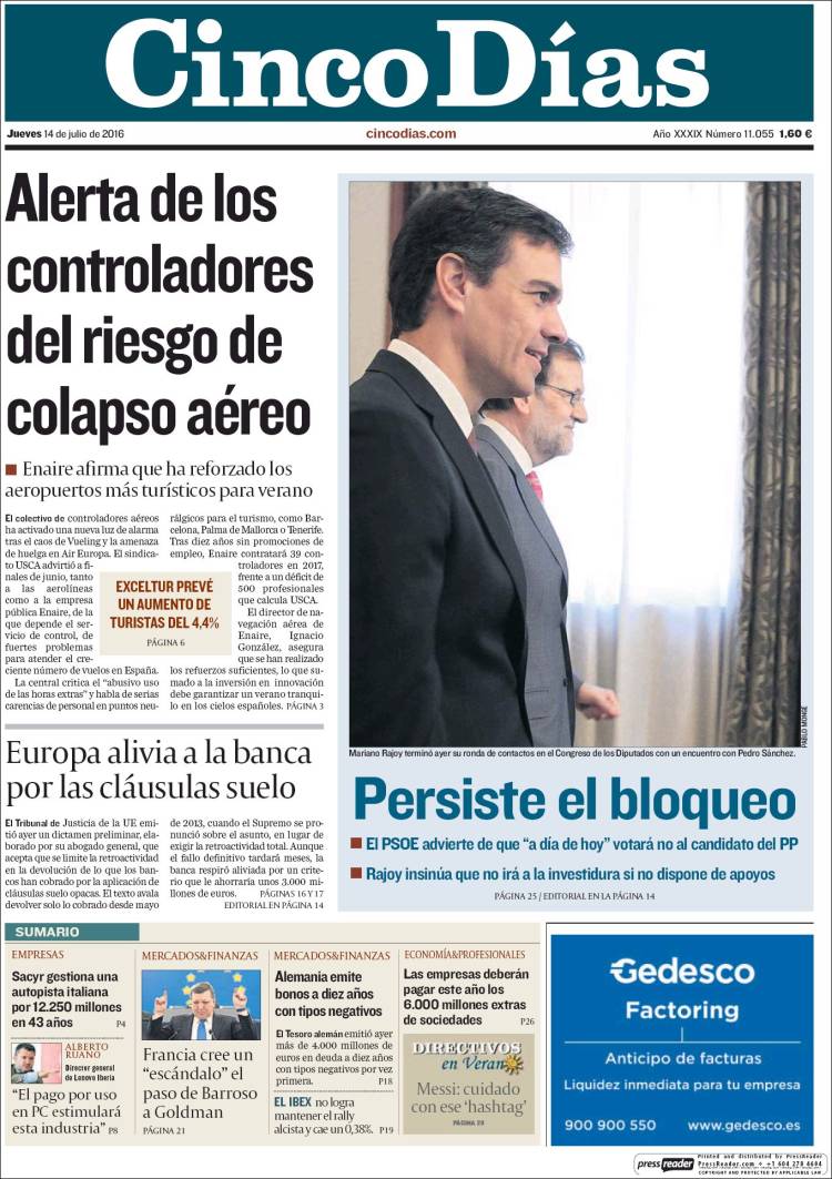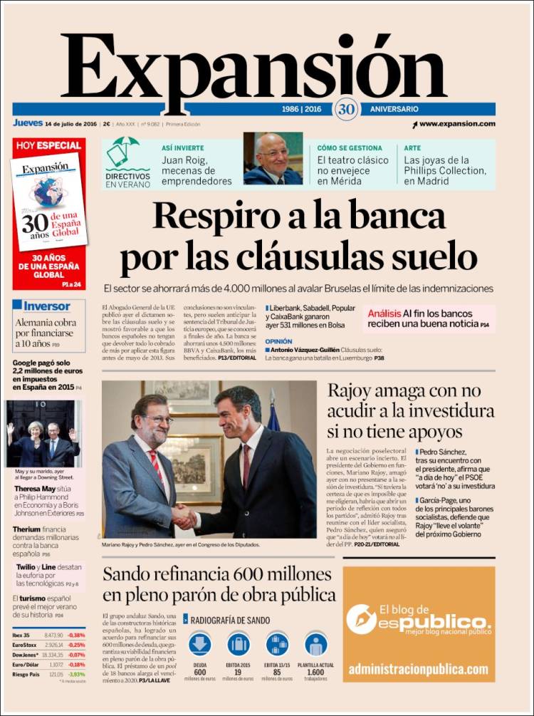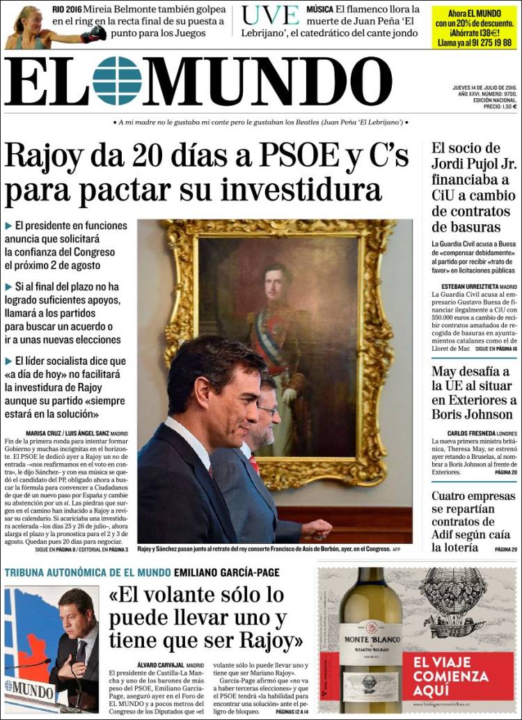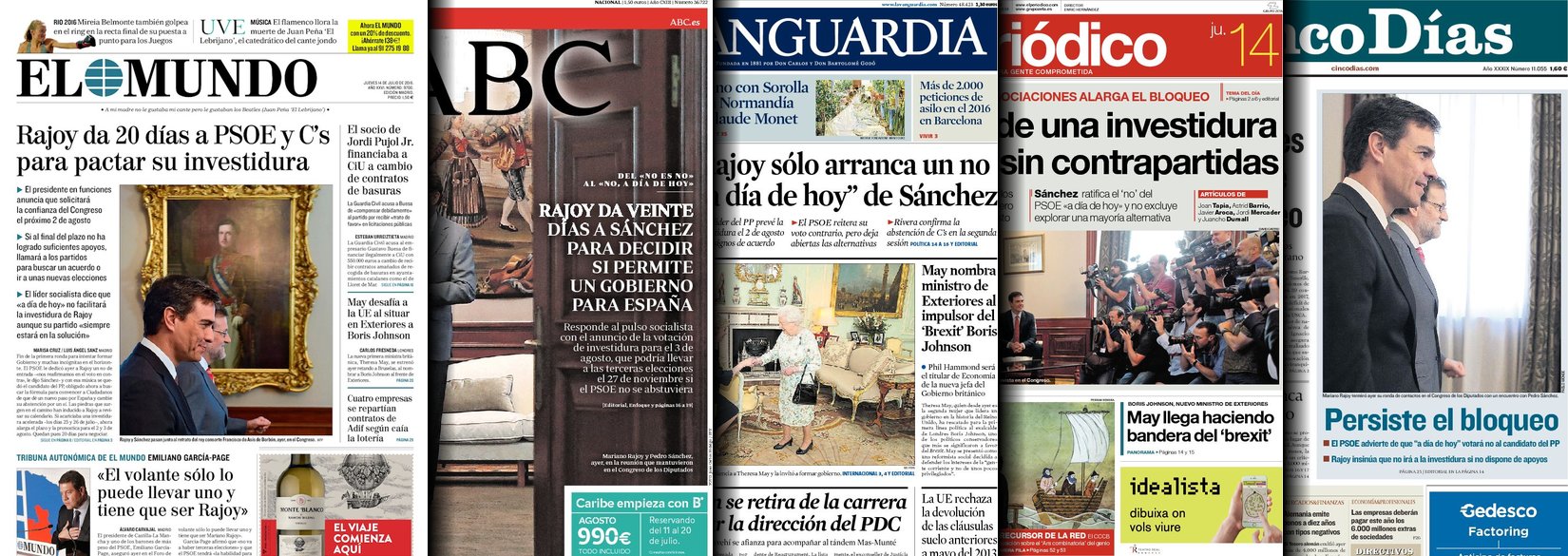 Portadas de los diarios El Mundo, El País, ABC, La Razón, La Vanguardia, El Periódico, Cinco Días, El Economista, Expansión, Marca, As, Mundo Deportivo y Sport.