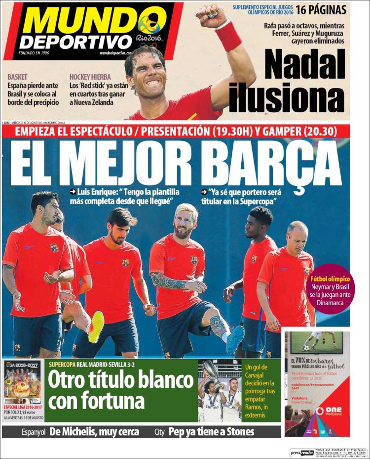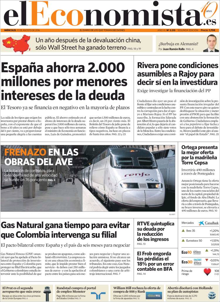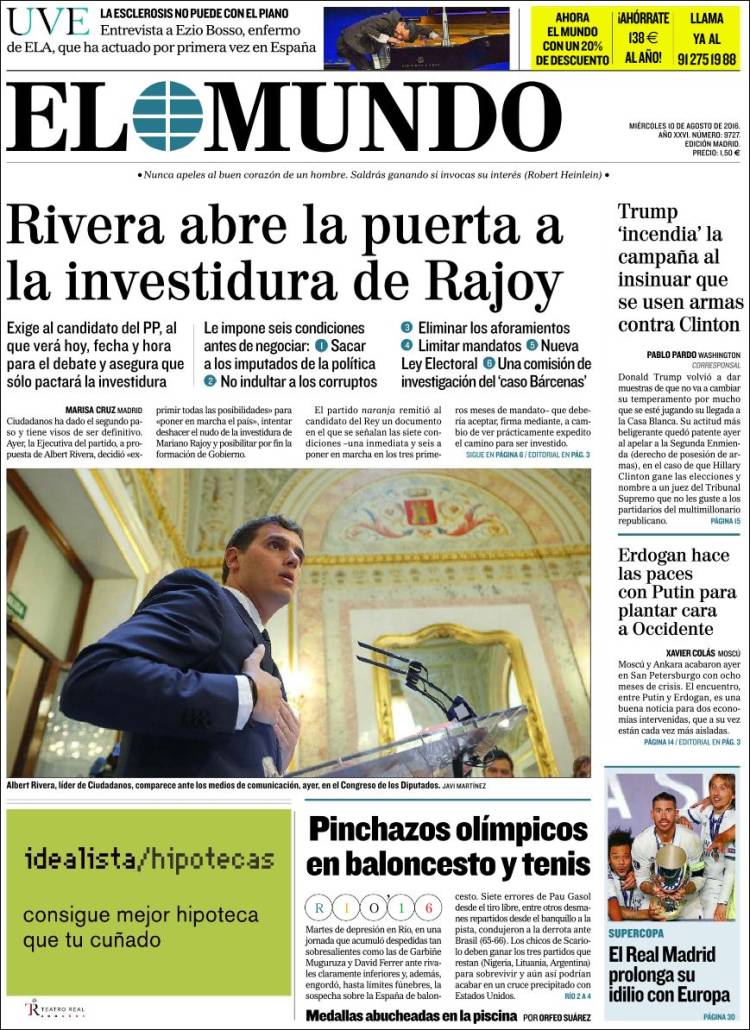 Portadas de los diarios El Mundo, El País, ABC, La Razón, La Vanguardia, El Periódico, Cinco Días, El Economista, Expansión, Marca, As, Mundo Deportivo y Sport.