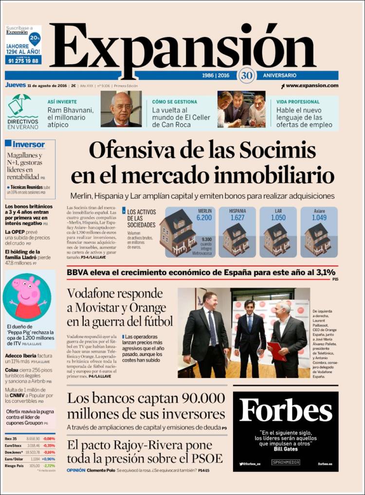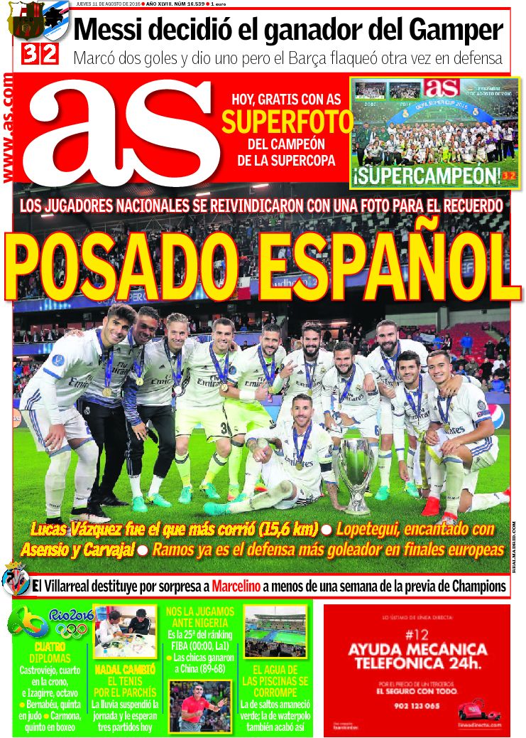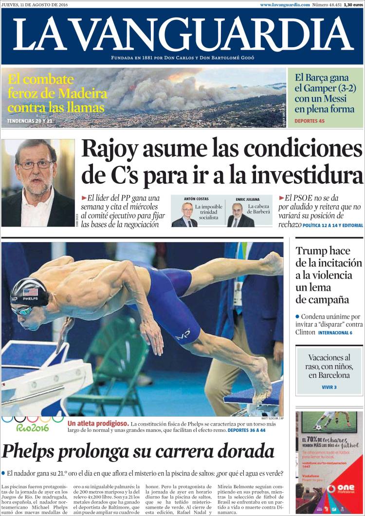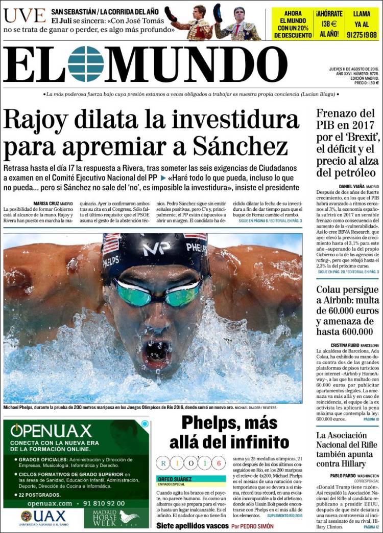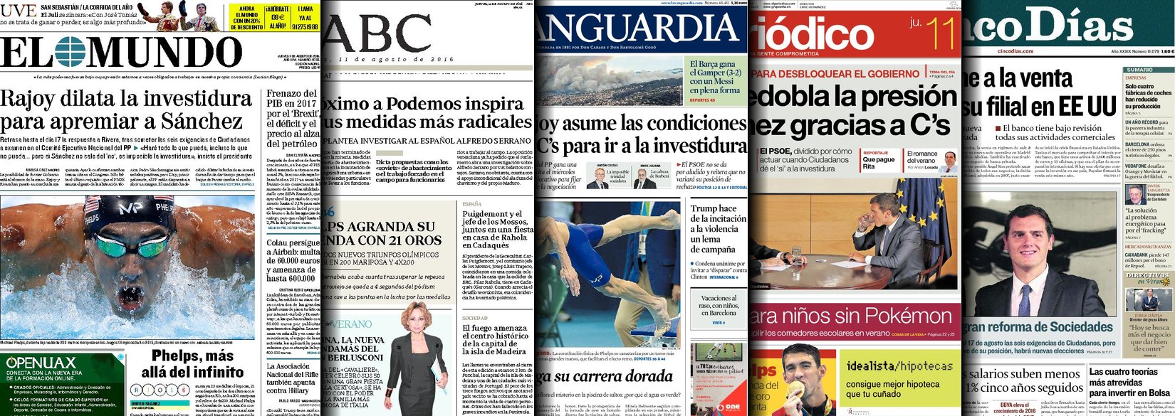 Portadas de los diarios El Mundo, El País, ABC, La Razón, La Vanguardia, El Periódico, Cinco Días, El Economista, Expansión, Marca, As, Mundo Deportivo y Sport.