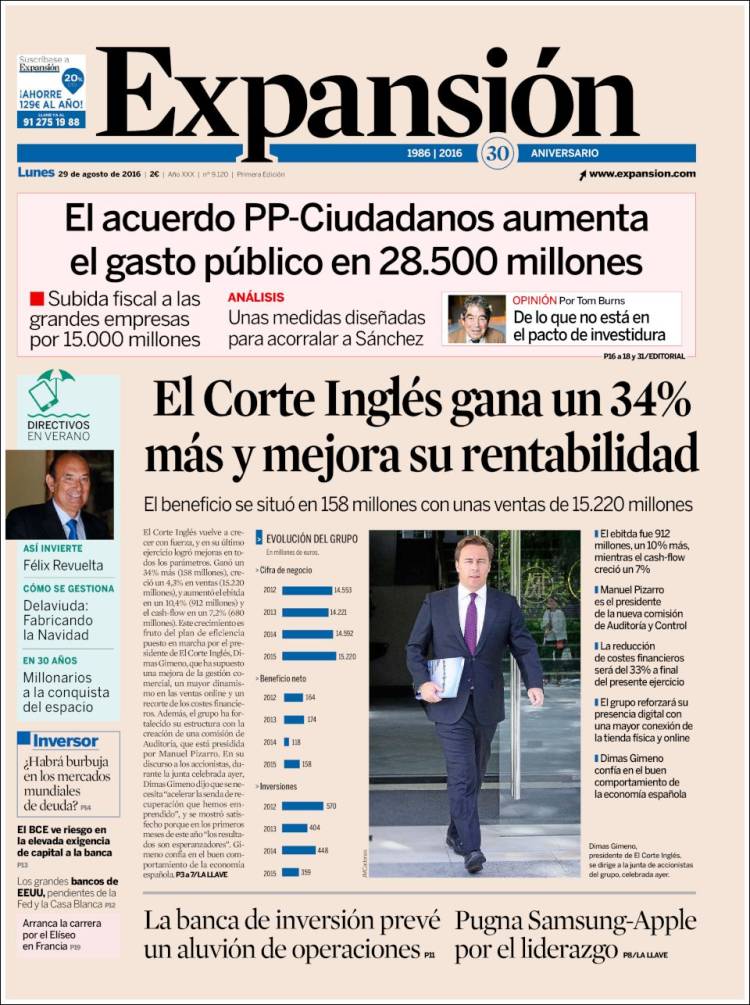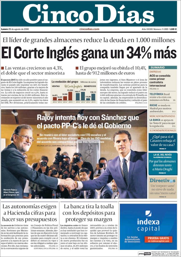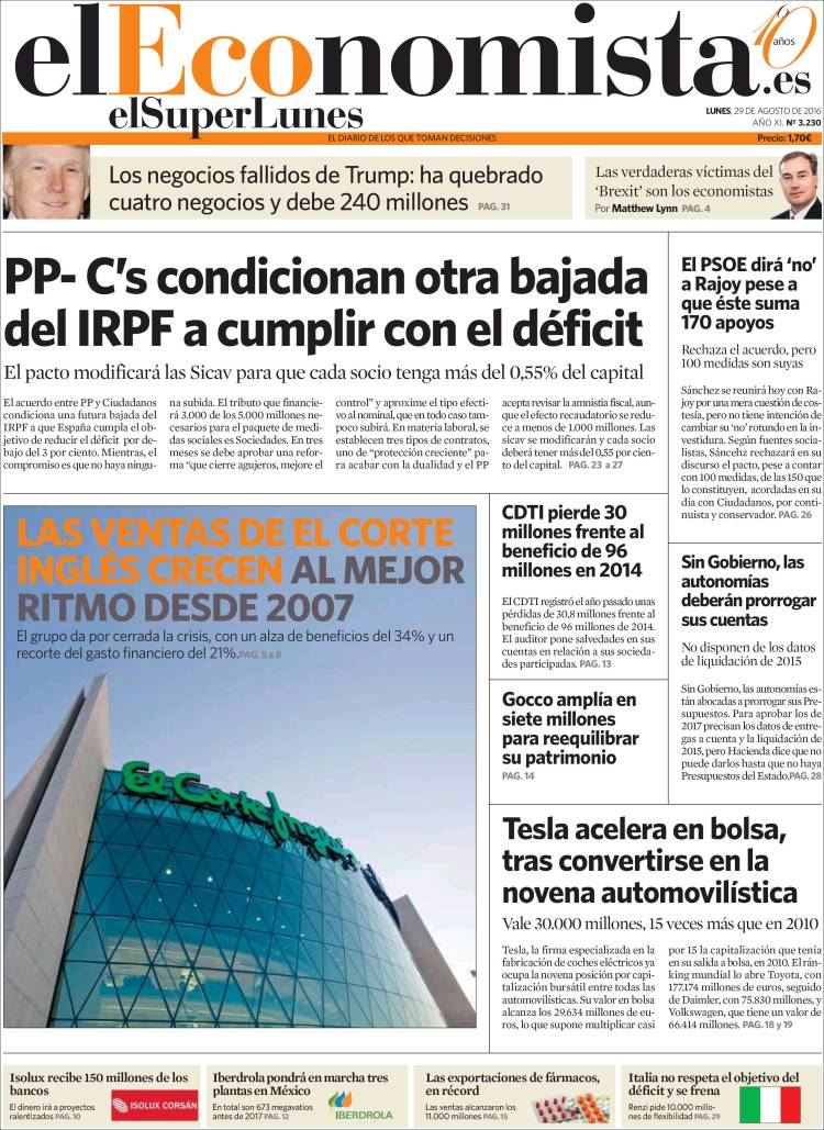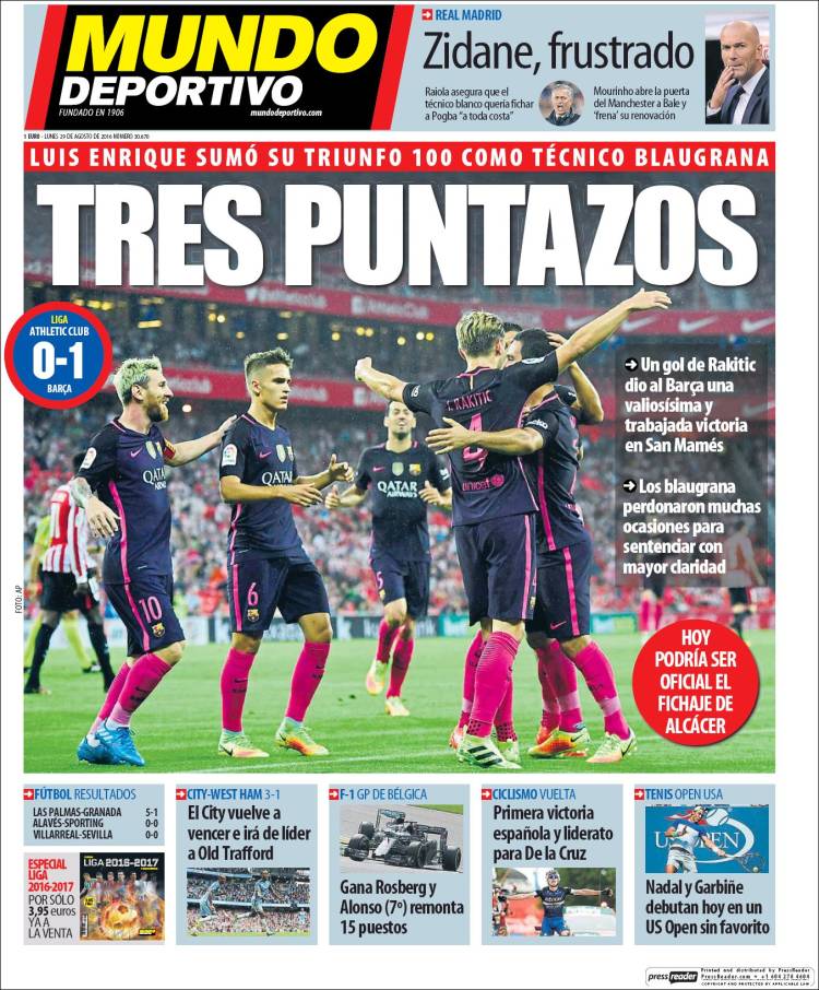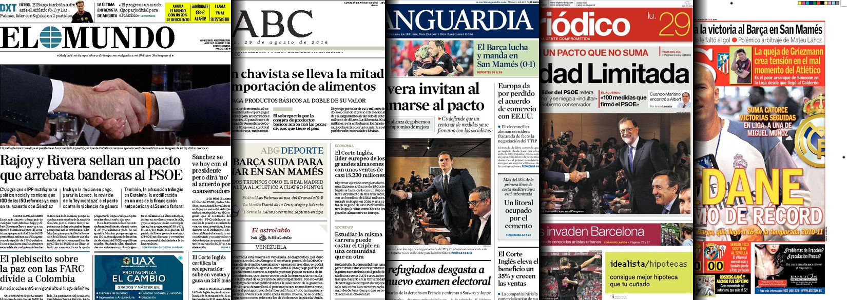 Portadas de los diarios El Mundo, El País, ABC, La Razón, La Vanguardia, El Periódico, Cinco Días, El Economista, Expansión, Marca, As, Mundo Deportivo y Sport.