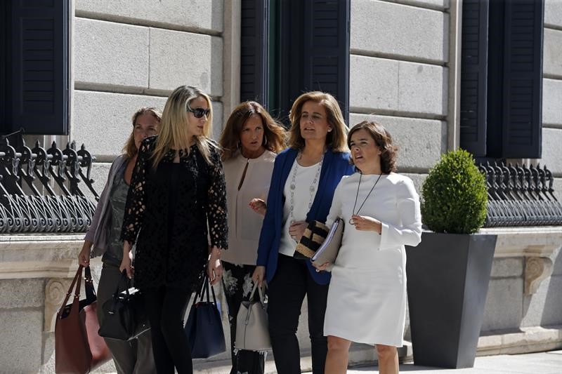 Mariano Rajoy, Soraya Saénz de Santamaría y José Manuel García Margallo durante el discurso de Pedro Sánchez.