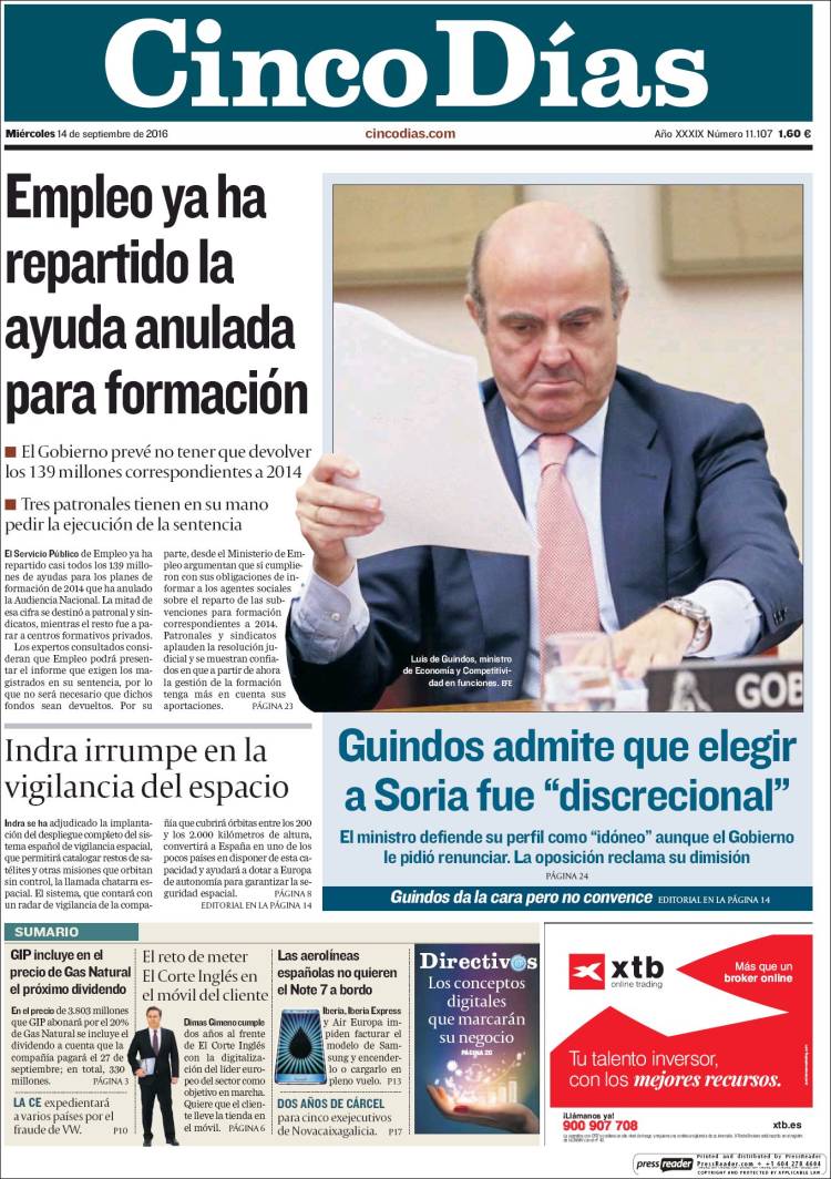 "De Guindos reitera que Soria tenía el perfil 'más adecuado' para el Banco Mundial"