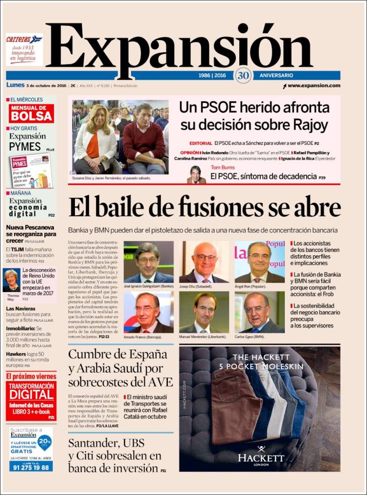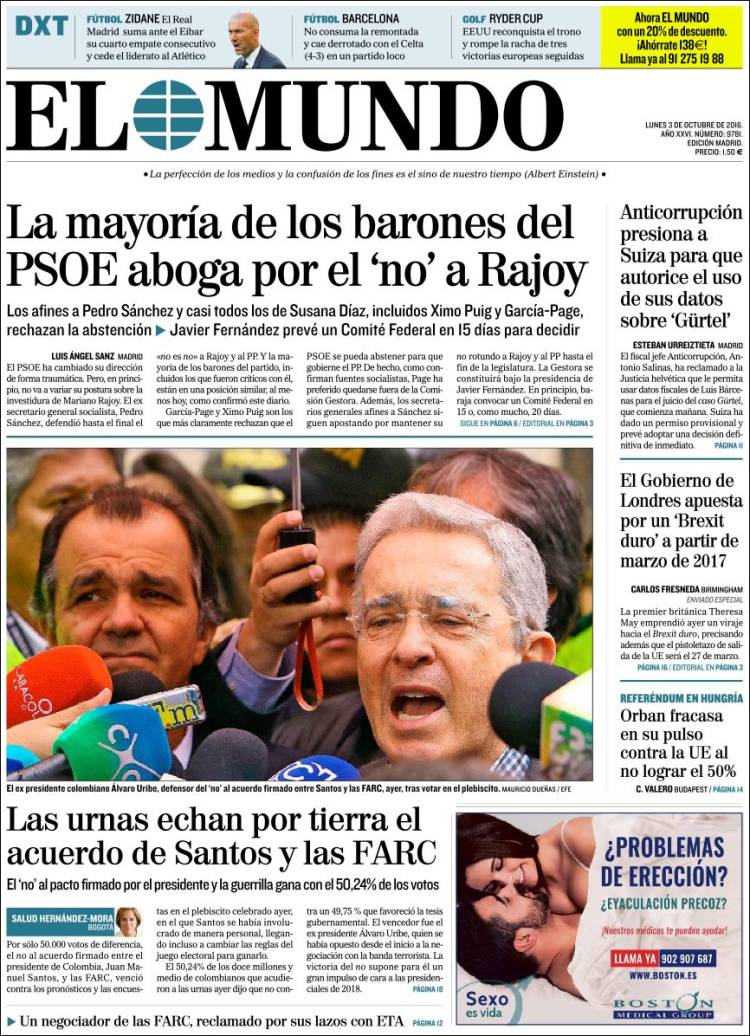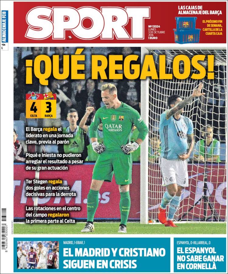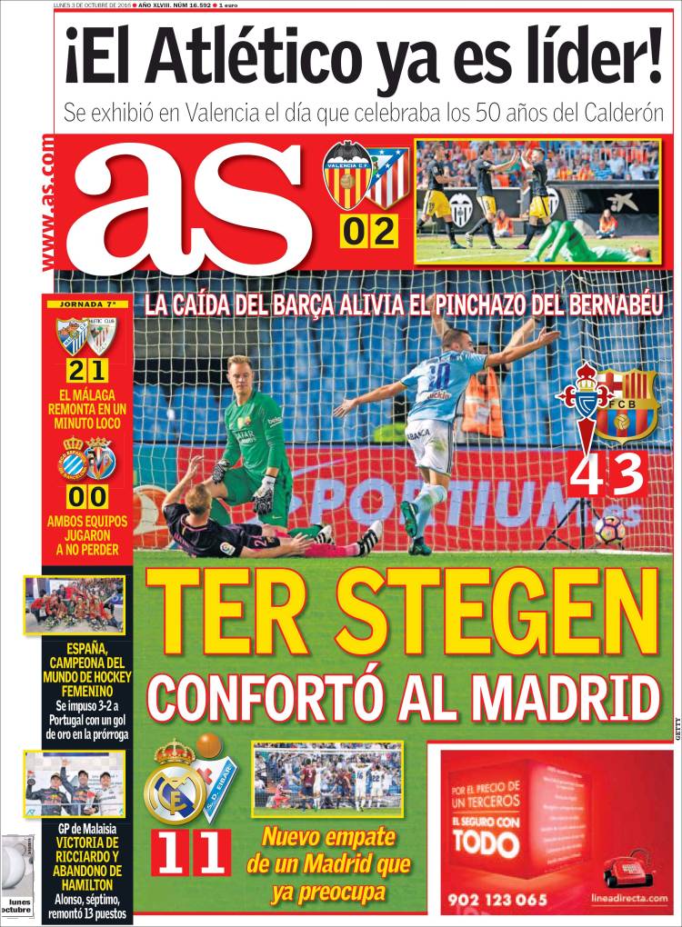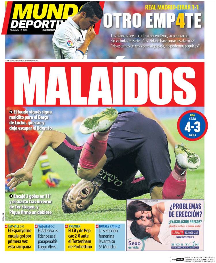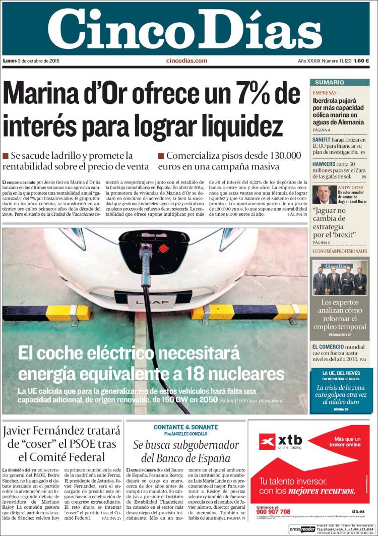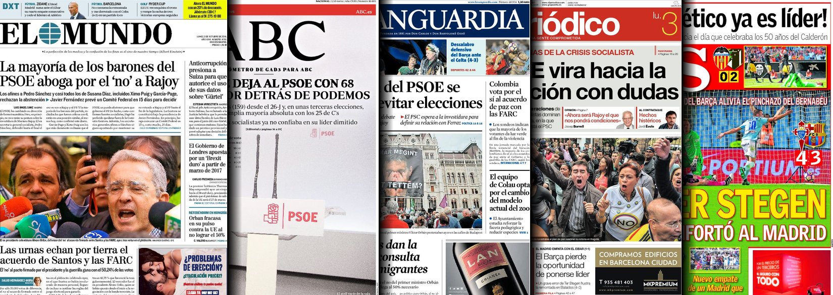 Portadas de los diarios El Mundo, El País, ABC, La Razón, La Vanguardia, Cinco Días, El Economista, Expansión, Marca, As, Mundo Deportivo y Sport.
