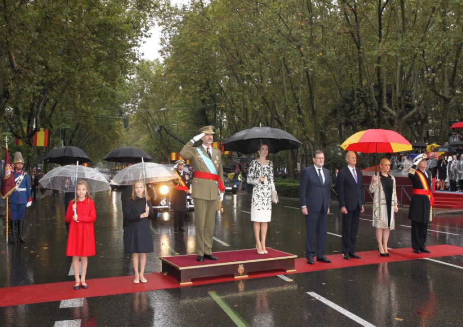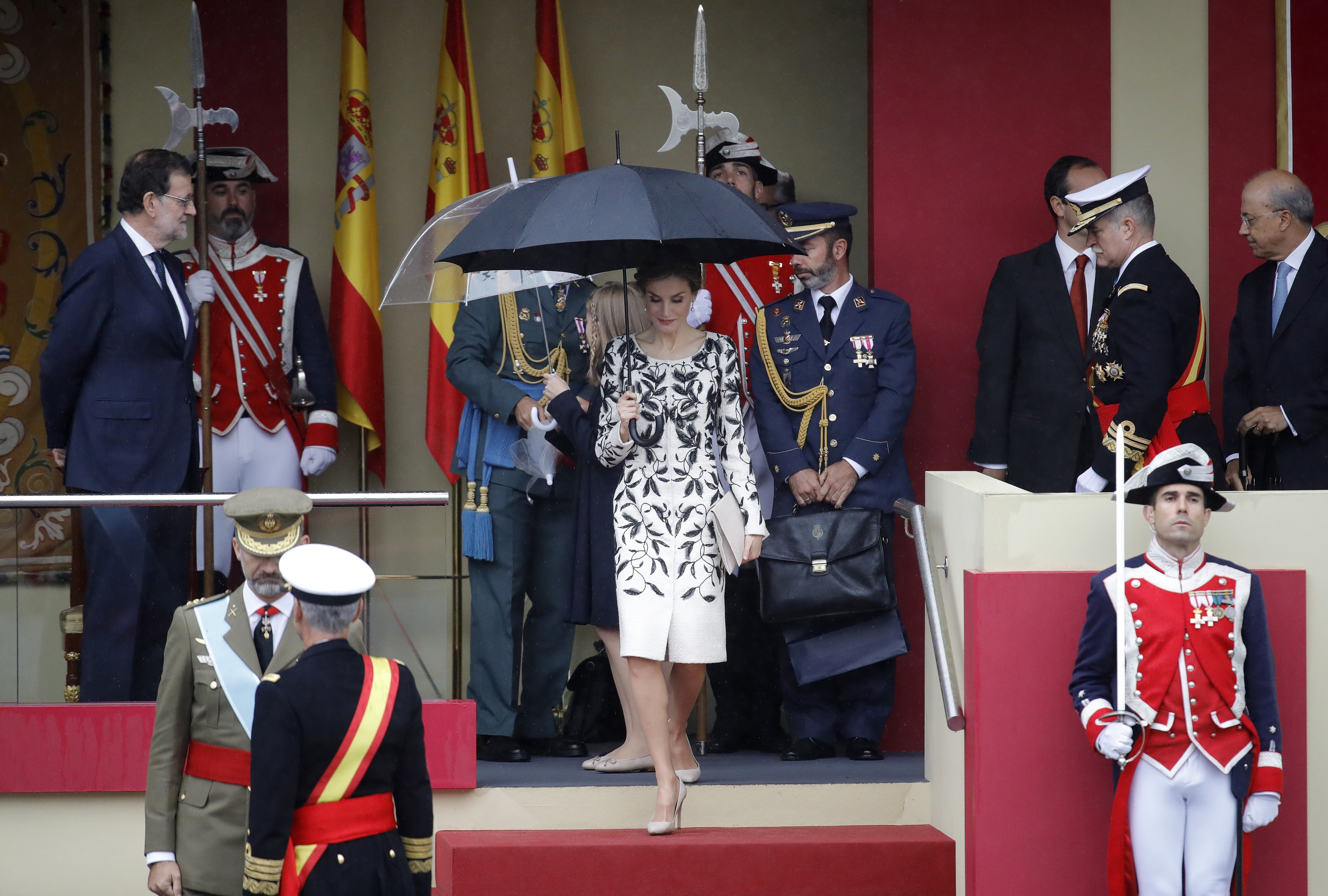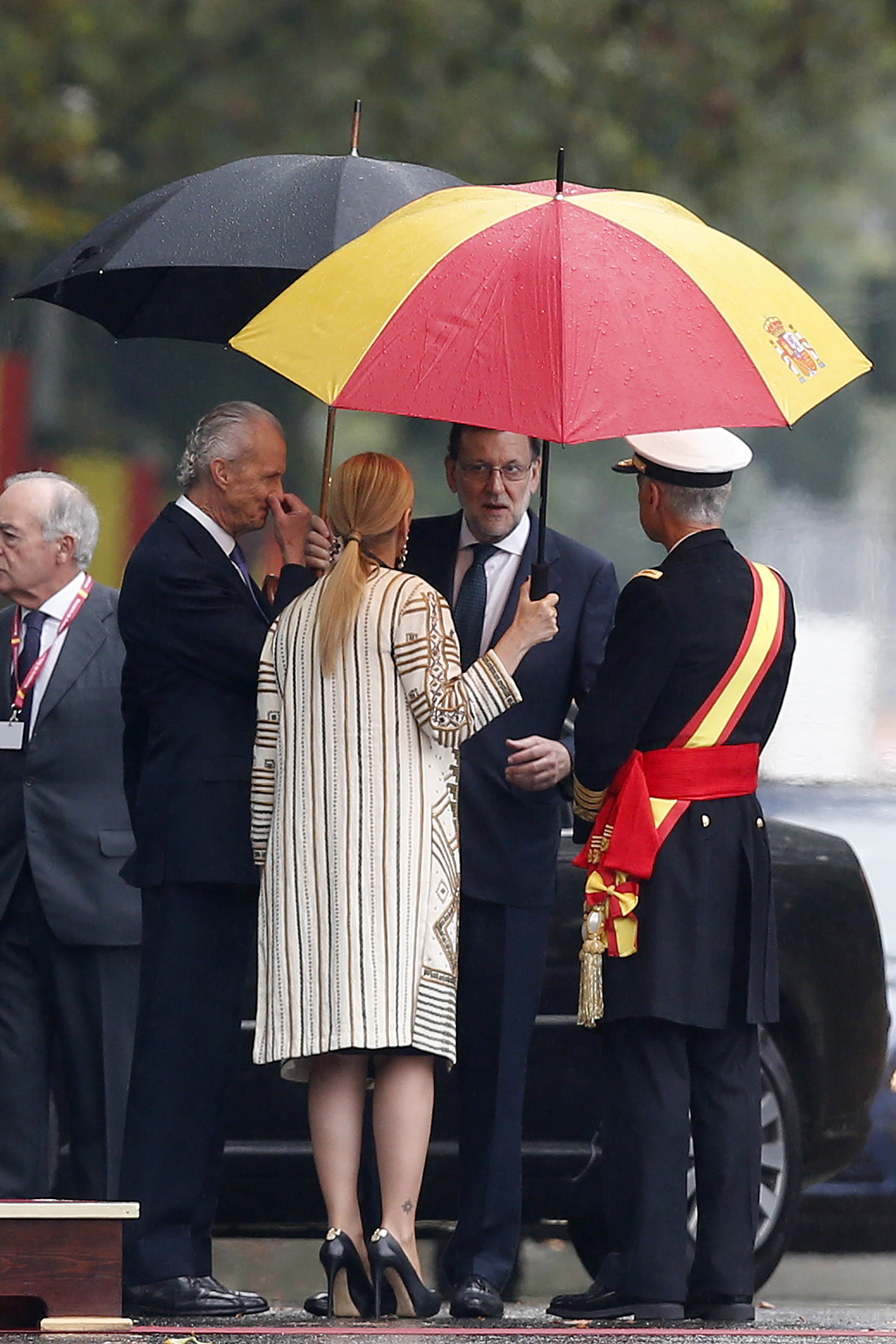 El desfile militar con motivo del Día de la Fiesta Nacional ha estado este año pasado por agua. Cientos de paraguas se desplegaron al paso de las Fuerzas Armadas, pero, sobre todos ellos, uno destacó por encima del resto: el de la presidenta de la Comunidad de Madrid.