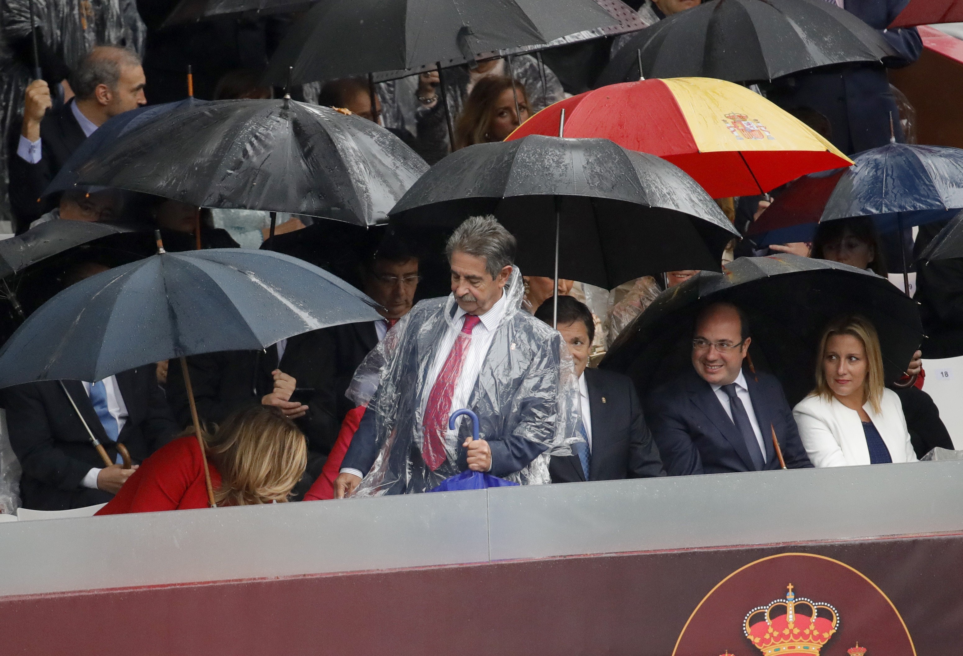 Miguel Ángel Revilla y su chubasquero y el paraguas de Cifuentes sobresalen por encima del resto de autoridades
