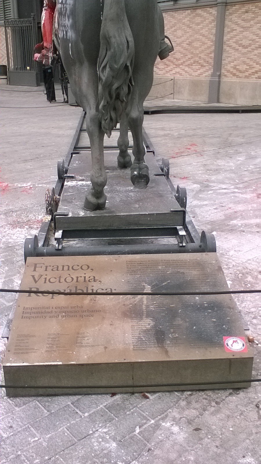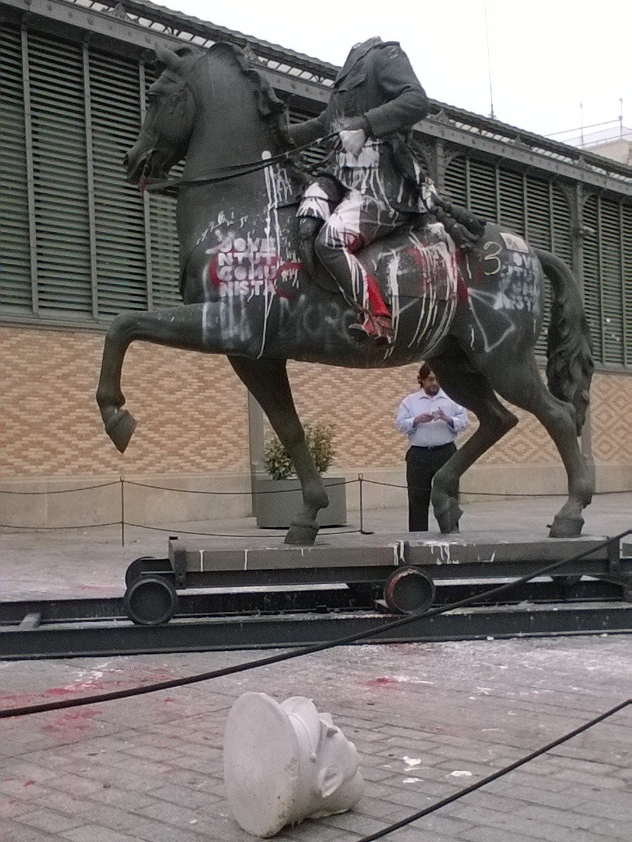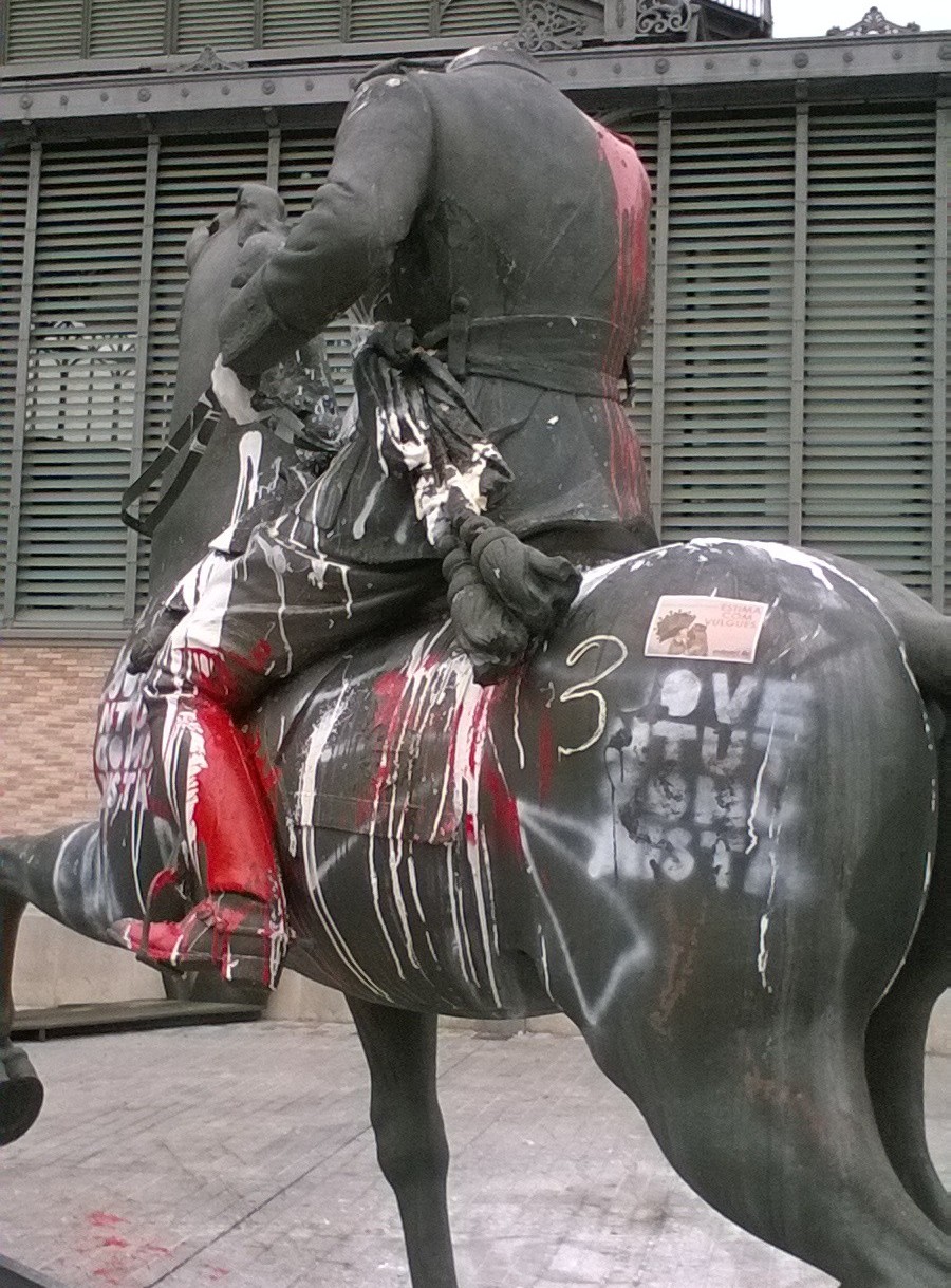 La estatua ecuestre de Franco (sin cabeza) situada en la puerta del Mercado del Borne en Barcelona aparece llena de pintadas, esteladas y huevazos.