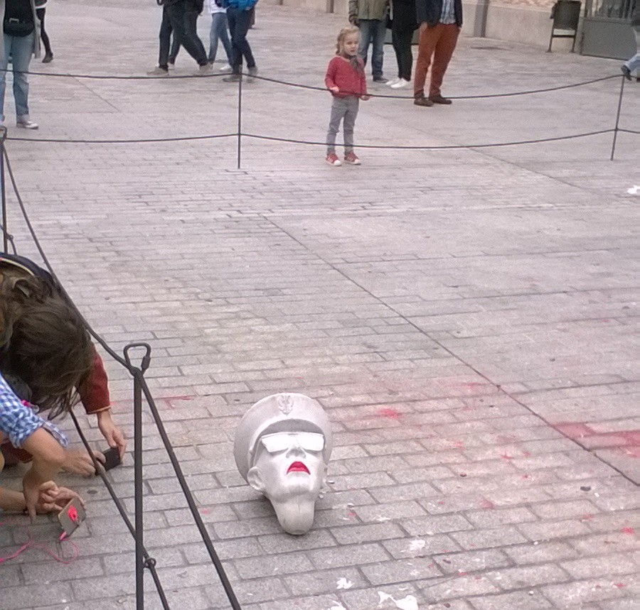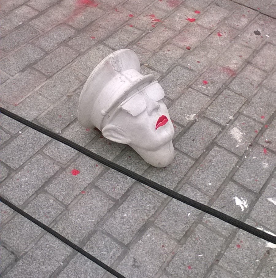 Cabeza de yeso de Franco arrojada junto al conjunto escultórico y con los labios pintados