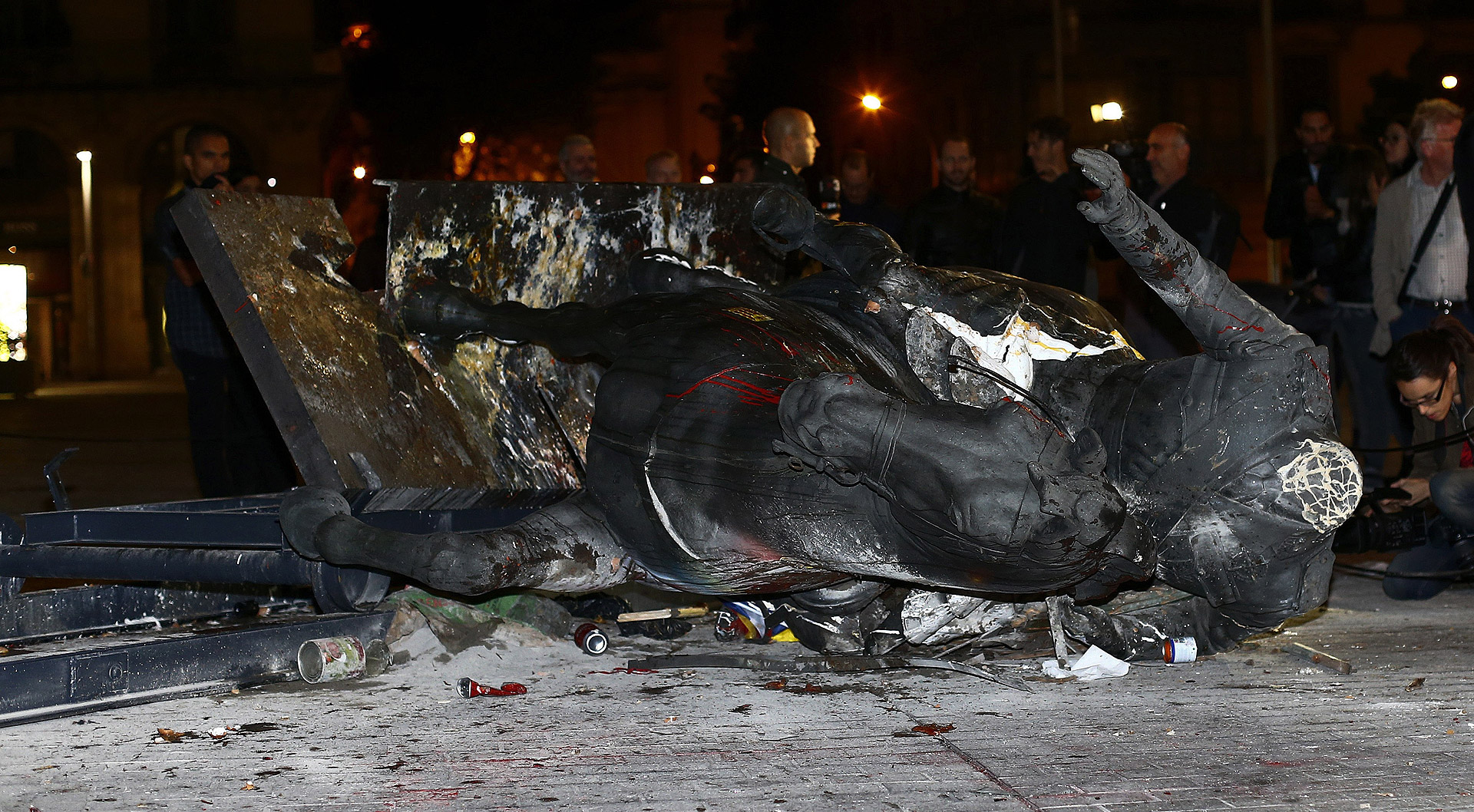 La estatua tumbada, cubierta de pintura y con una bandera arcoiris estelada