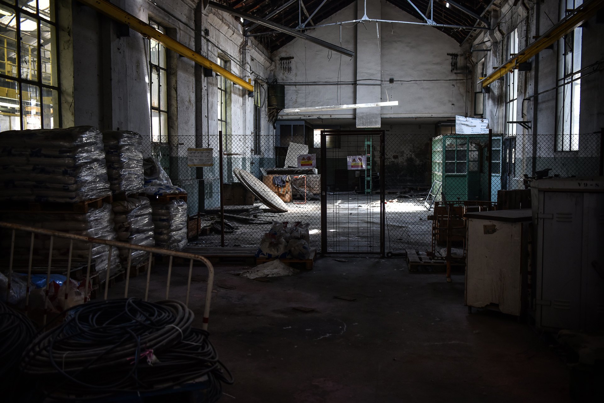 Bobinas de cableado eléctrico depositadas en medio de las intalaciones y de fondo algunas de las naves industriales que en su día mantuvieron un ritmo frenético de trabajo.