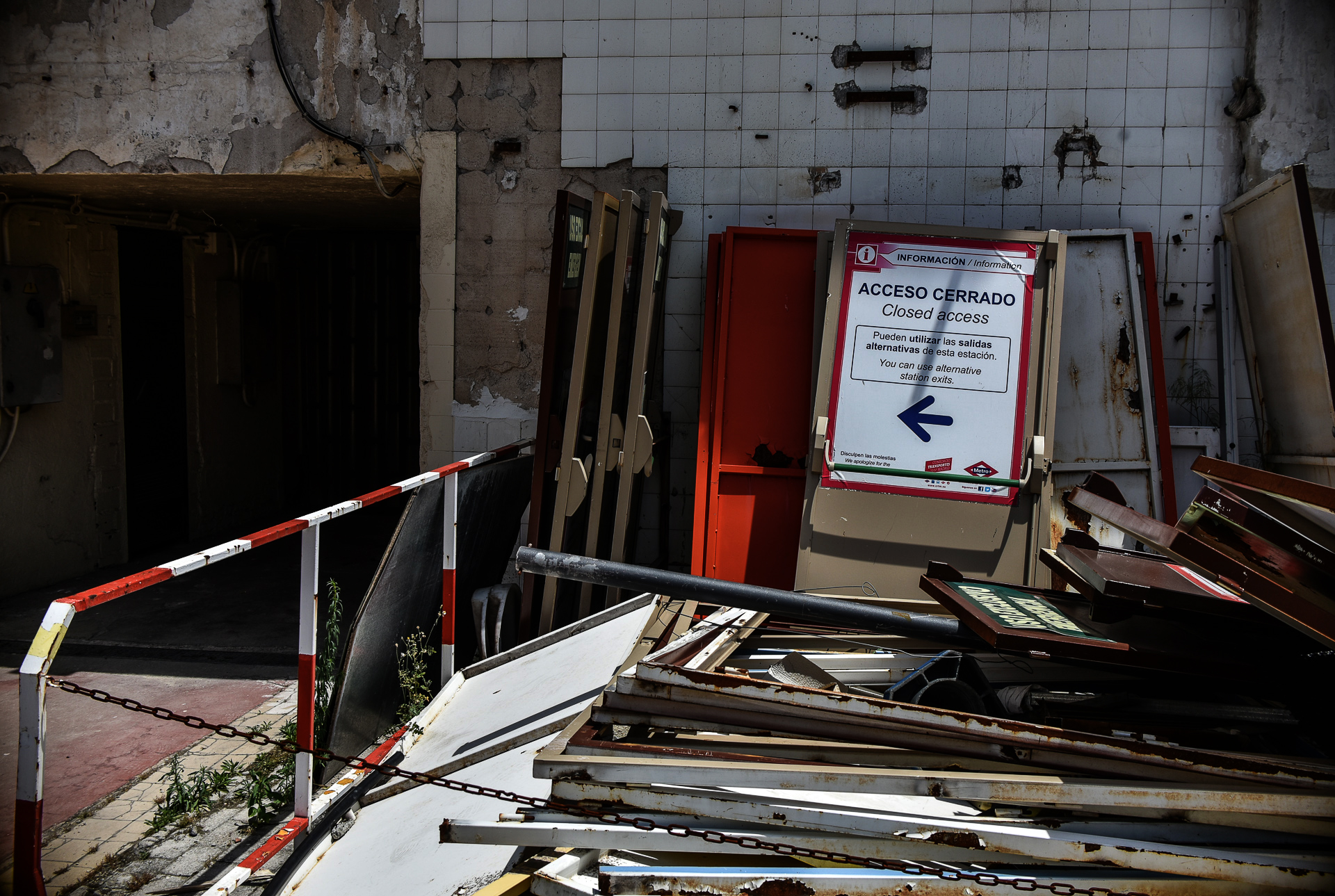 Restos oxidados y olvidados de señales o carteles indicativos de estaciones de metro de Madrid.