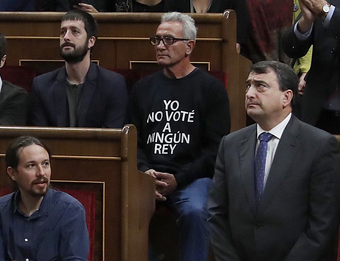 El diputado de Podemos Diego Cañamero, permanece sentado junto al resto de diputados de Podemos ante el discurso del Rey llevando una camiseta-cartel en el que puede leerse "yo no voté a ningún rey"