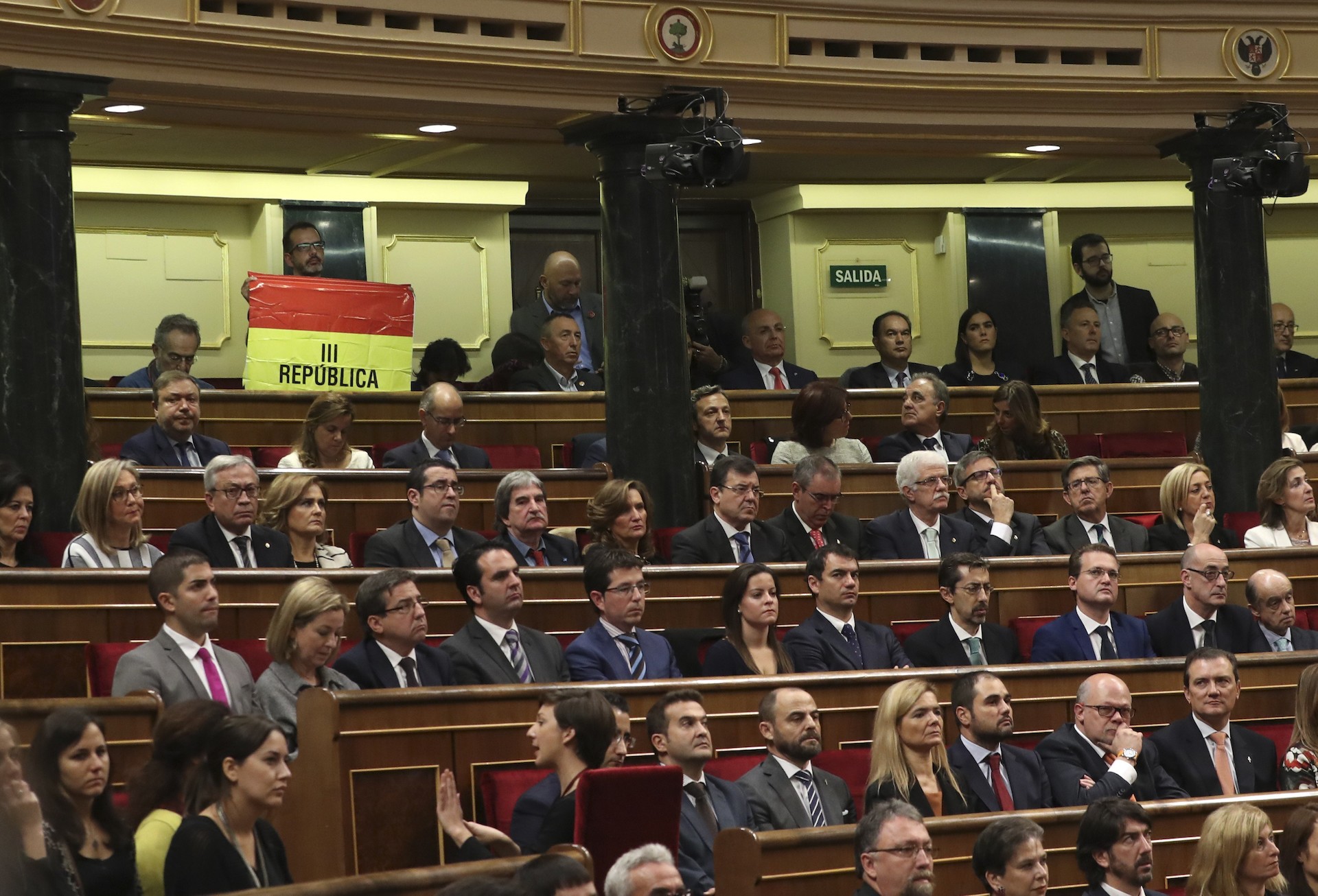La bancada de Podemos permanece sentada y sin aplaudir ante el cierre del discurso del Rey Felipe VI, mientras el resto de diputados del Congreso permanecen de pie. Los nacionalistas de ERC, Convergencia y PNV tampoco aplaudieron a Su Majestad.
