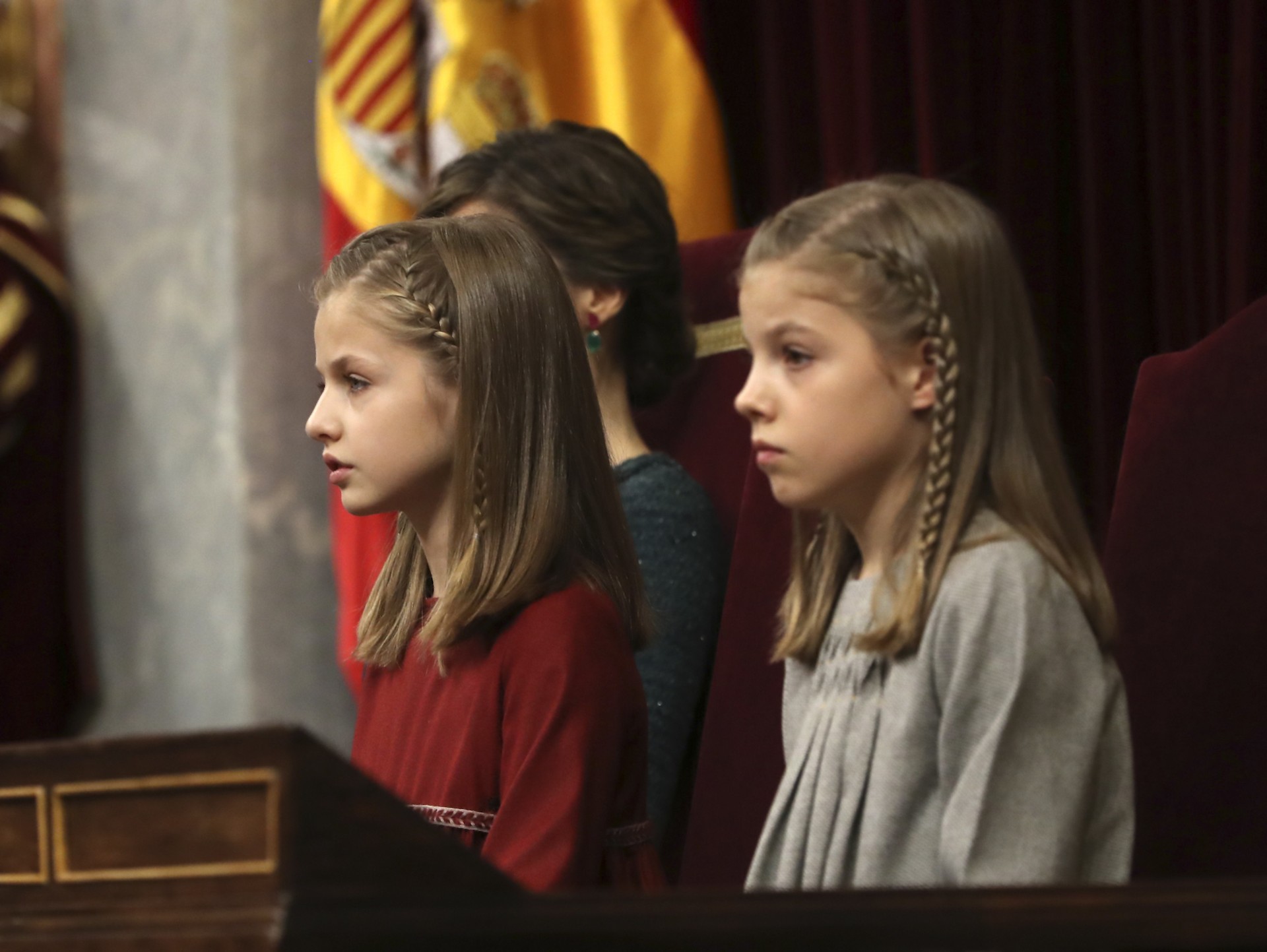 La princesa Leonor y la infanta Sofía, durante la sesión solemne de la apertura de las Cortes en la XII Legislatura, que por primera vez preside el rey Felipe VI, en el Congreso de los Diputados