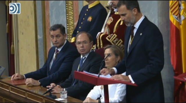 Uno de los senadores de la coalición, Iñaki Bernal, ha portado una bandera republicana mientras el Rey de España pronunciaba el discurso que abría la XII Legislatura.