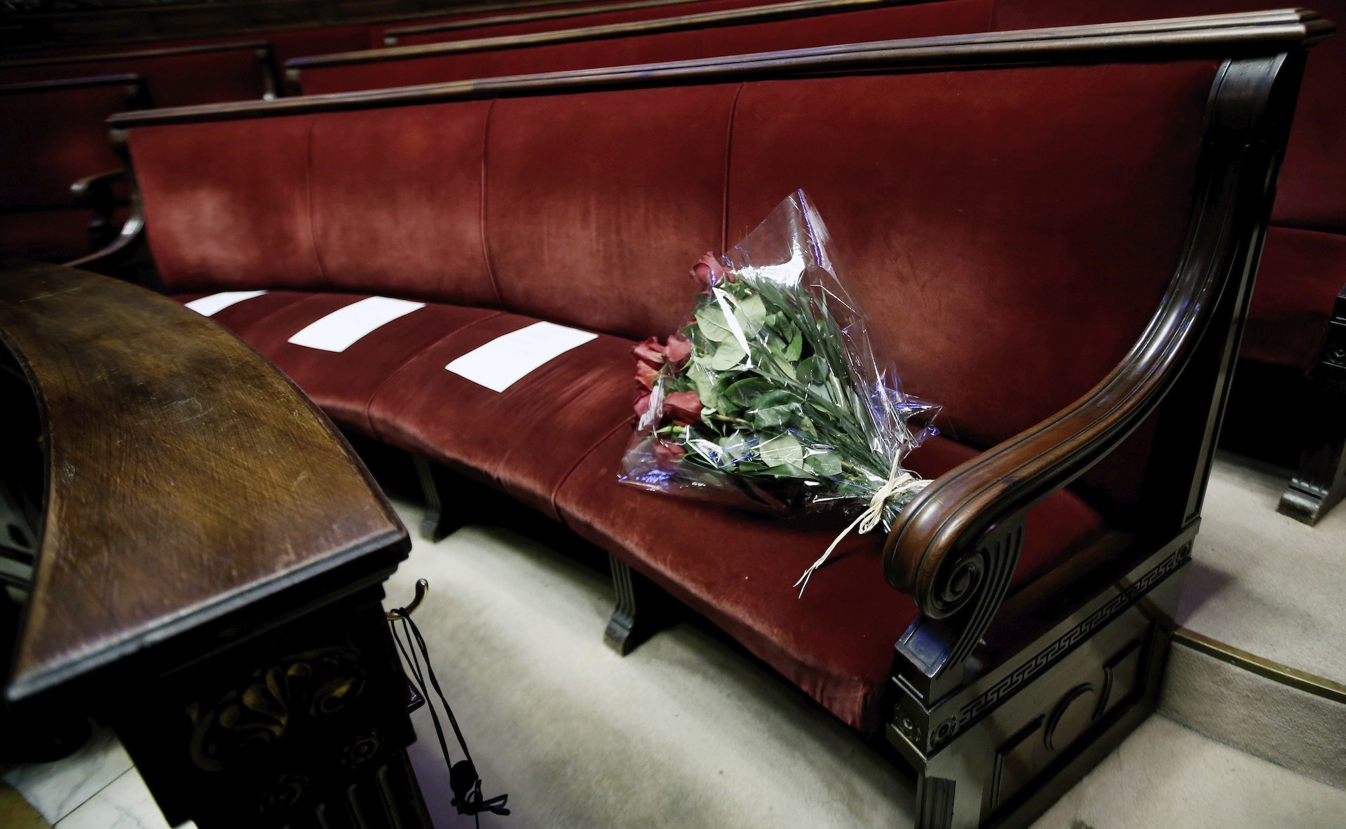 Un ramo de flores recordando a Barberá en el que fue su asiento en el Ayuntamiento de Valencia.