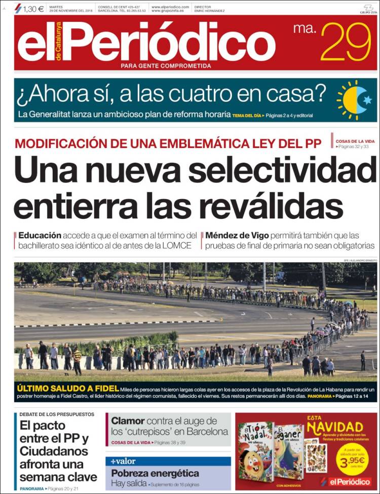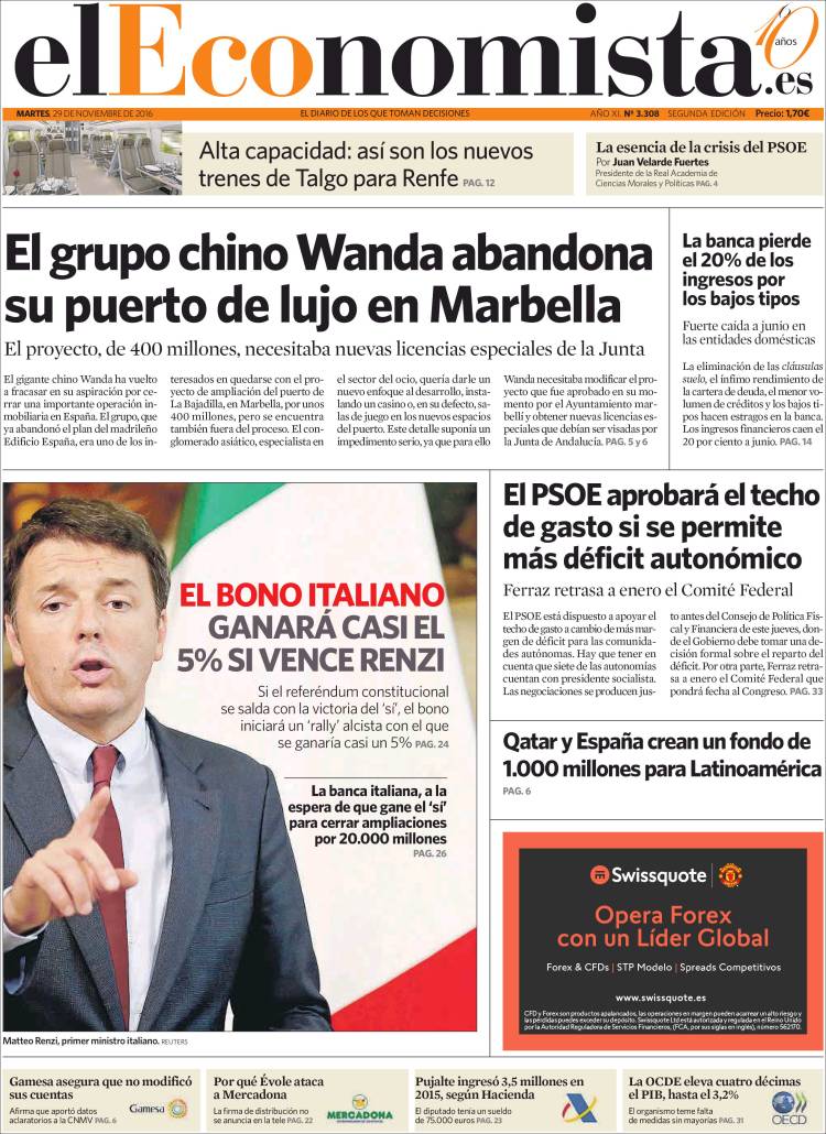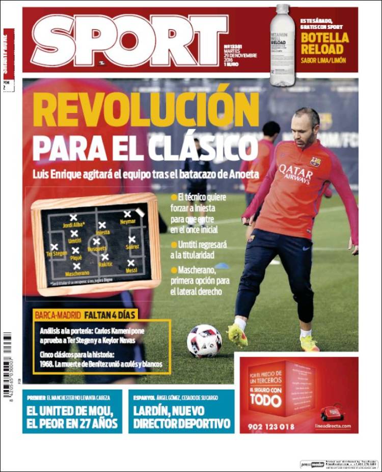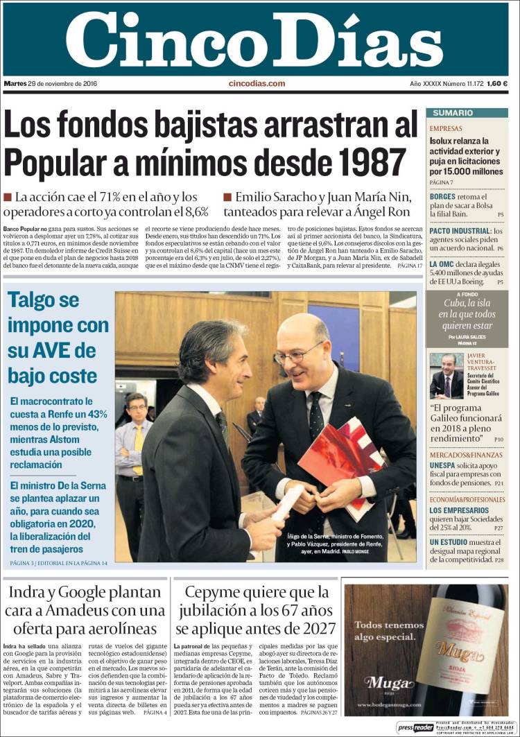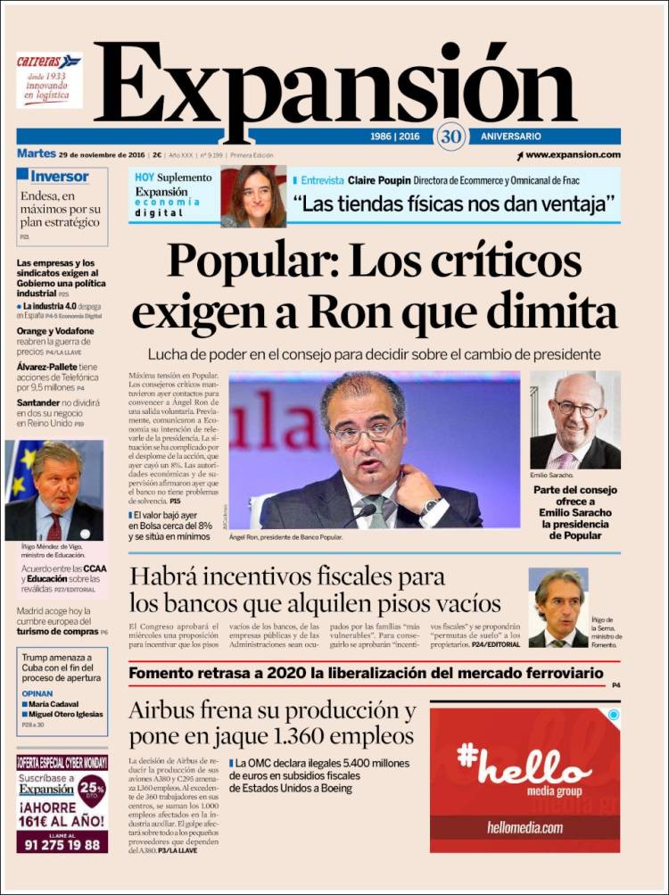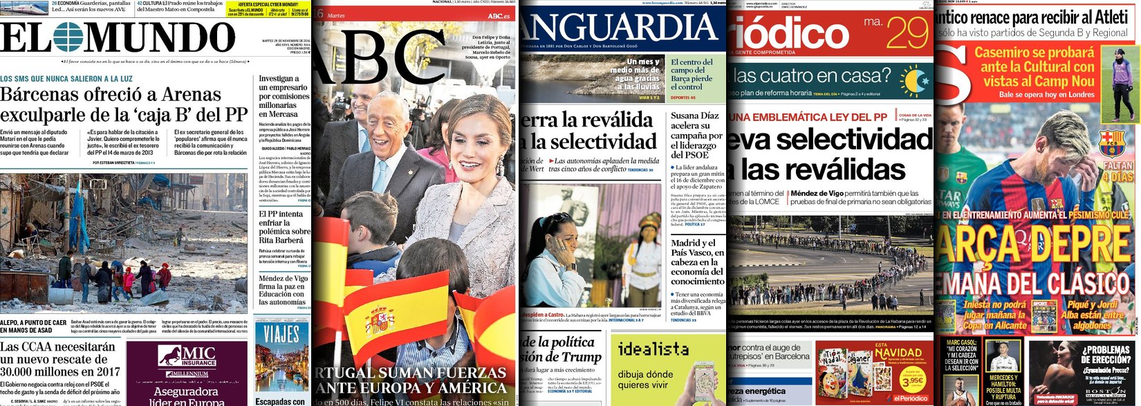 Portadas de los diarios El Mundo, El País, ABC, La Razón, La Vanguardia, El Periódico, Cinco Días, El Economista, Expansión, Marca, As, Mundo Deportivo y Sport.