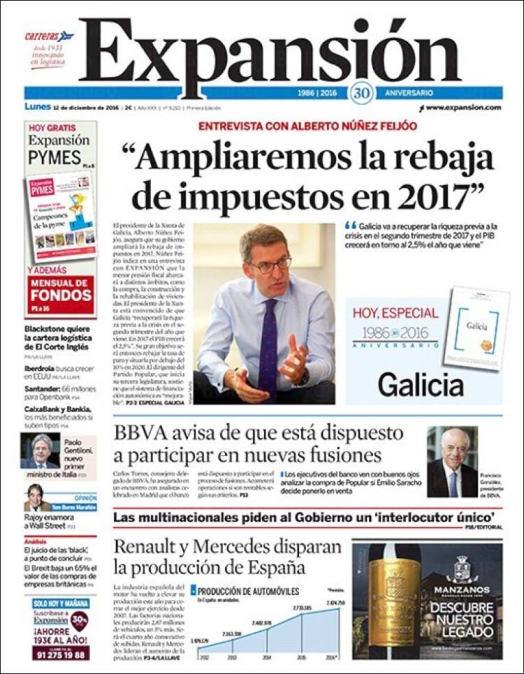 Portadas de los diarios El Mundo, El País, ABC, La Razón, La Vanguardia, El Periódico, Cinco Días, El Economista, Expansión, Marca, As, Mundo Deportivo y Sport.