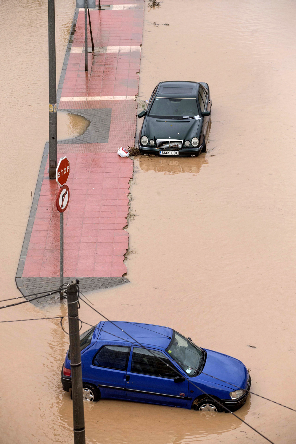 Varios vehículos arrastrados en la rambla del Espinardo (Murcia) por la fuerte lluvia caída, que ha obligado a cortar distintos viales del municipio de Murcia.
