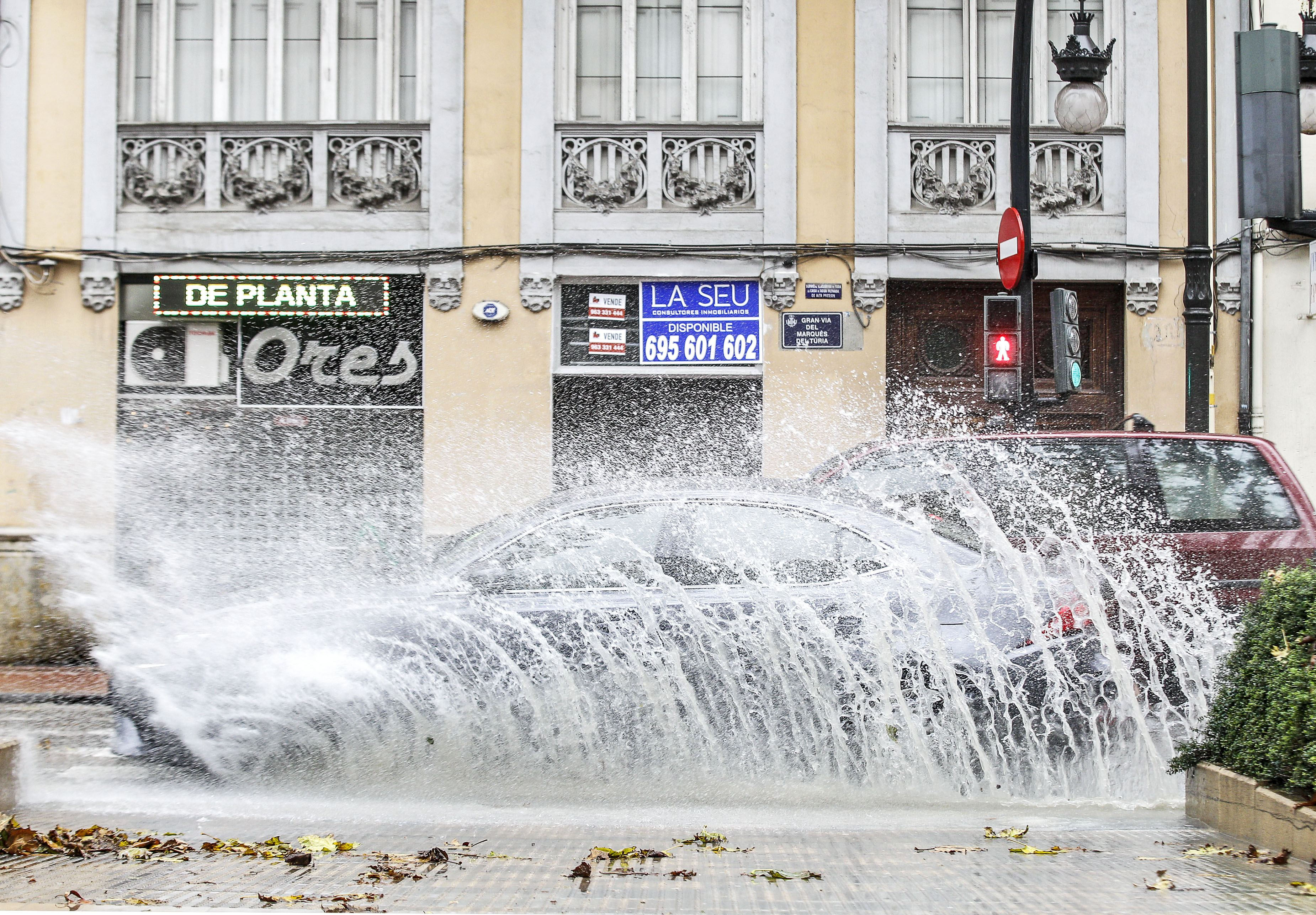 Imagen tomada este mediodía en la avenida Gran Vía Marqués del Turia de Valencia. El frente de lluvias ha dejado en las últimas doce horas acumulados de hasta 74,8 litros por metro cuadrado en el municipio valenciano de Siete Aguas, y rachas de viento de hasta 74 kilómetros por hora en Elche (Alicante)