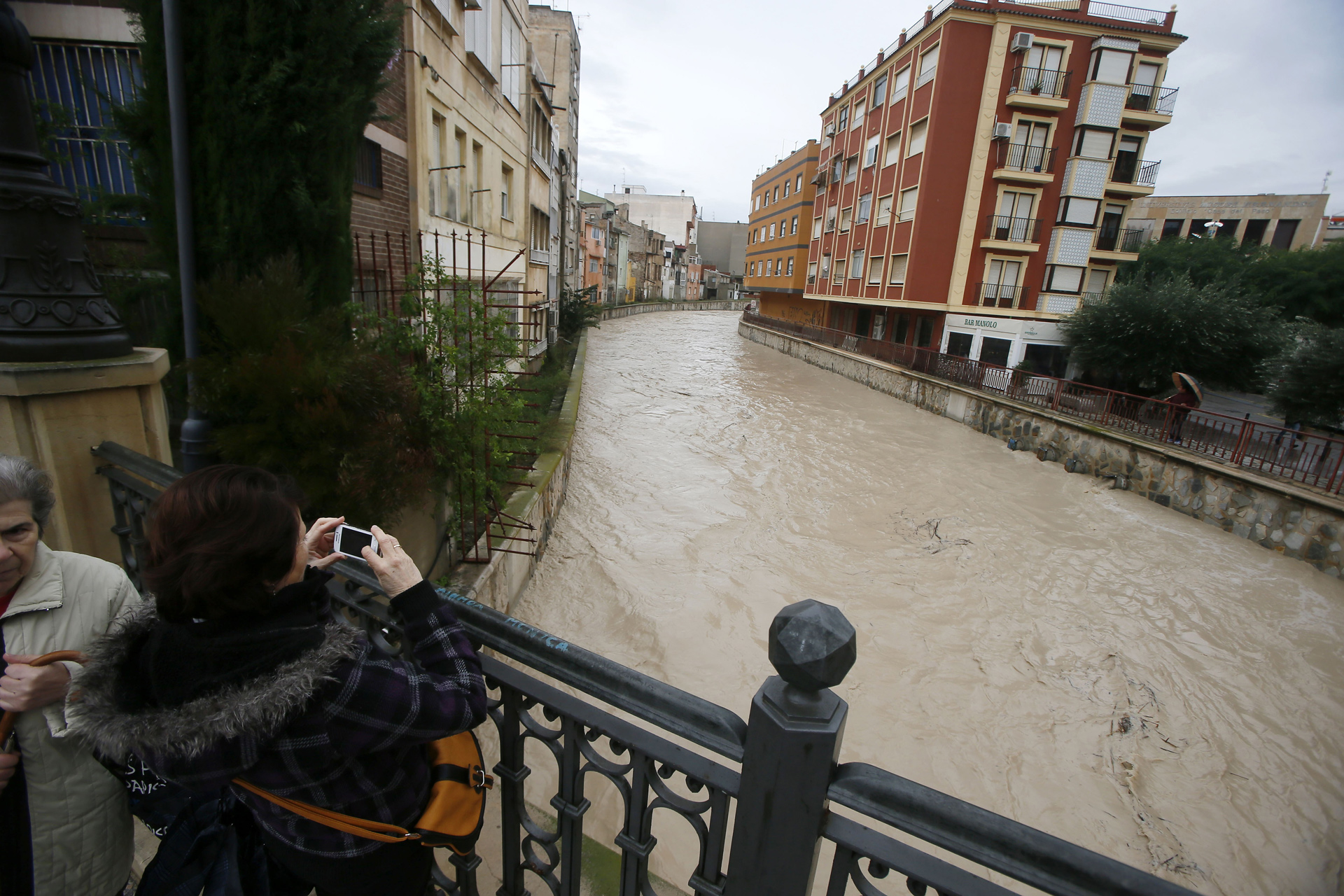 El rio Segura a su paso por Murcia, ha alcanzado los 100 metros cúbicos por segundo, debido a las intensas lluvias que afectan a la Comunidad de Murcia desde el pasado viernes.