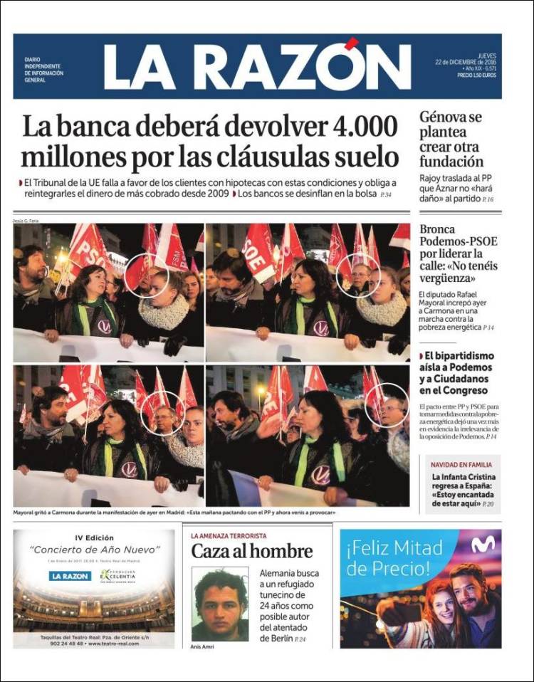 Portadas de los diarios El Mundo, El País, ABC, La Razón, La Vanguardia, El Periódico, Cinco Días, El Economista, Expansión, Marca, Mundo Deportivo y Sport.