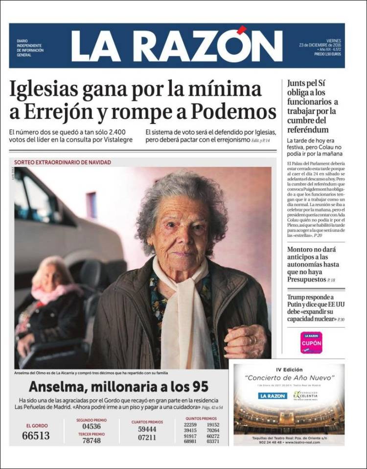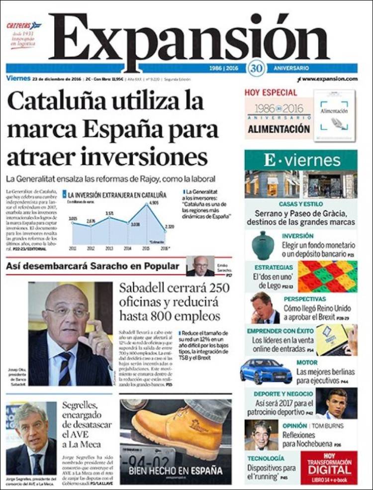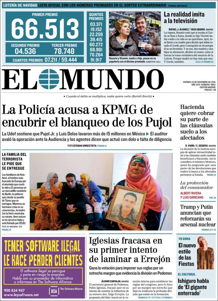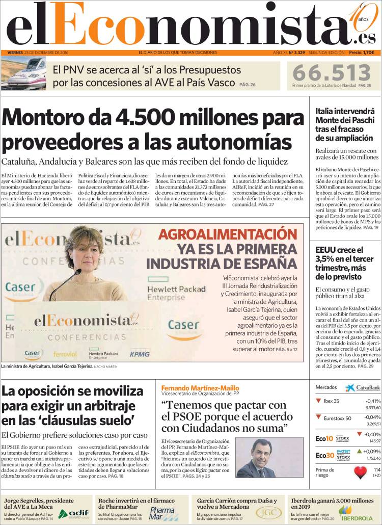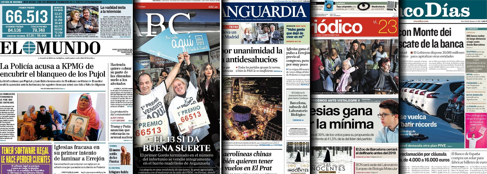Portadas de los diarios El Mundo, El País, ABC, La Razón, La Vanguardia, El Periódico, Cinco Días, El Economista, Expansión, Marca, As, Mundo Deportivo y Sport.