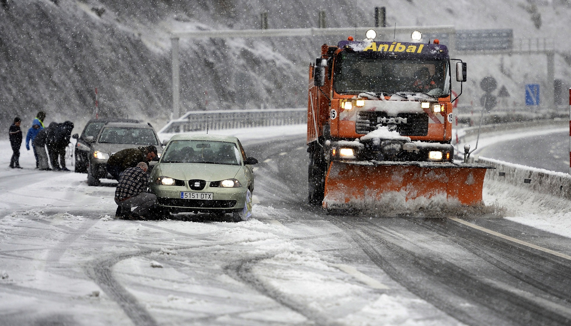 Varios coches ponen cadenas a sus vehículos, en la A-67 a la altura del viaducto de Moltalbiz, en cuya comunidad se encuentran activada la alerta naranja por nevadas y fenómenos costeros adversos